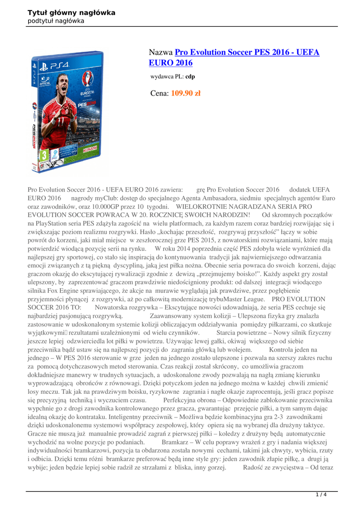 Tytuł główny nagłówka podtytuł nagłówka Nazwa Pro Evolution Soccer PES 2016 - UEFA EURO 2016 wydawca PL: cdp Cena: 109.90 zł Pro Evolution Soccer 2016 - UEFA EURO 2016 zawiera: grę Pro Evolution Soccer 2016 dodatek UEFA EURO 2016 nagrody myClub: dostęp do specjalnego Agenta Ambasadora, siedmiu specjalnych agentów Euro oraz zawodników, oraz 10.000GP przez 10 tygodni. WIELOKROTNIE NAGRADZANA SERIA PRO EVOLUTION SOCCER POWRACA W 20. ROCZNICĘ SWOICH NARODZIN! Od skromnych początków na PlayStation seria PES zdążyła zagościć na wielu platformach, za każdym razem coraz bardziej rozwijając się i zwiększając poziom realizmu rozgrywki. Hasło „kochając przeszłość, rozgrywaj przyszłość” łączy w sobie powrót do korzeni, jaki miał miejsce w zeszłorocznej grze PES 2015, z nowatorskimi rozwiązaniami, które mają potwierdzić wiodącą pozycję serii na rynku. W roku 2014 poprzednia część PES zdobyła wiele wyróżnień dla najlepszej gry sportowej, co stało się inspiracją do kontynuowania tradycji jak najwierniejszego odtwarzania emocji związanych z tą piękną dyscypliną, jaką jest piłka nożna. Obecnie seria powraca do swoich korzeni, dając graczom okazję do ekscytującej rywalizacji zgodnie z dewizą „przejmujemy boisko!”. Każdy aspekt gry został ulepszony, by zaprezentować graczom prawdziwie niedościgniony produkt: od dalszej integracji wiodącego silnika Fox Engine sprawiającego, że akcje na murawie wyglądają jak prawdziwe, przez pogłębienie przyjemności płynącej z rozgrywki, aż po całkowitą modernizację trybuMaster League. PRO EVOLUTION SOCCER 2016 TO: Nowatorska rozgrywka – Ekscytujące nowości udowadniają, że seria PES cechuje się najbardziej pasjonującą rozgrywką. Zaawansowany system kolizji – Ulepszona fizyka gry znalazła zastosowanie w udoskonalonym systemie kolizji obliczającym oddziaływania pomiędzy piłkarzami, co skutkuje wyjątkowymi rezultatami uzależnionymi od wielu czynników. Starcia powietrzne – Nowy silnik fizyczny jeszcze lepiej odzwierciedla lot piłki w powietrzu. Używając lewej gałki, okiwaj większego od siebie przeciwnika bądź ustaw się na najlepszej pozycji do zagrania główką lub wolejem. Kontrola jeden na jednego – W PES 2016 sterowanie w grze jeden na jednego zostało ulepszone i pozwala na szerszy zakres ruchu za pomocą dotychczasowych metod sterowania. Czas reakcji został skrócony, co umożliwia graczom dokładniejsze manewry w trudnych sytuacjach, a udoskonalone zwody pozwalają na nagłą zmianę kierunku wyprowadzającą obrońców z równowagi. Dzięki potyczkom jeden na jednego można w każdej chwili zmienić losy meczu. Tak jak na prawdziwym boisku, ryzykowne zagrania i nagłe okazje zaprocentują, jeśli gracz popisze się precyzyjną techniką i wyczuciem czasu. Perfekcyjna obrona – Odpowiednie zablokowanie przeciwnika wypchnie go z drogi zawodnika kontrolowanego przez gracza, gwarantując przejęcie piłki, a tym samym dając idealną okazję do kontrataku. Inteligentny przeciwnik – Możliwa będzie kombinacyjna gra 2-3 zawodnikami dzięki udoskonalonemu systemowi współpracy zespołowej, który opiera się na wybranej dla drużyny taktyce. Gracze nie muszą już manualnie prowadzić zagrań z pierwszej piłki – koledzy z drużyny będą automatycznie wychodzić na wolne pozycje po podaniach. Bramkarz – W celu poprawy wrażeń z gry i nadania większej indywidualności bramkarzowi, pozycja ta obdarzona została nowymi cechami, takimi jak chwyty, wybicia, rzuty i odbicia. Dzięki temu różni bramkarze preferować będą inne style gry: jeden zawodnik złapie piłkę, a drugi ją wybije; jeden będzie lepiej sobie radził ze strzałami z bliska, inny gorzej. Radość ze zwycięstwa – Od teraz 1/4 Tytuł główny nagłówka podtytuł nagłówka gracze będą mieli pełną kontrolę nad tym, jak zawodnik okazuje radość ze strzelonego gola! Możliwe będzie bardzo łatwe wybranie typowej dla danego piłkarza reakcji bądź innych sposobów na uczczenie sukcesu. Fundamentalne zmiany – Znaczące udoskonalenia wszystkich trybów i aspektów rozgrywki. Tryb Master League – Znany i niezwykle popularny tryb Master League poddany został kompletnej modernizacji, by pozwolić graczom jeszcze lepiej wczuć się w rolę menadżera piłkarskiego. Wszystko zostało opracowane na nowo, od interfejsu po system transferów, sprawiając, że ten kultowy tryb gry jednoosobowej stał się jeszcze bardziej fascynujący. Udoskonalona grafika – PES 2016 w pełni wykorzystuje możliwości silnika Fox Engine, dzięki czemu będzie można podziwiać krople deszczu pryskające na boki podczas ślizgu czy fragmenty murawy wyrzucone razem z wybitą piłką. Nowy system oświetlenia nocnego i realistyczne tekstury murawy to tylko niektóre z licznych nowinek graficznych. Dynamiczna pogoda – Po raz pierwszy w serii PES pojawi się dynamiczny system pogodowy, łącznie z możliwością, że deszcz zacznie padać dopiero w trakcie meczu. Dzięki realistycznej fizyce zachowania się piłki deszcz będzie zmieniał sytuację na murawie, przyspieszając podania i powodując problemy z zatrzymaniem piłki u mniej doświadczonych zawodników. Piłkarze będą również bardziej narażeni na poślizgi i upadki. Zmiany pogody pojawiać się będą we wszystkich trybach offline, także w Master League, niejeden raz w znaczący sposób wpływając na wynik meczu. Realistyczne poruszanie się – Aby poruszanie się zawodników prezentowało się jeszcze lepiej, potrojona została liczba animacji zawartych w grze. Bramkarze obdarzeni zostali mnóstwem akcji obronnych, zaś gracze pola będą w zależności od sytuacji na rozmaite sposoby strzelać, podawać, dryblować i blokować. Oprócz tego, piłkarze narzekają na decyzje sędziego i pomstują na kolegów z drużyny, gdy ci nie podają piłki. Korzysta na tym również nowy system rozgrywki jeden na jednego: gracze mogą