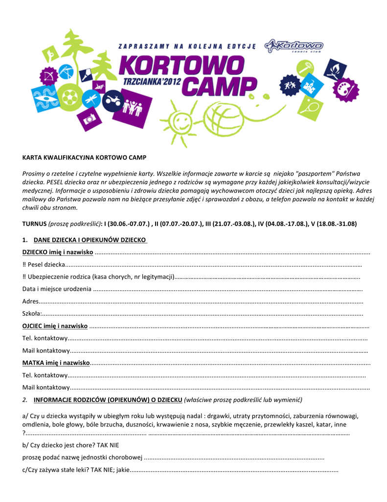 KARTA KWALIFIKACYJNA KORTOWO CAMP Prosimy o rzetelne i czytelne wypełnienie karty. Wszelkie informacje zawarte w karcie są niejako "paszportem" Państwa dziecka. PESEL dziecka oraz nr ubezpieczenia jednego z rodziców są wymagane przy każdej jakiejkolwiek konsultacji/wizycie medycznej. Informacje o usposobieniu i zdrowiu dziecka pomagają wychowawcom otoczyć dzieci jak najlepszą opieką. Adres mailowy do Państwa pozwala nam na bieżące przesyłanie zdjęć i sprawozdań z obozu, a telefon pozwala na kontakt w każdej chwili obu stronom. TURNUS (proszę podkreślić): I (30.06.-‐07.07.) , II (07.07.-‐20.07.), III (21.07.-‐03.08.), IV (04.08.-‐17.08.), V (18.08.-‐31.08) 1. DANE DZIECKA I OPIEKUNÓW DZIECKO DZIECKO imię i nazwisko ............................................................................................................................................................. ‼ Pesel dziecka.................................................................................................................................................................……… ‼ Ubezpieczenie rodzica (kasa chorych, nr legitymacji)…………………………………………………………………………………………………….. Data i miejsce urodzenia ................................................................................................................................………………………. Adres......................................................................................................................................................................................... Szkoła:....................................................................................................................................................................................... OJCIEC imię i nazwisko ..............................................................................................……………………………………………………………… Tel. kontaktowy........................................................................................................................................................................... Mail kontaktowy...............................................................................................................................................................………… MATKA imię i nazwisko................................................................................................................................................................ Tel. kontaktowy.......................................................................................................................................................................... Mail kontaktowy........................................................................................................................................................................... 2. INFORMACJE RODZICÓW (OPIEKUNÓW) O DZIECKU (właściwe proszę podkreślić lub wymienić) a/ Czy u dziecka wystąpiły w ubiegłym roku lub występują nadal : drgawki, utraty przytomności, zaburzenia równowagi, omdlenia, bole głowy, bóle brzucha, duszności, krwawienie z nosa, szybkie męczenie, przewlekły kaszel, katar, inne ?..................................................................... ……………………………………………………………………………………………………………… b/ Czy dziecko jest chore? TAK NIE proszę podać nazwę jednostki chorobowej ....................................................................................................... c/Czy zażywa stałe leki? TAK NIE; jakie....................................................................................................................... d/Czy dziecko jest uczulone? TAK NIE, na co............................................................................................................. f/Przebyte choroby :odra ........ospa ........różyczka .........świnka ........żółtaczka zakaźna ......... choroby reumatyczne ..........choroby nerek ..........astma ..........padaczka ...........inne.............................................. g/ Dziecko jest bardzo wrażliwe, nieśmiałe, wycofane, ma trudności w nawiązywaniu kontaktów, ma trudności w zasypianiu, boi się ciemności, inne ?………………………………………………………………………………………………………………………………………………….. h/ Dziecko bywa nadpobudliwe, jest bardzo żywe, ma kłopoty z panowaniem nad emocjami ? i/ Dziecko nosi okulary, szkła kontaktowe, aparat ortodontyczny, aparat słuchowy, wkładki ortopedyczne, ma podwyższony obcas buta,, używa inhalatora, inne? .................................................................................................................................... j/ Potwierdzam, że dziecko otrzymało wszystkie obowiązkowe dotychczasowe szczepienia TAK NIE k/ Czy dziecko ma jakieś przeciwskazania do uprawiania sportu? TAK NIE, jeśli tak, jakie………………………………………..……………………………………………………………………………………………………………………… l/ Czy dziecko jest pierwszy raz na obozie? TAK NIE m/ Czy dziecko będzie posiadało telefon komórkowy TAK NIE (dzieci dostają swoje tel. na pół h po kolacji jeśli tylko chcą, jeżeli dziecko nie ma aparatu prosimy co jakiś czas zgodnie z potrzebą o telefon do wychowawcy – podamy słuchawkę :) m/ Inne istotne informacje o dziecku ? (np. arachnofobia, lunatykowanie, za nic nie zje mięsa polanego sosem, zdarzały się problemy z moczeniem i się tego obawia, ale także niedawny rozwód rodziców, choroba, śmierć kogoś bliskiego, zmiana szkoły mogą wpływać na samopoczucie i zachowanie – wszelkie informacje jakimi zechcą Państwo podzielić się z n