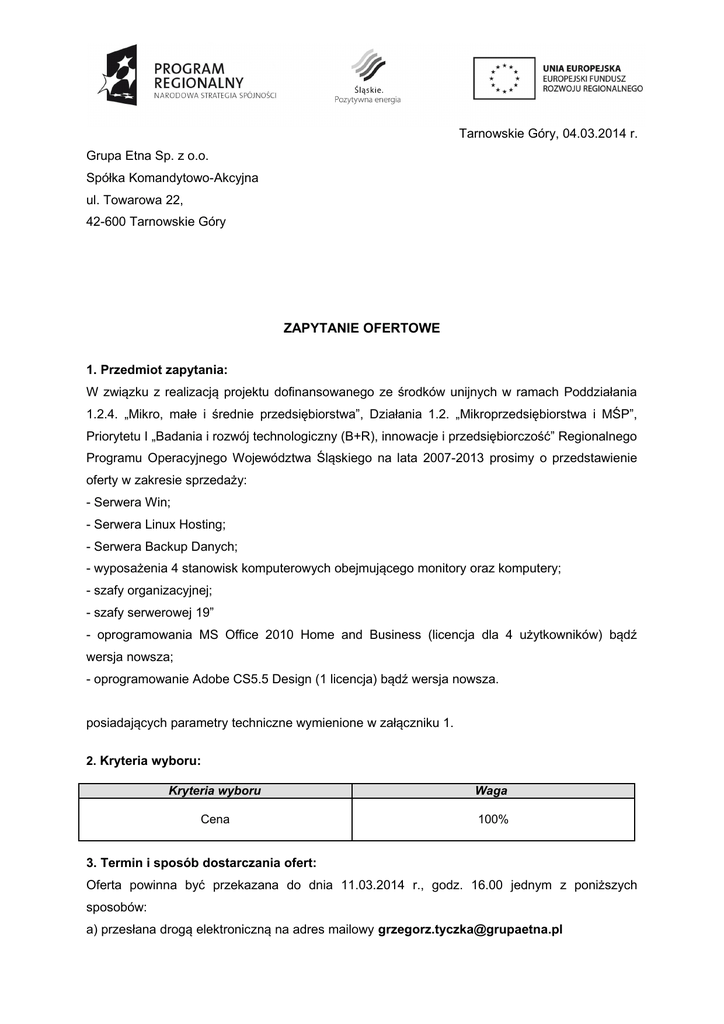 Tarnowskie Góry, 04.03.2014 r. Grupa Etna Sp. z o.o. Spółka Komandytowo-Akcyjna ul. Towarowa 22, 42-600 Tarnowskie Góry ZAPYTANIE OFERTOWE 1. Przedmiot zapytania: W związku z realizacją projektu dofinansowanego ze środków unijnych w ramach Poddziałania 1.2.4. „Mikro, małe i średnie przedsiębiorstwa”, Działania 1.2. „Mikroprzedsiębiorstwa i MŚP”, Priorytetu I „Badania i rozwój technologiczny (B+R), innowacje i przedsiębiorczość” Regionalnego Programu Operacyjnego Województwa Śląskiego na lata 2007-2013 prosimy o przedstawienie oferty w zakresie sprzedaży: - Serwera Win; - Serwera Linux Hosting; - Serwera Backup Danych; - wyposażenia 4 stanowisk komputerowych obejmującego monitory oraz komputery; - szafy organizacyjnej; - szafy serwerowej 19” - oprogramowania MS Office 2010 Home and Business (licencja dla 4 użytkowników) bądź wersja nowsza; - oprogramowanie Adobe CS5.5 Design (1 licencja) bądź wersja nowsza. posiadających parametry techniczne wymienione w załączniku 1. 2. Kryteria wyboru: Kryteria wyboru Waga Cena 100% 3. Termin i sposób dostarczania ofert: Oferta powinna być przekazana do dnia 11.03.2014 r., godz. 16.00 jednym z poniższych sposobów: a) przesłana drogą elektroniczną na adres mailowy [email protected] b) dostarczona pocztą, przesyłką kurierską lub dostarczona bezpośrednio do sekretariatu Grupa Etna Sp. z o.o. Spółka Komandytowo-Akcyjna, ul. Towarowa 22, 42-600 Tarnowskie Góry (decyduje data dostarczenia do siedziby Spółki w Tarnowskich Górach). c) faxem na numer +48 32 4 500 900 4. Dodatkowe wymagania formalne: Prosimy o przedstawienie oferty wg wzoru zamieszczonego w załączniku nr 2 do niniejszego zapytania ofertowego, z obowiązkowym uwzględnieniem poniższych informacji: data wystawienia oferty okres ważności oferty podpis wystawcy oferty wartości netto określone w PLN oczekiwana oferta musi stanowić ofertę w rozumieniu art. 66 Kodeksu cywilnego. Załącznik nr 1 do zapytania SPECYFIKACJE / PARAMETRY TECHNICZNE URZĄDZEŃ 1. Serwer Win musi posiadać następujące funkcjonalności oraz parametry techniczne nie gorsze niż: - płyta główna - procesor - 6 pamięci operacyjnych co najmniej 4 GB - kontroler - 4 dyski twarde co najmniej 500 GB - kieszeń na dyski - obudowa serwerowa - zasilacz 500 W - szyny do szafy. Ponadto dla prawidłowego działania serwer ten musi być wyposażony w systemy operacyjne: - Windows SBS Premium 2008 - 2 systemy Windows SBS Premium CAL 5 user/device - Windows Standard 2008 R2 - Windows Standard 2008 R2 5 CAL - 5 systemów Windows Remonte Desktop CAL 2. Serwer Linux Hosting musi posiadać następujące funkcjonalności oraz parametry techniczne nie gorsze niż: - płyta główna - procesor - pamięć operacyjna co najmniej 4 GB - kontroler - 4 dyski twarde co najmniej 500 GB - kieszeń na dyski - obudowa serwerowa - zasilacz 500 W - szyny do szafy. 3. Serwer Backup Danych musi posiadać następujące funkcjonalności oraz parametry techniczne nie gorsze niż: - płyta główna - procesor - pamięć operacyjna co najmniej 4 GB - kontroler - 4 dyski twarde co najmniej 2 TB - kieszeń na dyski - obudowa serwerowa - zasilacz 500 W - szyny do szafy. 4. Stanowiska komputerowe dla 4 użytkowników muszą posiadać następujące funkcjonalności oraz parametry techniczne nie gorsze niż: - 4 monitory 21” Full HD - 3 komputery wyposażone w procesor 3-rdzeniowy, pamięć RAM 2 GB, dysk twardy 500 GB oraz system operacyjny Win7Prof 64 b - komputer wyposażony w procesor 5-rdzeniowy, pamięć RAM 32 GB, dysk twardy 1000 GB oraz system operacyjny Win7Prof 64 b 5. Szafa organizacyjna musi posiadać następujące funkcjonalności oraz parametry techniczne nie gorsze niż: - 2 segmenty szafy o rozmiarze 19” - 2 switche - 4 organizatory kabli 1U - 3 patchpanele 24p 1U - listwa zasilająca (8 gniazd i wyłącznik) - listwa dystrybucji napięć 3U. 6. Szafa serwerowa 19” musi posiadać następujące elementy oraz parametry zakupu : - rozmiar 19”, wymiary 600x800. 7. Oprogramowanie MS Office 2010 Home and Business (licencja dla 4 użytkowników) bądź odpowiadająca mu wersja nowsza oprogramowania musi posiadać następujące funkcjonalności: - edytor tekstu WORD, - arkusz kalkulacyjny Excel, - edytor prezentacji Powerpoint, - program pocztowy Outlook. 8. Oprogramowanie Adobe CS5.5 Design (1 licencja) bądź odpowiadająca mu wersja nowsza powinny zawierać: - zestaw programów pozwalających na projektowanie i wydawanie różnego rodzaju publikacji. - najważniejsze elementy pakietu: Adobe Photoshop CS5, Adobe Illustrator CS5, Adobe InDesign CS5.5, Acrobat X Pro, Bridge CS5 oraz Device Central CS5.5. Załącznik nr 2 do zapytania Dane Oferenta: Nazwa: ………………………………………………………………………………………………….... Adres: ……………………………………………………………………………………………............ Tel: ……………………………………… Faks: ……………………………………… NIP: ……………………………………… REGON: ……………………………………… Grupa Etna Sp. z o.o. Spółka Komandytowo-Akcyjna ul. Towarowa 22, 42-600 Tarnowskie Góry OFERTA Odpowiadając na zapytanie ofertowe z dnia 04.03.2014 roku związane z realizowanym przez Państwa projektem dofinansowanym ze środków unijnych w ramach Poddziałania 1.2.4. „Mikro, małe i średnie przedsiębiorstwa”, Działania 1.2. „Mikroprzedsiębiorstwa i MŚP”, Priorytetu I „Badania i rozwój technologiczny (B+R), innowacje i przedsiębiorczość” Regionalnego Programu Operacyjnego Województwa Śląskiego na lata 2007-2013 składamy ofertę następującej treści: Oferujemy sprzedaż środków trwałych oraz wartości niematerialnych i prawnych zgodnie z przedstawioną w załączniku 1 specyfikacją: - za całkowitą cenę netto : .........................................