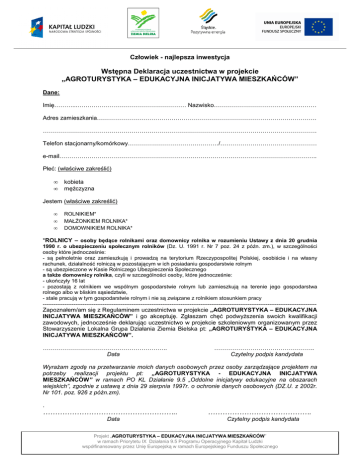 Człowiek - najlepsza inwestycja Wstępna Deklaracja uczestnictwa w projekcie „AGROTURYSTYKA – EDUKACYJNA INICJATYWA MIESZKAŃCÓW” Dane: Imię………...……………………………………………… Nazwisko…………………………………………… Adres zamieszkania………………………………………………………………………………………………. ………………………………………………………………………………………………………………………. Telefon stacjonarny/komórkowy………………………………………/………………………………………… e-mail……………………………………………………………………………………………………………….. Płeć: (właściwe zakreślić) • • kobieta mężczyzna Jestem (właściwe zakreślić) • • • ROLNIKIEM* MAŁŻONKIEM ROLNIKA* DOMOWNIKIEM ROLNIKA* *ROLNICY – osoby będące rolnikami oraz domownicy rolnika w rozumieniu Ustawy z dnia 20 grudnia 1990 r. o ubezpieczeniu społecznym rolników (Dz. U. 1991 r. Nr 7 poz. 24 z późn. zm.), w szczególności osoby które jednocześnie: - są pełnoletnie oraz zamieszkują i prowadzą na terytorium Rzeczypospolitej Polskiej, osobiście i na własny rachunek, działalność rolniczą w pozostającym w ich posiadaniu gospodarstwie rolnym - są ubezpieczone w Kasie Rolniczego Ubezpieczenia Społecznego a także domownicy rolnika, czyli w szczególności osoby, które jednocześnie: - ukończyły 16 lat - pozostają z rolnikiem we wspólnym gospodarstwie rolnym lub zamieszkują na terenie jego gospodarstwa rolnego albo w bliskim sąsiedztwie, - stale pracują w tym gospodarstwie rolnym i nie są związane z rolnikiem stosunkiem pracy ------------------------------------------------------------------------------------------------------------------------------------------------------Zapoznałem/am się z Regulaminem uczestnictwa w projekcie „AGROTURYSTYKA – EDUKACYJNA INICJATYWA MIESZKAŃCÓW” i go akceptuję. Zgłaszam chęć podwyższenia swoich kwalifikacji zawodowych, jednocześnie deklarując uczestnictwo w projekcie szkoleniowym organizowanym przez Stowarzyszenie Lokalna Grupa Działania Ziemia Bielska pt: „AGROTURYSTYKA – EDUKACYJNA INICJATYWA MIESZKAŃCÓW”. …………………………………………………….. Data ………………………………………….. Czytelny podpis kandydata Wyrażam zgodę na przetwarzanie moich danych osobowych przez osoby zarządzające projektem na potrzeby realizacji projektu pt: „AGROTURYSTYKA - EDUKACYJNA INICJATYWA MIESZKAŃCÓW” w ramach PO KL Działanie 9.5 „Oddolne inicjatywy edukacyjne na obszarach wiejskich”, zgodnie z ustawą z dnia 29 sierpnia 1997r. o ochronie danych osobowych (DZ.U. z 2002r. Nr 101. poz. 926 z późn.zm). . ……………………………………………….. Data ……………………………………. Czytelny podpis kandydata Projekt „Piękno w zawodzie” Projekt „AGROTURYSTYKA – EDUKACYJNA INICJATYWA MIESZKAŃCÓW” w ramach Priorytetu VI Działania 6.3 Programu Operacyjnego Kapitał Ludzki w ramach Priorytetu IX Działania 9.5 Programu Operacyjnego Kapitał Ludzki współfinansowany przez Unię Europejską w ramach Europejskiego Funduszu Społecznego współfinansowany przez Unię Europejską w ramach Europejskiego Funduszu Społecznego