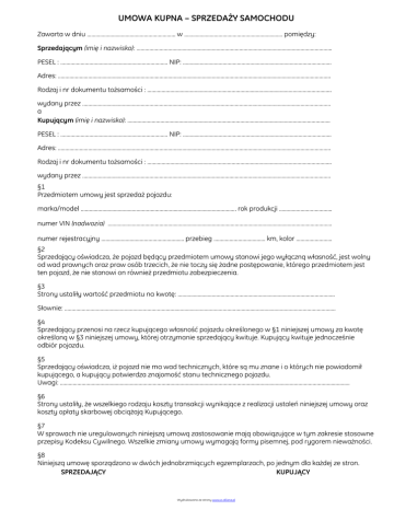 UMOWA KUPNA – SPRZEDAŻY SAMOCHODU