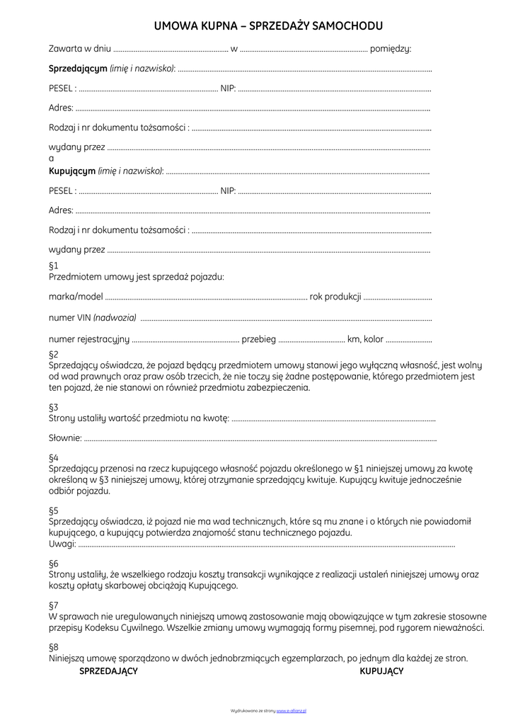UMOWA KUPNA – SPRZEDAŻY SAMOCHODU Zawarta w dniu …………………………………………………….. w …………………………………………………………… pomiędzy: Sprzedającym (imię i nazwisko): ……………………………………………………………………………………………………………………….. PESEL : ………………………………………………………………… NIP: ………………………………………………………………………………………….. Adres: ……………………………………………………………………………………………………………………………………………………………………….. Rodzaj i nr dokumentu tożsamości : ………………………………………………………………………………………………………………... wydany przez ………………………………………………………………………………………………………………………………………………………… a Kupującym (imię i nazwisko): ……………………………………………………………………………………………………………………………. PESEL : ………………………………………………………………… NIP: ………………………………………………………………………………………….. Adres: ……………………………………………………………………………………………………………………………………………………………………….. Rodzaj i nr dokumentu tożsamości : ………………………………………………………………………………………………………………... wydany przez ………………………………………………………………………………………………………………………………………………………… §1 Przedmiotem umowy jest sprzedaż pojazdu: marka/model ………………………………………………………………………………………………. rok produkcji ………………………………. numer VIN (nadwozia) …………………………………………………………………………………………………………………………………………. numer rejestracyjny …………………………………………………. przebieg ……………………………… km, kolor ……………………. §2 Sprzedający oświadcza, że pojazd będący przedmiotem umowy stanowi jego wyłączną własność, jest wolny od wad prawnych oraz praw osób trzecich, że nie toczy się żadne postępowanie, którego przedmiotem jest ten pojazd, że nie stanowi on również przedmiotu zabezpieczenia. §3 Strony ustaliły wartość przedmiotu na kwotę: ……………………………………………………………………………………………….. Słownie: ………………………………………………………………………………………………………………………………………………………………………. §4 Sprzedający przenosi na rzecz kupującego własność pojazdu określonego w §1 niniejszej umowy za kwotę określoną w §3 niniejszej umowy, której otrzymanie sprzedający kwituje. Kupujący kwituje jednocześnie odbiór pojazdu. §5 Sprzedający oświadcza, iż pojazd nie ma wad technicznych, które są mu znane i o których nie powiadomił kupującego, a kupujący potwierdza znajomość stanu technicznego pojazdu. Uwagi: …………………………………………………………………..……………………………………………………………………………………………………………… §6 Strony ustaliły, że wszelkiego rodzaju koszty transakcji wynikające z realizacji ustaleń niniejszej umowy oraz koszty opłaty skarbowej obciążają Kupującego. §7 W sprawach nie uregulowanych niniejszą umową zastosowanie mają obowiązujące w tym zakresie stosowne przepisy Kodeksu Cywilnego. Wszelkie zmiany umowy wymagają formy pisemnej, pod rygorem nieważności. §8 Niniejszą umowę sporządzono w dwóch jednobrzmiących egzemplarzach, po jednym dla każdej ze stron. SPRZEDAJĄCY KUPUJĄCY Wydrukowano ze strony www.e-allianz.pl