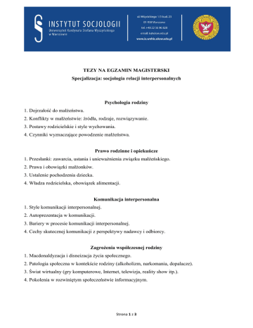 TEZY NA EGZAMIN MAGISTERSKI Specjalizacja: socjologia relacji interpersonalnych Psychologia rodziny 1. Dojrzałość do małżeństwa. 2. Konflikty w małżeństwie: źródła, rodzaje, rozwiązywanie. 3. Postawy rodzicielskie i style wychowania. 4. Czynniki wyznaczające powodzenie małżeństwa. Prawo rodzinne i opiekuńcze 1. Przesłanki: zawarcia, ustania i unieważnienia związku małżeńskiego. 2. Prawa i obowiązki małżonków. 3. Ustalenie pochodzenia dziecka. 4. Władza rodzicielska, obowiązek alimentacji. Komunikacja interpersonalna 1. Style komunikacji interpersonalnej. 2. Autoprezentacja w komunikacji. 3. Bariery w procesie komunikacji interpersonalnej. 4. Cechy skutecznej komunikacji z perspektywy nadawcy i odbiorcy. Zagrożenia współczesnej rodziny 1. Macdonaldyzacja i disneizacja życia społecznego. 2. Patologia społeczna w kontekście rodziny (alkoholizm, narkomania, dopalacze). 3. Świat wirtualny (gry komputerowe, Internet, telewizja, reality show itp.). 4. Pokolenia w rozwiniętym społeczeństwie informacyjnym. Strona 1 z 3 Poradnictwo rodzinne 1. Zadania poradnictwa rodzinnego. 2. Osoba doradcy: cechy, kompetencje i postawy. 3. Etapy rozmowy doradczej. 4. Najczęstsze błędy w poradnictwie. Metody i techniki negocjacji 1. Style negocjacji. 2. Strategie negocjacyjne. 3. Techniki kształtowania sytuacji negocjacyjnej. 4. Techniki sterowania przebiegiem negocjacji. Zarządzanie zasobami ludzkimi 1. Filozofia zarządzania zasobami ludzkimi. 2. Cele zarządzania zasobami ludzkim. 3. Zarządzanie zasobami ludzkimi a zarządzani personelem. 4. Strategiczne zarządzanie zasobami ludzkimi. Mediacje 1. Cele i zasady procesu mediacji. 2. Rodzaje mediacji i zakres podlegających im spraw. 3. Przeciwwskazania do prowadzenia mediacji. 4. Podstawy prawne prowadzenia mediacji w Polsce. Socjologia badań nad młodzieżą 1. Młodzież: praca i wchodzenie na rynek pracy w badaniach socjologicznych. 2. Młodzież: konsumpcja, czas wolny, nowe media – obszary manifestacji statusu. 3. Młodzi obywatele. Wyniki międzynarodowych badań młodzieży. 4. Socjologiczne pojęcie „pokolenia” w ujęciu Karla Mannheima. 5. Dymensje religijności młodzieży w Polsce – wektory zmian. Aktywizacja osób starszych 1. Czynniki kształtujące fazy życia i grupy wieku. 2. Pokolenia kulturowe w zbiorowości ludzi starych. 3. Rola ludzi starych w rodzinie. 4. Formy marginalizacji ludzi starych. Strona 2 z 3 Rozwój i osobowość jednostki 1. Obraz „ja” jednostki. 2. Poziomy i rodzaje zmian w rozwoju człowieka. 3. Stadia rozwoju psychospołecznego wg Erika Eriksona. 4. Ujęcie dojrzałej osobowości wg Abrahama Maslowa i Gordona Allporta. *** Strona 3 z 3
