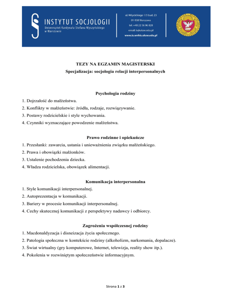 TEZY NA EGZAMIN MAGISTERSKI Specjalizacja: socjologia relacji