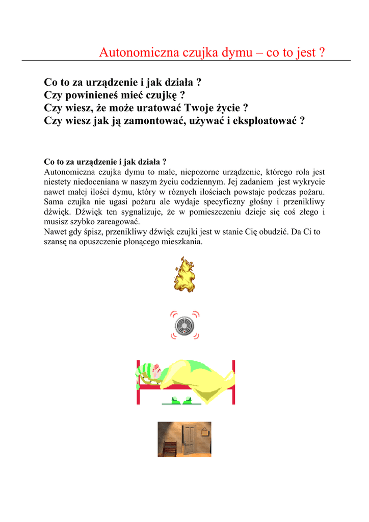 Autonomiczna czujka dymu – co to jest ? Co to za urządzenie i jak działa ? Czy powinieneś mieć czujkę ? Czy wiesz, że może uratować Twoje życie ? Czy wiesz jak ją zamontować, używać i eksploatować ? Co to za urządzenie i jak działa ? Autonomiczna czujka dymu to małe, niepozorne urządzenie, którego rola jest niestety niedoceniana w naszym życiu codziennym. Jej zadaniem jest wykrycie nawet małej ilości dymu, który w róznych ilościach powstaje podczas pożaru. Sama czujka nie ugasi pożaru ale wydaje specyficzny głośny i przenikliwy dźwięk. Dźwięk ten sygnalizuje, że w pomieszczeniu dzieje się coś złego i musisz szybko zareagować. Nawet gdy śpisz, przenikliwy dźwięk czujki jest w stanie Cię obudzić. Da Ci to szansę na opuszczenie płonącego mieszkania. Czy powinieneś mieć czujkę ? Czujka dymu w domu nie jest wymagana żadnymi przepisami. Mimo to warto ją mieć w swoim mieszkaniu. Utrzymana w czystości i sprawności technicznej w istotny sposób przyczyni się do poprawy bezpieczeństwa Twojego i Twoich bliskich. Statystyki i nasze codzienne działania pokazują, że wiele osób ginie w czasie pożarów od dymu a nie od ognia i ciepła. Powstały w czasie pożaru dym nawet w niewielkiej ilości może być zabójczy. Starajmy się unikać niepotrzebnych ofiar i nieszczęść. W jakim miejscu umieścić czujkę by spełniała ona swoje zadanie ? Umiejscowienie czujki w domu powinno być takie, by pojawiający się dym zainicjował jej działanie możliwie szybko. Czujka powinna być zamontowana pod sufitem – właściwości fizyczne dymu sprawiają, ze gromadzi się on w strefie podsufitowej. Nie powinno montować się czujki w pobliżu kuchni dlatego, że może się ona uruchamiać, gdy będziemy coś gotowali. Czy wiesz jak ją zamontować, używać i eksploatować ? Montaż i eksploatacja czujki dymu są rzeczami prostymi i nie wymagającymi dużej ilości czasu i nakładów finansowych. Koszt urządzenia, które może uratować twoje życie sięga kilkudziesięciu złotych a montaż wymaga tylko podstawowego sprzętu. Eksploatacja czujki ogranicza się tylko do kilku prostych czynności: • sprawdzanie raz na miesiąc, czy czujka jest sprawna – naciśnięcie przycisku do momentu pojawienia się dźwięku, • wyczyszczenie o ile to możliwe wnętrza czujki z kurzu (może on opóźniać działanie czujki lub powodować jej wadliwe działanie), • wymiana baterii – czujka sama sygnalizuje kiedy należy to zrobić wydając odpowiednie sygnały.