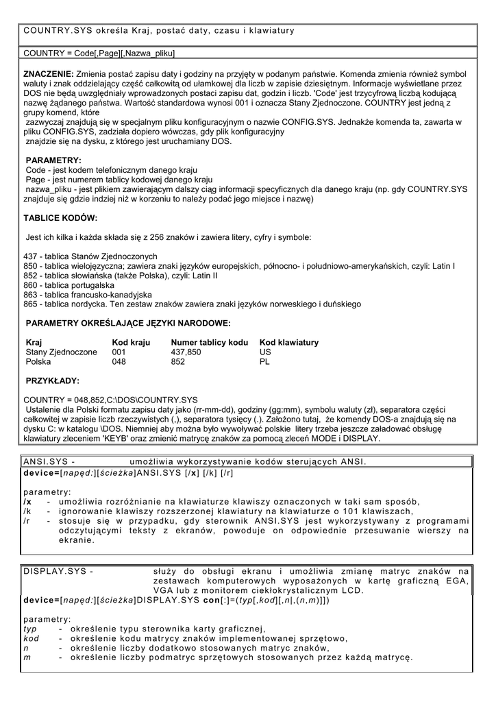 COUNTRY.SYS określa Kraj, postać daty, czasu i klawiatury