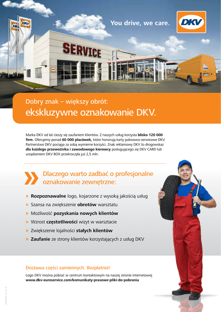 Dobry znak – większy obrót: ekskluzywne oznakowanie DKV. Marka DKV od lat cieszy się zaufaniem klientów. Z naszych usług korzysta blisko 120 000 firm. Oferujemy ponad 60 000 placówek, które honorują karty paliwowo-serwisowe DKV. Partnerstwo DKV pociąga za sobą wymierne korzyści. Znak reklamowy DKV to drogowskaz dla każdego przewoźnika i zawodowego kierowcy posługującego się DKV CARD lub urządzeniem DKV BOX przekroczyła już 2,5 mln. Dlaczego warto zadbać o profesjonalne oznakowanie zewnętrzne: »Rozpoznawalne logo, kojarzone z wysoką jakością usług »Szansa na zwiększenie obrotów warsztatu » M ożliwość pozyskania nowych klientów »Wzrost częstotliwości wizyt w warsztacie » Zwiększenie lojalności stałych klientów » Zaufanie ze strony klientów korzystających z usług DKV Dostawa części zamiennych. Bezpłatnie! 0060.0265 / 07.16 / PL Logo DKV można pobrać w centrum kontaktowym na naszej stronie internetowej www.dkv-euroservice.com/komunikaty-prasowe-pliki-do-pobrania Oznakowanie zewnętrzne DKV dla stacji i warsztatów partnerskich: zamów bezpłatnie. Wystarczy wypełnić formularz i przesłać e-mailem na adres: [email protected] lub faksem pod numer: +49 2102 5518-599. Tabliczka z twardego PCV z logo DKV Euro Service pakowana pojedynczo, nadruk jednostronny Wymiary Liczba 47 x 63 x 0,2 cm szt. Naklejka DKV, nadruk jednostronny, samoprzylepna do zastosowania na zewnątrz i wewnątrz budynków Wymiary Liczba 8,5 x 6,0 cm 16,0 x 11,3 cm Wymiary szt. szt. Liczba 28,0 x 20,0 cm 42,6 x 30,0 cm szt. szt. Naklejki dla partnerów DKV do przytwierdzenia na pojeździe samoprzylepna, usuwalna folia pokryta lakierem odpornym na promieniowanie UV Wymiary Liczba 10 x 10 cm 20 x 20 cm 40 x 40 cm szt. szt. szt. Chorągiewka DKV, nadruk obustronny Wymiary Liczba 150 x 300 cm szt. Adres wysyłki Nazwa firmy Nr dostawcy DKV (jeżeli już jest przydzielony) Osoba kontaktowa (imię, nazwisko) Nr punktu serwisowego DKV (jeżeli już jest przydzielony) Ulica / Nr domu Kod pocztowy / Miejscowość Kraj Województwo Nr telefonu Nr faksu E-mail DKV EURO SERVICE GmbH + Co. KG, Balcke-Dürr-Allee 3, D-40882 Ratingen www.dkv-euroservice.com