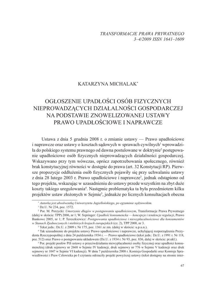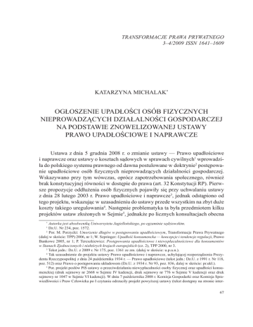 Transformacje Prawa Prywatnego 3–4/2009 ISSN 1641–1609 Katarzyna Michalak* Ogłoszenie upadłości osób fizycznych nieprowadzących działalności gospodarczej na podstawie znowelizowanej ustawy prawo upadłościowe i naprawcze Ustawa z dnia 5 grudnia 2008 r. o zmianie ustawy — Prawo upadłościowe i naprawcze oraz ustawy o kosztach sądowych w sprawach cywilnych wprowadziła do polskiego systemu prawnego od dawna postulowane w doktrynie postępowanie upadłościowe osób fizycznych nieprowadzących działalności gospodarczej. Wskazywano przy tym wówczas, oprócz zapotrzebowania społecznego, również brak konstytucyjnej równości w dostępie do prawa (art. 32 Konstytucji RP). Pierwsze propozycje oddłużenia osób fizycznych pojawiły się przy uchwalaniu ustawy z dnia 28 lutego 2003 r. Prawo upadłościowe i naprawcze, jednak odstąpiono od tego projektu, wskazując w uzasadnieniu do ustawy przede wszystkim na zbyt duże koszty takiego uregulowania. Następnie problematyka ta była przedmiotem kilku projektów ustaw złożonych w Sejmie, jednakże po licznych konsultacjach obecna Autorka jest absolwentką Uniwersytetu Jagiellońskiego, po egzaminie sędziowskim. Dz.U. Nr 234, poz. 1572. Por. M. Porzycki: Umorzenie długów w postępowaniu upadłościowym, Transformacje Prawa Prywatnego (dalej w skrócie: TPP) 2006, nr 1; W. Szpringer: Upadłość konsumencka — koncepcje i tendencje regulacji, Prawo Bankowe 2005, nr 1; P. Tereszkiewicz: Postępowania upadłościowe i niewypłacalnościowe dla konsumentów w Stanach Zjednoczonych i niektórych krajach europejskich (cz. 2), TPP 2000, nr 3. Tekst jedn.: Dz.U. z 2009 r. Nr 175, poz. 1361 ze zm. (dalej w skrócie: u.p.u.n.). Tak uzasadnienie do projektu ustawy Prawo upadłościowe i naprawcze, uchylającej rozporządzenia Prezydenta Rzeczypospolitej z dnia 24 października 1934 r. — Prawo upadłościowe (tekst jedn.: Dz.U. z 1991 r. Nr 118, poz. 512) oraz Prawo o postępowaniu układowem (Dz.U. z 1934 r. Nr 93, poz. 836, dalej w skrócie: pr.ukł.). Por. projekt posłów PiS ustawy o przeciwdziałaniu niewypłacalności osoby fizycznej oraz upadłości konsumenckiej (druk sejmowy nr 2668 w Sejmie IV kadencji, druk sejmowy nr 776 w Sejmie V kadencji oraz druk sejmowy nr 1047 w Sejmie VI kadencji). W dniu 7 października 2008 r. Komisja Gospodarki oraz Komisja Sprawiedliwości i Praw Człowieka po I czytaniu odrzuciły projekt powyższej ustawy (tekst dostępny na stronie inter* 67 Transformacje Prawa Prywatnego 3–4/2009 nowelizacja uzyskała najwyższe poparcie opiniowanych środowisk prawniczych, konsumenckich i organizacji przedsiębiorców. Ustawodawca zrezygnował z tworzenia osobnej ustawy dla postępowania upadłościowego osób fizycznych nieprowadzących działalności gospodarczej, uzasadniając, że przyjęte rozwiązanie, biorąc pod uwagę kompleksowy charakter prawa upadłościowego i naprawczego, pozwoli na uniknięcie powtórzeń czy zbędnych odesłań, które nie ułatwiają stosowania prawa. 1. Uwagi wstępne Prawo upadłościowe uznawane powszechnie za odrębną gałąź prawa stanowi jednak część systemu prawa prywatnego, które ma wpływ na wykładnię materialnych norm prawa upadłościowego. Przepisy prawa upadłościowego, oprócz norm materialnoprawnych, które określają skutki ogłoszenia upadłości, zawierają również normy procesowe dotyczące samego postępowania upadłościowego, do których ze względu na ogólną normę zawartą w art. 35 u.p.u.n. stosuje się „odpowiednio” przepisy o postępowaniu cywilnym. Przeprowadzenie granicy podziału między przepisami prawa procesowego a prawa materialnego jest trudne, lecz — jak podkreśla się w doktrynie — nie może się ono opierać na kryterium miejsca, w którym przepis się znajduje. Dla oznaczenia charakteru danego przepisu miarodajny jest zawsze jego przedmiot i treść, bez względu na to, w jakiej ustawie znajduje się ten przepis. Niniejszy artykuł ma na celu analizę przesłanek ogłoszenia upadłości osób fizycznych nieprowadzących działalności gospodarczej i w tym celu, wzorując się na rozwiązaniach prawa o postępowaniu cywilnym, proponuje się klasyfikację przesłanek ogłoszenia upadłości na przesłanki formalnoprawne, zwane także procesowymi, i przesłanki materialnoprawne, zwane również merytorycznymi. Zdanetowej: http://orka.sejm.gov.pl/proc6.nsf/opisy/1047.htm). W Sejmie VI kadencji znajdował się również projekt poselski ustawy o zmianie ustawy — Prawo upadłościowe i naprawcze oraz ustawy o kosztach sądowych w sprawach cywilnych, który został wycofany w dniu 2 października 2008 r. (tekst dostępny na stronie internetowej: http://orka.sejm.gov.pl/proc6.nsf/opisy/556.htm). Por. uzasadnienie do projektu ustawy o zmianie ustawy — Prawo upadłościowe i naprawcze oraz ustawy o kosztach sądowych w sprawach cywilnych, druk sejmowy nr 831 dostępny na stronie internetowej: http://orka. sejm.gov.pl/Druki6ka.nsf/0/DD4BAC457CFFB574C1257491003FA22E/$file/831–uzasadnienie.doc. Tak uzasadnienie do projektu ustawy o zmianie ustawy — Prawo upadłościowe i naprawcze oraz ustawy o kosztach sądowych w sprawach cywilnych, op. cit. Tak W. Siedlecki, Z. Świeboda: Postępowanie cywilne, zarys wykładu, Warszawa 2001, s. 36. Na temat podziału na normy procesowe i materialne zob. więcej: E. Till: Materialne austryackie prawo konkursowe, Lwów 1907, s. 8 i n. Pojęcie przesłanek procesowych wprowadzone zostało do nauki prawa procesowego cywilnego w związku z poglądem ujmującym proces cywilny jako stosunek prawnoprocesowy. Pojęcie to jednak zostało od niego oderwane i powszechnie przyjęte w nauce. Brak jednak zgody w nauce zarówno co do istoty przesłanek procesowych, jak i co do kryteriów ich podziału na pewne rodzaje (szerzej na ten temat: Z. Resich: Przesłanki procesowe, War68 Katarzyna Michalak: Ogłoszenie upadłości osób fizycznych nieprowadzących działalności gospodarczej… niem