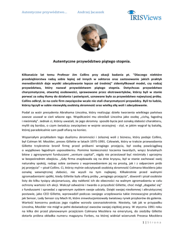 Autentyczne przywództwo… Andrzej Jacaszek Autentyczne przywództwo piątego stopnia. Kilkanaście lat temu Profesor Jim Collins przy okazji badania pt. "Dlaczego niektóre przedsiębiorstwa radzą sobie lepiej od innych w sektorze oraz zastosowanie jakich praktyk menedżerskich daje wyniki zdecydowanie lepsze od średniej" zidentyfikował model, czy rodzaj przywództwa, który nazwał przywództwem piątego stopnia. Dotychczas przywództwo charyzmatyczne, otwartej osobowości, sprawowane przez ekstrawertyków, którzy byli w stanie porwać za sobą tłumy do działania i poświęceń, uznawane było za przywództwo najwyższej próby. Collins odkrył, że na czele firm zwycięzców wcale nie stali charyzmatyczni przywódcy. Byli to ludzie, którzy łączyli w sobie niezwykłą osobistą skromność oraz wielką siłę woli i zdecydowanie. Podał za wzór prezydenta Abrahama Lincolna, który realizując dzieło tworzenia wielkiego państwa zawsze usuwał w cień własne ego. Współcześni mu określali Lincolna jako osobę „cichą, łagodną i nieśmiałą”. Jednak ci, którzy uważali, że jego skromny sposób bycia jest oznaką słabości charakteru, mylili się bardzo, o czym świadczy zwycięstwo w wojnie secesyjnej - styl, w jakim wygrał tę batalię, której paradoksalnie sam padł ofiarą na koniec. Wspaniałym przykładem tego dualizmu skromności i żelaznej woli z biznesu, który podaje Collins, był Colman M. Mockler, prezes Gillette w latach 1975-1991. Człowiek, który w trakcie przewodzenia Gillette trzykrotnie bronił firmę przed próbami wrogiego przejęcia, był osobą powściągliwą o wyjątkowo łagodnym usposobieniu. Pomimo konieczności toczenia twardych, wręcz brutalnych bitew z agresywnymi funduszami „venture capital”, nigdy nie przestawał być nieśmiały i uprzejmy w bezpośrednim obejściu. „Gdy firma znajdowała się na dnie kryzysu, był w stanie zachować swój naturalny spokój, radząc sobie zarówno z wyprowadzeniem jej na prostą, jak i z odparciem prób jej przejęcia” – pisał Collins. Ci, którzy mylnie odczytywali osobistą skromność Colmana Mocklera jako oznakę wewnętrznej słabości, nie wyszli na tym najlepiej. Kilkakrotnie przed walnymi zgromadzeniami spółki, kiedy Gillette była ofiarą próby „wrogiego przejęcia”, dzwonił i pisał osobiste listy do kilku tysięcy akcjonariuszy, aby nakłonić ich do obecności na walnym zgromadzeniu w celu ochrony wartości ich akcji. Walczył odważnie i twardo o przyszłość Gillette, choć mógł „dogadać się” z funduszami i sprzedać z ogromnym zyskiem swoje udziały. Dzięki swojej niezłomnej i altruistycznej postawie, jako CEO Gillette, wprowadził podczas swojego urzędowania takie innowacyjne produkty jak Sensor, Lady Sensor czy Mach III, które zrewolucjonizowały światowy rynek przyborów do golenia. Wartość koncernu podczas jego rządów wzrosła szesnastokrotnie. Niestety, tak jak w przypadku Lincolna, Mockler nie mógł w pełni doświadczyć owoców swojej ciężkiej pracy. W styczniu 1991 roku na kilka dni przed planowanym przejściem Colmana Mocklera na emeryturę, do siedziby Gillette dotarła próbna okładka numeru magazynu Forbes, na której widniał wizerunek Prezesa Mocklera 1|Strona Autentyczne przywództwo… Andrzej Jacaszek stojącego na szczycie góry i w triumfalnym geście wznoszącego nad głową gigantyczną brzytwę. Mockler był człowiekiem skromnym, rzadko udzielał wywiadów, nie pozwalał się fotografować i nie bywał zbyt często w mediach. Jak pisze Collins: „w kilka minut po ujrzeniu tego dowodu publicznego uznania wyników szesnastu lat osobistych zmagań, Mockler upadł wchodząc do gabinetu i zmarł w wyniku rozległego ataku serca. Zapewne gdyby nawet wiedział, że przyjdzie mu umrzeć w czasie pracy, nie zmieniłby niczego w swoim postępowaniu. Jego spokojny charakter skrywał wielką zawziętość oraz dążenie do perfekcjonizmu – podyktowane nie oczekiwaniem jakichkolwiek korzyści, ale wewnętrznym przekonaniem, że nie można inaczej. Mockler w żadnym razie nie mógł się zgodzić na oddanie firmy w ręce ludzi, którzy zamierzali ją zniszczyć – co by nie powiedzieć, analogia z osobą Abrahama Lincolna nasuwa się sama”. Przywództwo oparte na autentyczności . Rob Goffee i Gareth Jones w artykule „ Autentyczne przywództwo”, który opublikowano na łamach Harvard Business Review Polska nr 44 w 2006 r. uważają, że „autentyczni liderzy cały czas pamiętają dokąd zmierzają, ale nigdy nie zapominają, skąd wyszli. Świetnie dopasowani do otoczenia, wykorzystują intuicję, wcześniejsze przełomowe i często przykre przeżycia, by zrozumieć oczekiwania i obawy swoich podwładnych. Zachowują swoje wyjątkowe osobiste cechy, ale wiedzą jak zdobyć poparcie w ramach silnej kultury korporacyjnej i istniejących reguł dotyczących relacji międzyludzkich (tzw. kulturą społeczną firmy), a także jak wykorzystać elementy tych kultur do wprowadzenia radykalnych zmian”. Rodzimym przykładem autentycznego przywódcy z polskiego rynku jest Prezes Action SA Piotr Bieliński. Piotr ukończył Akademię Wychowania Fizycznego – skąd wyszedł. Stworzył wiodącą na polskim rynku firmę sprzedającą akcesoria i sprzęt IT, wszedł na GPW, a akcje jego spółki systematycznie rosną na wartości. Do dzisiaj w swoich praktykach przywódczych wykorzystuje element sportowej rywalizacji z członkami swojego zespołu. Potrafi rzucać swoim pracownikom nie tylko ambitne wyzwania biznesowe, ale i sportowe. Kilka lat temu założył się z pracownikami działu handlowego Action, że przejedzie na rowerze ze Szklarskiej Poręby do Warszawy w ciągu 48 godzin (500km). Cały personel Action śledził wyczyn prezesa, z którego relacja była transmitowana w intranecie firmy. Piotr wygrał zakład przypłacając to ogromnym wycieńczeniem organizmu, a wszyscy mężczyźni w dziale handlowym musieli ogolić 