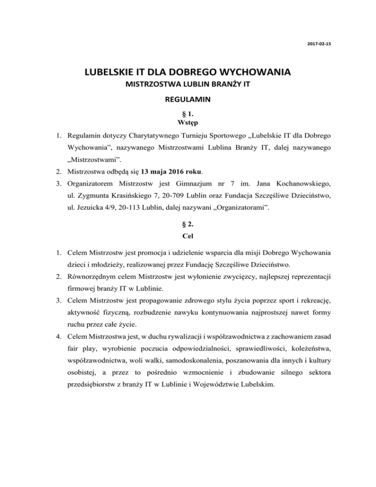 2017-02-15 LUBELSKIE IT DLA DOBREGO WYCHOWANIA MISTRZOSTWA LUBLIN BRANŻY IT REGULAMIN § 1. Wstęp 1. Regulamin dotyczy Charytatywnego Turnieju Sportowego „Lubelskie IT dla Dobrego Wychowania”, nazywanego Mistrzostwami Lublina Branży IT, dalej nazywanego „Mistrzostwami”. 2. Mistrzostwa odbędą się 13 maja 2016 roku. 3. Organizatorem Mistrzostw jest Gimnazjum nr 7 im. Jana Kochanowskiego, ul. Zygmunta Krasińskiego 7, 20-709 Lublin oraz Fundacja Szczęśliwe Dzieciństwo, ul. Jezuicka 4/9, 20-113 Lublin, dalej nazywani „Organizatorami”. § 2. Cel 1. Celem Mistrzostw jest promocja i udzielenie wsparcia dla misji Dobrego Wychowania dzieci i młodzieży, realizowanej przez Fundację Szczęśliwe Dzieciństwo. 2. Równorzędnym celem Mistrzostw jest wyłonienie zwycięzcy, najlepszej reprezentacji firmowej branży IT w Lublinie. 3. Celem Mistrzostw jest propagowanie zdrowego stylu życia poprzez sport i rekreację, aktywność fizyczną, rozbudzenie nawyku kontynuowania najprostszej nawet formy ruchu przez całe życie. 4. Celem Mistrzostwa jest, w duchu rywalizacji i współzawodnictwa z zachowaniem zasad fair play, wyrobienie poczucia odpowiedzialności, sprawiedliwości, koleżeństwa, współzawodnictwa, woli walki, samodoskonalenia, poszanowania dla innych i kultury osobistej, a przez to pośrednio wzmocnienie i zbudowanie silnego sektora przedsiębiorstw z branży IT w Lublinie i Województwie Lubelskim. § 3. Zapisy 1. W Mistrzostwach mogą uczestniczyć drużyny reprezentujące branże IT, składające się z aktualnych na dzień Mistrzostw pracowników danej firmy lub kontaktorów współpracujących z nią na zasadzie b2b. Drużyny traktowane są jako reprezentacje firmowe wystawione do walki o Mistrzostwo. a. W Mistrzostwach mogą brać udział również reprezentacji lubelskich szkół wyższych, złożone ze studentów kierunków informatycznych. 2. Drużyny do uczestnictwa w Mistrzostwach należy zgłaszać na formularzu zgłoszeniowym poprzez stronę internetową www.mistrzostwait.pl. 3. Warunkiem uczestnictwa drużyny w Mistrzostwach jest przekazanie darowizny, w kwocie 1500 zł, na rzecz misji Dobrego Wychowania dzieci i młodzieży, realizowanej przez Fundację Szczęśliwe Dzieciństwo, w sposób ustalony z Organizatorem. a. Warunek przekazania darowizny nie dotyczy drużyn studenckich, reprezentujących lubelskie szkoły wyższe. 4. W Mistrzostwach bierze udział 16 drużyn, o uczestnictwie decyduje kolejność zgłoszeń. § 4. Zasady rozgrywki 1. Mistrzostwa prowadzone są w oparciu o aktualne przepisy gry w piłkę nożną z wyłączeniem przepisu o spalonym. 2. Rozgrywki prowadzone są systemem tzw. brazylijskim dla 16 drużyn, według Drabinki Pucharowej, będącej załącznikiem do regulaminu. 3. W przypadku zakończenia meczu remisem w regulaminowym czasie gry, odbywa się seria trzech rzutów karnych dla każdej drużyny, która powinna wyłonić zwycięzcę. Jeżeli nie uda się w ten sposób wyłonić zwycięzcy, to drużyny wykonują rzuty karne do przewagi jednego gola. 4. O początkowych miejscach na drabince decyduje kolejność zgłoszeń do Mistrzostw. 5. Prowadzenie rozgrywek, nadzór, organizacja i czuwanie nad należytym przestrzeganiem przepisów gry w piłkę nożną należy do osób wyznaczonych przez organizatorów Mistrzostw. 6. W Mistrzostwach mogą brać udział tylko zawodnicy zgłoszeni do rozgrywek. 7. Liczba zgłoszonych uczestników przez jedną drużynę jest ograniczona do 12 zawodników, przy czym ci sami zawodnicy mogą być zgłoszeni tylko w jednej drużynie. Można zgłosić mniejszą ilość zawodników. 8. Każda drużyna musi mieć swojego kapitana, który będzie ją reprezentował. 9. Mecz rozgrywa w polu 6 osób, w tym bramkarz, oraz 6 zawodników rezerwowych. 10. Zawodnicy jednej drużyny winni mieć koszulki w jednakowym kolorze lub w kolorach zbliżonych do siebie. 11. Dopuszczalne obuwie typu "turf" lub halowe, zakaz gry w korkach (tzw. lankach). 12. Dowolna liczba zmian zawodników podczas meczu. Zmiany zawodników odbywają się w wyznaczonej strefie przy linii środkowej boiska. 13. Czas trwania meczu określa się na dwa razy po 6 minut bez przerwy. 14. W wypadku wyniku remisowego zostanie przeprowadzona seria trzech rzutów karnych, która wyłoni zwycięzcę meczu. 15. Sędzia zawodów może w celach wychowawczych wykluczyć zawodnika z gry na okres 1-5 minut. 16. Każdego zawodnika obowiązuje zachowanie zasad kultury i szacunku do innych zawodników oraz kibiców. Zachowanie agresywne, wulgarne itp., zarówno na boisku jak i poza nim, będzie skutkowało wykluczeniem zawodnika z udziału w Mistrzostwach. 17. Decyzje sędziów zawodów są niepodważalne i ostateczne. 18. Uczestnicy Mistrzostw zobowiązani są do zachowania porządku na boisku i wokół niego. Podczas Mistrzostw w obrębie obiektów sportowych zabrania się spożywania alkoholu oraz palenia tytoniu. § 5. Nagrody 1. Zwycięska drużyna otrzyma tytuł oraz puchar Mistrza Lublina Branży IT. Zawodnicy drużyny otrzymają pamiątkowe medale oraz upominki. 2. Podczas Mistrzostw wyłoniony zostanie Król Strzelców, którzy otrzyma pamiątkowy upominek. 3. Podczas Mistrzostw wyłoniony zostanie Najlepszy Bramkarz Mistrzostw, który otrzyma pamiątkowy upominek. 4. Podczas Mistrzostw przyznana zostanie nagroda Fair Play. § 6. Postanowienia końcowe 1. Organizatorzy nie ponoszą żadnej odpowiedzialności za wypadki zaistniałe przed, w czasie i po zawodach. 2. Organizatorzy zastrzegają sobie prawo do zmiany oraz sposobu interpretacji regulaminu podczas trwania Mistrzostw. Kontakt i zapisy: Mariusz Łobejko: [email protected], tel. 504 062 089 Marcin Czakon: [email protected], tel. 81 745 71 62