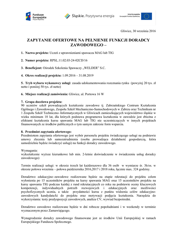 Gliwice, 30 września 2016 ZAPYTANIE OFERTOWE NA PEŁNIENIE FUNKCJI DORADCY ZAWODOWEGO – 1. Nazwa projektu: Uczeń z uprawnieniami spawacza MAG lub TIG 2. Numer projektu: RPSL.11.02.03-24-02CD/16 3. Beneficjent: Ośrodek Szkolenia Spawaczy „WELDER” S.C. 4. Okres realizacji projektu: 1.09.2016 – 31.08.2019 5. Tryb wyboru wykonawcy usługi: zasada udokumentowania rozeznania rynku (powyżej 20 tys. zł netto i poniżej 50 tys. zł netto) 6. Miejsce realizacji zamówienia: Gliwice, ul. Portowa 16 W 7. Grupa docelowa projektu: 90 uczniów szkół prowadzących kształcenie zawodowe tj. Zabrzańskiego Centrum Kształcenia Ogólnego i Zawodowego, Zespołu Szkół Mechaniczno-Samochodowych w Zabrzu oraz Technikum nr 1 Zespołu Szkół Techniczno–Informatycznych w Gliwicach zamieszkujących województwo śląskie w wieku minimum 18 lat, dla których podstawa programowa kształcenia w zawodzie jest zbieżna z efektami kształcenia kursu spawania MAG lub TIG nie uczestniczących w innych projektach finansowanych ze środków publicznych o tym samym zakresie form wsparcia. 8. Przedmiot zapytania ofertowego: Przedmiotem zapytania ofertowego jest wybór personelu projektu świadczącego usługi na podstawie umowy zlecenia lub samozatrudnienia (osoba prowadząca działalność gospodarczą, która samodzielnie będzie świadczyć usługi) na funkcji doradcy zawodowego. Wymagania: wykształcenie wyższe kierunkowe lub min. 2-letnie doświadczenie w świadczeniu usług doradcy zawodowego) Termin realizacji usługi: w okresie trzech lat każdorazowo dla 36 osób w wymiarze śr. 3h/os. w okresie połowa września – połowa października 2016,2017 i 2018 roku, łącznie max. 324 godziny. Doradztwo edukacyjno–zawodowe realizowane będzie na etapie rekrutacji do projektu celem wyłonienia po 15 uczestników projektu na kursy spawania MAG oraz 15 uczestników projektu na kursy spawania TIG podczas każdej z rund rekrutacyjnych co roku na podstawie oceny kluczowych kompetencji, indywidualnych potrzeb rozwojowych i edukacyjnych oraz możliwości psychofizycznych ucznia, a także przydatności kursu z punktu widzenia celów edukacyjnozawodowych kandydata/ki do projektu oraz motywacji podjęcia kształcenia. Narzędzia do wykorzystania: testy predyspozycji zawodowych, analiza CV, wywiad bezpośredni. Doradztwo zawodowe realizowane będzie w dni robocze popołudniami i w weekendy w terminie wyznaczonym przez Zamawiającego. Wynagrodzenie doradcy zawodowego finansowane jest ze środków Unii Europejskiej w ramach Europejskiego Funduszu Społecznego. 9. Kryterium wyboru ofert: Warunkiem formalnym wyboru oferentów jest przedłożenie kompletu dokumentów potwierdzających wymagania na stanowisko doradcy zawodowego wskazane w punkcie 8 tj. CV, dyplom ukończenia kształcenia w zawodzie doradcy zawodowego i/lub dokumenty poświadczające doświadczenie zawodowe w zakresie doradztwa zawodowego (ocena 0 – nie spełnia, 1 – spełnia). Oferty, które spełnią wymóg kompletności zostaną ocenione zgodnie z kryterium ceny: waga 100%. W celu wyboru najkorzystniejszej oferty, Zamawiający będzie się posługiwał następującym wzorem: Kryterium cena: P min An = ----------------------------- x 100 pkt. Pn An – liczba punktów przyznanych ofercie podlegającej ocenie za kryterium cenowe P min – cena minimalna wśród ważnych ofert P n – cena zaproponowana przez Wykonawcę Cena powinna obejmować wszystkie koszty związane z realizacją usługi, w tym składki ZUS i podatki. 10. Termin i miejsce składania ofert Prosimy o składanie oferty (osobiście, faxem, e-mailem lub pocztą) do dnia 07 październik 2016 r. do godz. 9.00 zgodnie z załączonym formularzem oferty w Biurze Projektu. Ośrodek Szkolenia Spawaczy „WELDER” S.C. Ul. Portowa 16 W, 44-102 Gliwice Tel. tel.: 032 231 12 50, fax: 032 300 00 10 e-mail: [email protected] Osoba do kontaktu: Tomasz Jędrzejowski – koordynator projektu, tel. 609 331 453 Zapytanie ofertowe zostało opublikowane na stronie www.oss-welder.pl zakładka „Projekty unijne” oraz dostarczone do trzech potencjalnych wykonawców usług.