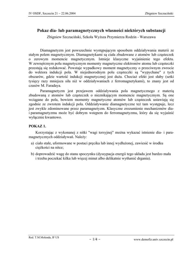 IV OSDF, Szczecin 21 − 22.06.2004 Zbigniew Szczuciński Pokaz dia- lub paramagnetycznych własności niektórych substancji Zbigniew Szczuciński, Szkoła Wyższa Przymierza Rodzin - Warszawa Diamagnetyzm jest powszechnie występującym sposobem oddziaływania materii ze stałym polem magnetycznym. Diamagnetykami są ciała zbudowane z atomów lub cząsteczek o zerowym momencie magnetycznym. Istnieje klasyczne wyjaśnienie tego efektu. W zewnętrznym polu magnetycznym momenty magnetyczne elektronów atomu lub cząsteczki przestają się redukować. Powstaje wypadkowy moment magnetyczny o przeciwnym zwrocie do wektora indukcji pola. W niejednorodnym polu cząsteczki są "wypychane" z tych obszarów, gdzie wartość indukcji magnetycznej jest duża. Chociaż efekt jest słaby (setki tysięcy razy mniejsza siła niż w oddziaływaniach z ferromagnetykami), to znany jest od czasów M. Faradaya. Paramagnetyzm jest przejawem oddziaływania pola magnetycznego z materią zbudowaną z atomów lub cząsteczek o nieznikającym momencie magnetycznym. Są one wciągane do pola, bowiem momenty magnetyczne atomów lub cząsteczek ustawiają się zgodnie ze zwrotem indukcji pola. Oddziaływanie diamagnetyczne też tam występuje, lecz jest zwykle zdominowane przez paramagnetyzm. Klasyczne zrozumienie mechanizmów diai paramagnetyzmu może być dobrym wstępem do ferromagnetyzmu, który da się wyjaśnić wyłącznie kwantowo. POKAZ 1. Korzystając z wykonanej z nitki "wagi torsyjnej" można wykazać istnienie dia- i paramagnetycznych oddziaływań. Należy: a) ciało stałe, uformowane w postaci pręcika lub innej wydłużonej, zawiesić w środku ciężkości na nitce; b) doprowadzić wagę do stanu spoczynku (dyssypacja energii tego układu jest bardzo mała i trzeba poczekać kilka lub więcej minut albo delikatnie wytłumić drgania). Red. T.M.Molenda, IF US - 1/4 - www.demofiz.univ.szczecin.pl IV OSDF, Szczecin 21 − 22.06.2004 Zbigniew Szczuciński Zdj. 1. Na zdjęciu po lewej stronie pionowego pręta są paramagnetyki: kreda, chlorek miedzi, gumka myszka, ołów z domieszką, pręt glinu, folia glinu a po prawej diamagnetyki: cyna lutownicza, ołów, węgiel, szkło, miedź, stop złota z miedzią, PCV, bizmut, drewno) c) powoli zbliżyć neodymowy magnes (wartość indukcji pola około 1 T) Zdj. 2. Na zdjęciu węgiel drzewny (diamagnetyk) oddala się od magnesu d) obserwować przyspieszenie ciała w jego ruchu obrotowym. e) jeśli na wadze torsyjnej wychylić z położenia równowagi dia- lub paramagnetyk i zbliżyć doń (z odpowiedniej strony) magnes, to można zaobserwować zrównoważenie się moRed. T.M.Molenda, IF US - 2/4 - www.demofiz.univ.szczecin.pl IV OSDF, Szczecin 21 − 22.06.2004 Zbigniew Szczuciński mentu siły skręcającej nić i momentu siły, z jakim magnes działa na substancję. Ciało będzie pozostawało w równowadze tak długo, jak będzie trzy-many nieruchomo magnes. W tym punkcie eksperymentu można pokazać, że oddziaływanie magnetyczne zależy od rodzaju substancji oraz dokonać pomiarów ilościowych siły oddziaływania (trzeba wyznaczyć okres drgań wagi torsyjnej, moment bezwładności ciała, kąt skręcenia i odległość od magnesu) POKAZ 2. Diamagnetyczne właściwości wody można pokazać zanurzając w niej magnes neodymowy tak, by był przykryty jej cienką warstewką (0,5 − 2 mm). Można zaobserwować, że woda jest wypychana z silnego pola. Podano dwa sposoby takiego pokazu. Oba polegają na oglądaniu odbitych promieni świetlnych od powierzchni wody, pod którą znajduje się magnes w kształcie prostokąta. Żeby od metalicznej powierzchni magnesu nie odbijało się dużo światła (które może zakłócić obserwację) zaklejono ją zielonym przylepcem. 1. Sposób: Odbicie, znajdującej się w płaszczyźnie pionowej za naczyniem z wodą, niewidocznej na zdjęciu, regularnej, czarnej kratki na białym tle, od powierzchni wody zostaje zniekształcone najbardziej w miejscach znajdujących się nad krawędziami magnesu, tam gdzie gradient pola jest największy. Red. T.M.Molenda, IF US - 3/4 - www.demofiz.univ.szczecin.pl IV OSDF, Szczecin 21 − 22.06.2004 Zbigniew Szczuciński 2. Sposób: Światło lasera, emitowane ze źródła, niewidocznego na zdjęciu, znajdującego się przy obiektywie aparatu fotograficznego, odbija się od powierzchni wody, pod którą znajduje się magnes. Jeśli wiązka pada na powierzchnię wody nad jego krawędzią (zdjęcie lewe), na ekranie widać wielokrotnie wydłużoną plamkę. Jeżeli pada nad środkiem magnesu (zdjęcie prawe) lub z dala od niego, to plamka nie jest zniekształcona. Red. T.M.Molenda, IF US - 4/4 - www.demofiz.univ.szczecin.pl