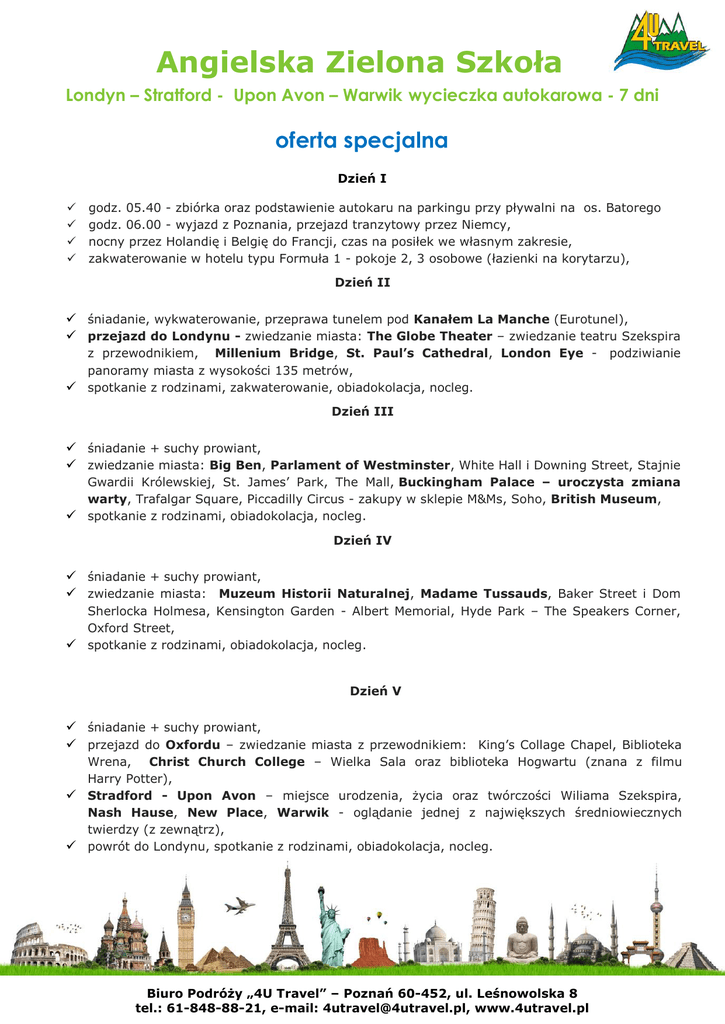 Angielska Zielona Szkoła Londyn – Stratford - Upon Avon – Warwik wycieczka autokarowa - 7 dni oferta specjalna Dzień I godz. 05.40 - zbiórka oraz podstawienie autokaru na parkingu przy pływalni na os. Batorego godz. 06.00 - wyjazd z Poznania, przejazd tranzytowy przez Niemcy, nocny przez Holandię i Belgię do Francji, czas na posiłek we własnym zakresie, zakwaterowanie w hotelu typu Formuła 1 - pokoje 2, 3 osobowe (łazienki na korytarzu), Dzień II śniadanie, wykwaterowanie, przeprawa tunelem pod Kanałem La Manche (Eurotunel), przejazd do Londynu - zwiedzanie miasta: The Globe Theater – zwiedzanie teatru Szekspira z przewodnikiem, Millenium Bridge, St. Paul’s Cathedral, London Eye panoramy miasta z wysokości 135 metrów, spotkanie z rodzinami, zakwaterowanie, obiadokolacja, nocleg. podziwianie Dzień III śniadanie + suchy prowiant, zwiedzanie miasta: Big Ben, Parlament of Westminster, White Hall i Downing Street, Stajnie Gwardii Królewskiej, St. James’ Park, The Mall, Buckingham Palace – uroczysta zmiana warty, Trafalgar Square, Piccadilly Circus - zakupy w sklepie M&Ms, Soho, British Museum, spotkanie z rodzinami, obiadokolacja, nocleg. Dzień IV śniadanie + suchy prowiant, zwiedzanie miasta: Muzeum Historii Naturalnej, Madame Tussauds, Baker Street i Dom Sherlocka Holmesa, Kensington Garden - Albert Memorial, Hyde Park – The Speakers Corner, Oxford Street, spotkanie z rodzinami, obiadokolacja, nocleg. Dzień V śniadanie + suchy prowiant, przejazd do Oxfordu – zwiedzanie miasta z przewodnikiem: King’s Collage Chapel, Biblioteka Wrena, Christ Church College – Wielka Sala oraz biblioteka Hogwartu (znana z filmu Harry Potter), Stradford - Upon Avon – miejsce urodzenia, życia oraz twórczości Wiliama Szekspira, Nash Hause, New Place, Warwik - oglądanie jednej z największych średniowiecznych twierdzy (z zewnątrz), powrót do Londynu, spotkanie z rodzinami, obiadokolacja, nocleg. Biuro Podróży „4U Travel” – Poznań 60-452, ul. Leśnowolska 8 tel.: 61-848-88-21, e-mail: [email protected], www.4utravel.pl Angielska Zielona Szkoła Dzień VI śniadanie + suchy prowiant, wykwaterowanie, zwiedzanie Londynu: Westminster Abbey, rejs statkiem po Tamizie, zwiedzanie Zamku Tower oraz Tower Bridge, przeprawa pod Kanałem La Manche, zakwaterowanie w hotelu tranzytowym na terenie Francji, nocleg. Dzień VII śniadanie, wykwaterowanie, przejazd tranzytowy to Polski, powrót do Poznania w późnym wieczorem, ok. godz. 23.30 CENA 1400 PLN + 120 GBP – grupa min. 40 osób płatnych 2 noclegi tranzytowe dodatkowo płatne Cena kalkulowana przy kursie średnim funta 5,10. W cenie zawarte: transport komfortowym polskim autokarem opieka pilota podczas całej wycieczki zakwaterowanie u rodzin angielskich – 4 noclegi, wyżywienie: śniadania + obiadokolacje oraz codzienny prowiant w Londynie 2 noclegi tranzytowe ze śniadaniem we Francji ubezpieczenie PZU – KL 80.000 PLN oraz NNW 10.000 PLN realizacja programu zwiedzania - bilety wstępu do atrakcji przewidzianych w programie opłata w funtach przeznaczona jest na bilety wstępu do atrakcji wymienionych w programie Biuro Podróży „4U Travel” – Poznań 60-452, ul. Leśnowolska 8 tel.: 61-848-88-21, e-mail: [email protected], www.4utravel.pl
