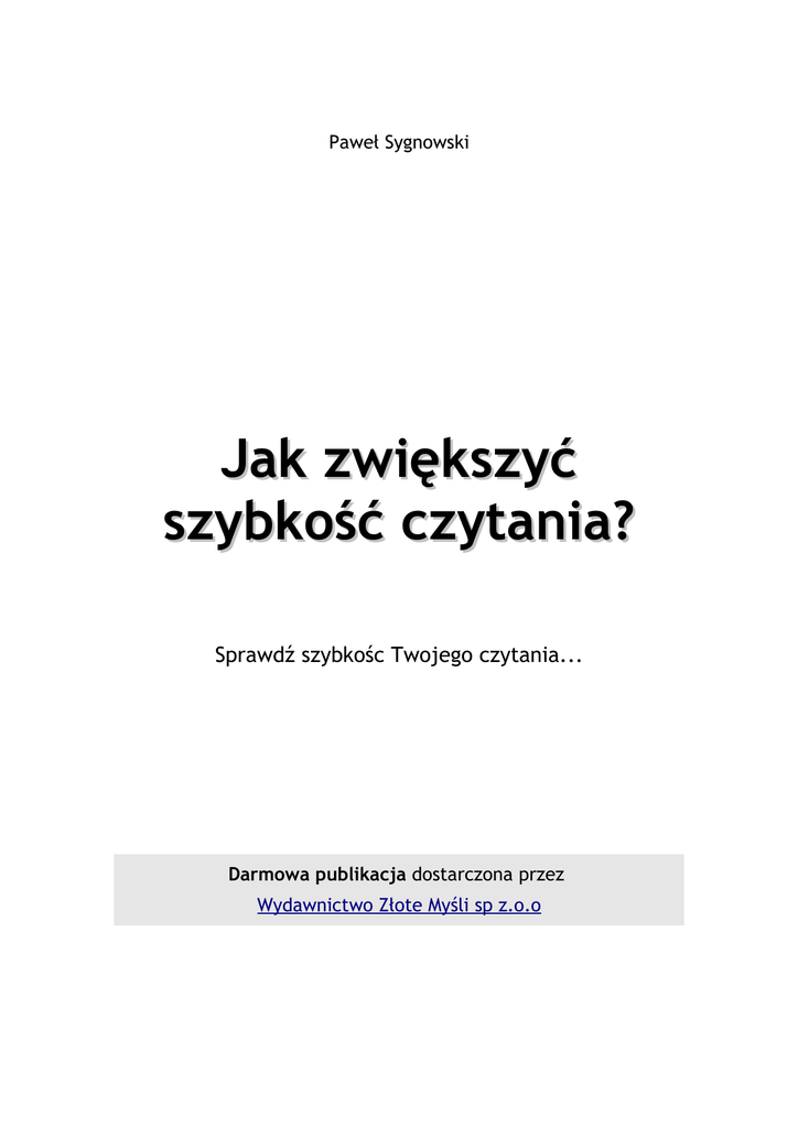 Paweł Sygnowski Jak zwiększyć szybkość czytania? Sprawdź szybkośc Twojego czytania... Darmowa publikacja dostarczona przez Wydawnictwo Złote Myśli sp z.o.o Ten ebook zawiera darmowy fragment publikacji "Szybkie czytanie dla wytrwałych" Darmowa publikacja dostarczona przez PatBank.pl - bank banków Copyright by Złote Myśli & Paweł Sygnowski, rok 2008 Autor: Paweł Sygnowski Tytuł: Szybkie czytanie dla wytrwałych Data: 07.09.2016 Złote Myśli Sp. z o.o. ul. Kościuszki 1c 44-100 Gliwice www.zlotemysli.pl email: [email protected] Niniejsza publikacja może być kopiowana, oraz dowolnie rozprowadzana tylko i wyłącznie w formie dostarczonej przez Wydawcę. Zabronione są jakiekolwiek zmiany w zawartości publikacji bez pisemnej zgody Wydawcy. Zabrania się jej odsprzedaży, zgodnie z regulaminem Wydawnictwa Złote Myśli. Autor oraz Wydawnictwo Złote Myśli dołożyli wszelkich starań, by zawarte w tej książce informacje były kompletne i rzetelne. Nie biorą jednak żadnej odpowiedzialności ani za ich wykorzystanie, ani za związane z tym ewentualne naruszenie praw patentowych lub autorskich. Autor oraz Wydawnictwo Złote Myśli nie ponoszą również żadnej odpowiedzialności za ewentualne szkody wynikłe z wykorzystania informacji zawartych w książce. Wszelkie prawa zastrzeżone. All rights reserved. Powered by TCPDF (www.tcpdf.org) SPIS TREŚCI WSTĘP......................................................................................4 TEST........................................................................................7 Test szybkości czytania i stopnia rozumienia tekstu..........................7 WYNIK TESTU, CZYLI GDZIE JESTEŚ DZISIAJ?.....................................12 UŚWIADOMIŁEŚ WŁAŚNIE SOBIE, ŻE.................................................14 PRAKTYCZNE ĆWICZENIA..............................................................16 Test szybkości czytania i stopnia rozumienia tekstu – część 2............21 Wynik = cud..........................................................................25 JAK ZWIĘKSZYĆ SZYBKOŚĆ CZYTANIA? – kliknij po ”Szybkie czytanie dla wytrwałych” Paweł Sygnowski ● str. 4 Wstęp Na polskim rynku wydawniczym co roku pojawia się ponad 30 tysięcy nowych książek. Ponadto, co roku ma miejsce kilka premier nowych tytułów prasowych. Ilość wszystkich dzienników, czasopism i gazet w pobliskim kiosku, może już śmiało konkurować rozmiarami z biblioteką. Ale to jeszcze nie wszystko. Czymkolwiek się zajmujesz, czy to w czasie pracy, czy poza nią, to zawsze i wszędzie potrzebujesz informacji. W końcu żyjemy w świecie informacji i obecnie wygrywa ten, kto posiada ich najwięcej i potrafi je odpowiednio wykorzystać. Zbierając cały czas nowe informacje, trzeba sobie w pewnym momencie powiedzieć: dosyć, mam już ich wystarczająco dużo. Pora teraz je wykorzystać. Wtedy człowiek spostrzega, że potrzebuje ich coraz więcej. Zaczyna rozumieć doskonale, że w świecie skomplikowanej i nieustannej zmiany, wczorajsze informacje dzisiaj już nie wystarczą. Trzeba ciągle zdobywać nowe informacje, aby być na bieżąco. Stojąc w obliczu ciągle rosnącej ilości informacji do przyswojenia, stajemy się bardzo łatwym celem dla tzw. zalewu informacji, czyli sytuacji, w której nie potrafimy z dostępnych nam informacji Copyright by Wydawnictwo Złote Myśli & Paweł Sygnowski JAK ZWIĘKSZYĆ SZYBKOŚĆ CZYTANIA? – kliknij po ”Szybkie czytanie dla wytrwałych” Paweł Sygnowski ● str. 5 wyselekcjonować tych, które są nam aktualnie potrzebne. Zwykle kończy się to w ten sposób, że przyswajamy kompletnie nieprzydatne nam informacje. Jest to zjawisko powszechne, które jest i będzie. A właśnie, co będzie dalej? Prawo Moore`a będące wyznacznikiem epoki informacji, w której żyjemy, mówi, że ilość dostępnych informacji na świecie ulega podwojeniu co 18 miesięcy. Co to oznacza? Mniej więcej tyle, że za półtora roku pobliski kiosk z gazetami będzie ponad dwa razy większy niż obecnie; że będzie w nim dwa razy więcej gazet, dwa razy więcej tytułów prasowych do kupienia i przeczytania. Mniej więcej tyle, że będzie dwa razy więcej informacji do przyswojenia w dwa razy mniejszej ilości czasu. W tej sytuacji bardzo łatwo o chaos i zawrotną, bezmyślną gonitwę myśli w Twojej głowie, a to oznacza zawodową i często także prywatną klęskę. Jakie jest rozwiązanie tego problemu? Rozwiązaniem tym jest umiejętność szybkiego czytania oraz znajomość technik zapamiętywania. Szybkie czytanie gwarantuje zdolność szybkiego i umiejętnego wyszukiwania potrzebnych informacji oraz szybkie ich przyswajanie, a znajomość technik zapamiętywania umożliwia Copyright by Wydawnictwo Złote Myśli & Paweł Sygnowski JAK ZWIĘKSZYĆ SZYBKOŚĆ CZYTANIA? – kliknij po ”Szybkie czytanie dla wytrwałych” Paweł Sygnowski ● str. 6 trwałe zapamiętanie wszystkich tych informacji, które aktualnie są lub mogą być dla Ciebie potrzebne w najbliższej przyszłości oraz przypomnienie ich sobie w dowolnie wybranym momencie. Umiejętność szybkiego czytania będziesz mógł zdobyć poprzez ebook pt. „Szybkie czytanie dla wytrwałych” [http://szybkieczytanie.zlotemysli.pl]. A znajomość technik zapamiętywania zdobędziesz korzystając z ebooka pt. „Szybka nauka wytrwałych” [http://szybka-nauka.zlotemysli.pl]. Copyright by Wydawnictwo Złote Myśli & Paweł Sygnowski dla JAK ZWIĘKSZYĆ SZYBKOŚĆ CZYTANIA? – kliknij po ”Szybkie czytanie dla wytrwałych” Paweł Sygnowski str. 7 ● Test Zapraszam Cię teraz na mały eksperyment. Poniżej znajduje się proste ćwiczenie, które ma za zadanie uświadomić Ci, jak ważna i potrzebna w Twoim indywidualnym przypadku jest umiejętność szybkiego czytania. Powtórzę jeszcze raz, że w ciągu roku wychodzi na polskim rynku wydawniczym ponad 30 tysięcy nowych tytułów. Każdego dnia w Twoim kiosku 