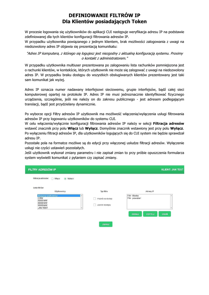 DEFINIOWANIE FILTRÓW IP Dla Klientów posiadających Token