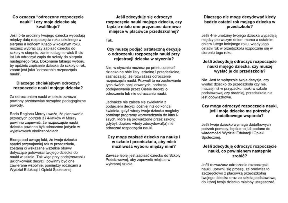 Co oznacza “odroczone rozpoczęcie nauki“ i czy moje dziecko się kwalifikuje? Jeśli 5-te urodziny twojego dziecka wypadają między datą rozpoczęcia roku szkolnego w sierpniu a końcem lutego w kolejnym roku, możesz wybrać czy zapisać dziecko do szkoły w sierpniu, zanim osiągnie wiek 5-ciu lat lub odroczyć zapis do szkoły do sierpnia następnego roku. Dokonanie takiego wyboru, by opóźnić zapisanie dziecka do szkoły o rok, znane jest jako “odroczenie rozpoczęcia nauki“. Dlaczego chciał(a)bym odroczyć rozpoczęcie nauki mojego dziecka? Za odroczeniem nauki w szkole zawsze powinny przemawiać rozsądne pedagogiczne powody. Rada Regionu Moray uważa, że planowanie przyszłych potrzeb 3 i 4-latków w Moray powinno zapewnić, że rozpoczęcie nauki dziecka powinno być odroczone jedynie w wyjątkowych okolicznościach. Biorąc pod uwagę fakt, że twoje dziecko spędzi przynajmniej rok w przedszkolu, zostaną ci wskazane wszelkie obawy dotyczące gotowości twojego dziecka do nauki w szkole. Tak więc przy podejmowaniu jakichkolwiek decyzji, powinny być one zawierane wspólnie, pomiędzy rodzicami a Wydział Edukacji i Opieki Społecznej. Jeśli zdecyduję się odroczyć rozpoczęcie nauki mojego dziecka, czy będzie miało ono przyznane darmowe miejsce w placówce przedszkolnej? Tak. Czy muszę podjąć ostateczną decyzję o odroczeniu rozpoczęcia nauki przy rejestracji dziecka w styczniu? Nie, w styczniu możesz po prostu zapisać dziecko na obie listy, szkolną i przedszkolną, zaznaczając, że rozważasz odroczenie rozpoczęcia nauki. Pozwoli to na zachowanie tych dwóch opcji otwartych, podczas podejmowania przez Ciebie decyzji o odroczeniu lub nie odraczaniu nauki. Jednakże nie zaleca się zwlekania z podjęciem decyzji później niż do końca kwietnia, gdyż wtedy twoje dziecko mogłoby pominąć programy wprowadzania do klas Iszych, które są prowadzone przez szkoły; gdybyś dopiero wtedy zdecydował(a) nie odraczać rozpoczęcia nauki. Czy mogę zapisać dziecko na naukę i w szkole i przedszkolu, aby mieć możliwość wyboru między nimi? Zawsze lepiej jest zapisać dziecko do Szkoły Podstawowej, aby zapewnić miejsce w wybranej szkole. Dlaczego nie mogę decydować kiedy będzie ostatni rok mojego dziecka w przedszkolu? Jeśli 4-te urodziny twojego dziecka wypadają między pierwszym dniem marca a ostatnim dniem lutego kolejnego roku, wtedy jego ostatni rok w przedszkolu rozpocznie się w sierpniu tego roku. Jeśli zdecyduję odroczyć rozpoczęcie nauki mojego dziecka, czy muszę wysłać je do przedszkola? Nie. Jest to wyłącznie twoja decyzja, czy wysłać dziecko do przedszkola czy nie. Inaczej niż w przypadku nauki w szkole podstawowej czy średniej, przedszkole nie jest obowiązkowe. Czy mogę odroczyć rozpoczęcie nauki, jeśli moje dziecko ma potrzeby dodatkowego wsparcia? Jeśli twoje dziecko wymaga dodatkowych potrzeb pomocy, będzie to już podane do wiadomości Wydział Edukacji i Opieki Społecznej. Jeśli zdecyduję odroczyć rozpoczęcie nauki, co powinienem następnie zrobić? Jeśli rozważasz odroczenie rozpoczęcia nauki, upewnij się proszę, że omówisz to szczegółowo z placówką przedszkolną twojego dziecka oraz ze szkołą podstawową, do której twoje dziecko miałoby uczęszczać. W CELU UZYSKANIA DALSZYCH INFORMACJI NALEŻY ZGŁOSIĆ SIĘ DO DYREKTORA SZKOŁY LUB DYREKTORA TWOJEGO LOKALNEGO CENTRUM PRZEDSZKOLNEGO ODROCZONE ROZPOCZĘCIE NAUKI W SZKOLE PODSTAWOWEJ (ang. DEFERRED ENTRY TO PRIMARY SCHOOL) INFORMACJE DLA RODZICÓW I OPIEKUNÓW LUB WYDZIAŁ EDUKACJI I OPIEKI SPOŁECZNEJ (ang. Education & Social Care) opracowane przez TEL. 01343 563374 Email [email protected] The Moray Council High Street ELGIN IV30 1BX www.moray.gov.uk WYDZIAŁ EDUKACJI I OPIEKI SPOŁECZNEJ 2012 (wydanie powtórzone czerwiec 2012) uczyć się, jak żyć, żyć, aby się uczyć Ta ulotka jest jedną z serii ulotek dla rodziców i opiekunów Inspiruje – Włącza – Polepsza