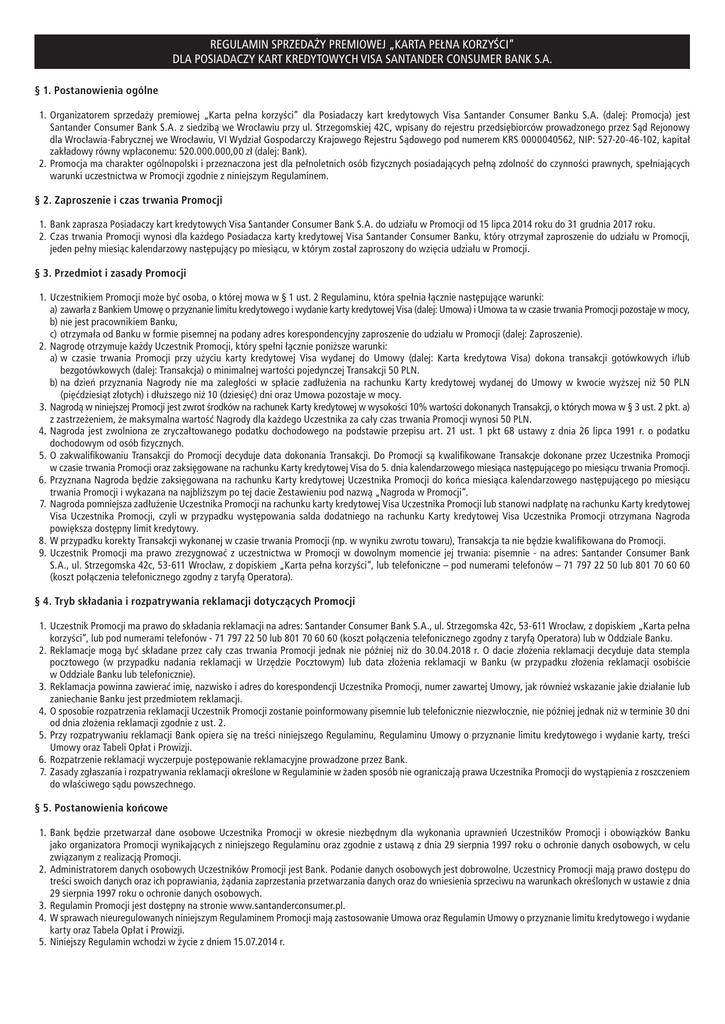 Regulamin sprzedaży premiowej „Karta pełna korzyści” dla Posiadaczy kart kredytowych Visa Santander Consumer Bank S.A. § 1. Postanowienia ogólne 1.Organizatorem sprzedaży premiowej „Karta pełna korzyści” dla Posiadaczy kart kredytowych Visa Santander Consumer Banku S.A. (dalej: Promocja) jest Santander Consumer Bank S.A. z siedzibą we Wrocławiu przy ul. Strzegomskiej 42C, wpisany do rejestru przedsiębiorców prowadzonego przez Sąd Rejonowy dla Wrocławia-Fabrycznej we Wrocławiu, VI Wydział Gospodarczy Krajowego Rejestru Sądowego pod numerem KRS 0000040562, NIP: 527-20-46-102, kapitał zakładowy równy wpłaconemu: 520.000.000,00 zł (dalej: Bank). 2.Promocja ma charakter ogólnopolski i przeznaczona jest dla pełnoletnich osób fizycznych posiadających pełną zdolność do czynności prawnych, spełniających warunki uczestnictwa w Promocji zgodnie z niniejszym Regulaminem. § 2. Zaproszenie i czas trwania Promocji 1.Bank zaprasza Posiadaczy kart kredytowych Visa Santander Consumer Bank S.A. do udziału w Promocji od 15 lipca 2014 roku do 31 grudnia 2017 roku. 2.Czas trwania Promocji wynosi dla każdego Posiadacza karty kredytowej Visa Santander Consumer Banku, który otrzymał zaproszenie do udziału w Promocji, jeden pełny miesiąc kalendarzowy następujący po miesiącu, w którym został zaproszony do wzięcia udziału w Promocji. § 3. Przedmiot i zasady Promocji 1.Uczestnikiem Promocji może być osoba, o której mowa w § 1 ust. 2 Regulaminu, która spełnia łącznie następujące warunki: a)zawarła z Bankiem Umowę o przyznanie limitu kredytowego i wydanie karty kredytowej Visa (dalej: Umowa) i Umowa ta w czasie trwania Promocji pozostaje w mocy, b)nie jest pracownikiem Banku, c)otrzymała od Banku w formie pisemnej na podany adres korespondencyjny zaproszenie do udziału w Promocji (dalej: Zaproszenie). 2.Nagrodę otrzymuje każdy Uczestnik Promocji, który spełni łącznie poniższe warunki: a)w czasie trwania Promocji przy użyciu karty kredytowej Visa wydanej do Umowy (dalej: Karta kredytowa Visa) dokona transakcji gotówkowych i/lub bezgotówkowych (dalej: Transakcja) o minimalnej wartości pojedynczej Transakcji 50 PLN. b)na dzień przyznania Nagrody nie ma zaległości w spłacie zadłużenia na rachunku Karty kredytowej wydanej do Umowy w kwocie wyższej niż 50 PLN (pięćdziesiąt złotych) i dłuższego niż 10 (dziesięć) dni oraz Umowa pozostaje w mocy. 3.Nagrodą w niniejszej Promocji jest zwrot środków na rachunek Karty kredytowej w wysokości 10% wartości dokonanych Transakcji, o których mowa w § 3 ust. 2 pkt. a) z zastrzeżeniem, że maksymalna wartość Nagrody dla każdego Uczestnika za cały czas trwania Promocji wynosi 50 PLN. 4.Nagroda jest zwolniona ze zryczałtowanego podatku dochodowego na podstawie przepisu art. 21 ust. 1 pkt 68 ustawy z dnia 26 lipca 1991 r. o podatku dochodowym od osób fizycznych. 5.O zakwalifikowaniu Transakcji do Promocji decyduje data dokonania Transakcji. Do Promocji są kwalifikowane Transakcje dokonane przez Uczestnika Promocji w czasie trwania Promocji oraz zaksięgowane na rachunku Karty kredytowej Visa do 5. dnia kalendarzowego miesiąca następującego po miesiącu trwania Promocji. 6.Przyznana Nagroda będzie zaksięgowana na rachunku Karty kredytowej Uczestnika Promocji do końca miesiąca kalendarzowego następującego po miesiącu trwania Promocji i wykazana na najbliższym po tej dacie Zestawieniu pod nazwą „Nagroda w Promocji”. 7. Nagroda pomniejsza zadłużenie Uczestnika Promocji na rachunku karty kredytowej Visa Uczestnika Promocji lub stanowi nadpłatę na rachunku Karty kredytowej Visa Uczestnika Promocji, czyli w przypadku występowania salda dodatniego na rachunku Karty kredytowej Visa Uczestnika Promocji otrzymana Nagroda powiększa dostępny limit kredytowy. 8.W przypadku korekty Transakcji wykonanej w czasie trwania Promocji (np. w wyniku zwrotu towaru), Transakcja ta nie będzie kwalifikowana do Promocji. 9.Uczestnik Promocji ma prawo zrezygnować z uczestnictwa w Promocji w dowolnym momencie jej trwania: pisemnie - na adres: Santander Consumer Bank S.A., ul. Strzegomska 42c, 53-611 Wrocław, z dopiskiem „Karta pełna korzyści”, lub telefoniczne – pod numerami telefonów – 71 797 22 50 lub 801 70 60 60 (koszt połączenia telefonicznego zgodny z taryfą Operatora). § 4. Tryb składania i rozpatrywania reklamacji dotyczących Promocji 1. Uczestnik Promocji ma prawo do składania reklamacji na adres: Santander Consumer Bank S.A., ul. Strzegomska 42c, 53-611 Wrocław, z dopiskiem „Karta pełna korzyści”, lub pod numerami telefonów - 71 797 22 50 lub 801 70 60 60 (koszt połączenia telefonicznego zgodny z taryfą Operatora) lub w Oddziale Banku. 2.Reklamacje mogą być składane przez cały czas trwania Promocji jednak nie później niż do 30.04.2018 r. O dacie złożenia reklamacji decyduje data stempla pocztowego (w przypadku nadania reklamacji w Urzędzie Pocztowym) lub data złożenia reklamacji w Banku (w przypadku złożenia reklamacji osobiście w Oddziale Banku lub telefonicznie). 3.Reklamacja powinna zawierać imię, nazwisko i adres do korespondencji Uczestnika Promocji, numer zawartej Umowy, jak również wskazanie jakie działanie lub zaniechanie Banku jest przedmiotem reklamacji. 4. O sposobie rozpatrzenia reklamacji Uczestnik Promocji zostanie poinformowany pisemnie lub telefonicznie niezwłocznie, nie później jednak niż w terminie 30 dni od dnia złożenia reklamacji zgodnie z ust. 2. 5.Przy rozpatrywaniu reklamacji Bank opiera się na treści niniejszego Regulaminu, Regulaminu Umowy o przyznanie limitu kredytowego i wydanie karty, treści Umowy oraz Tabeli Opłat i Prowizji. 6. Rozpatrzenie reklamacji wyczerpuje postępowanie reklamacyjne prowadzone przez Bank. 7. Zasady zgłaszania i rozpatrywania reklamacji określone w Regulaminie w żaden sposób nie ograniczają prawa Uczestnika Promocji do wystąpienia z roszczeniem do właściwe