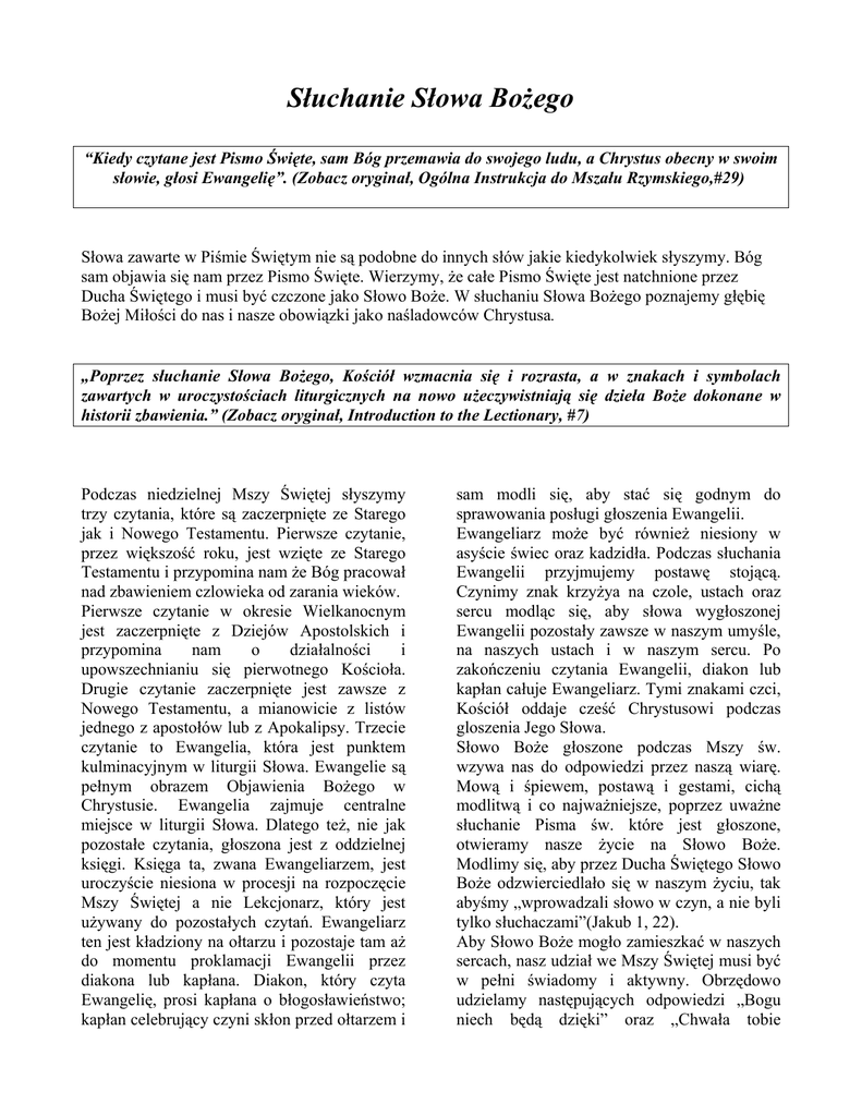 Słuchanie Słowa Bożego “Kiedy czytane jest Pismo Święte, sam Bóg przemawia do swojego ludu, a Chrystus obecny w swoim słowie, głosi Ewangelię”. (Zobacz oryginał, Ogólna Instrukcja do Mszału Rzymskiego,#29) Słowa zawarte w Piśmie Świętym nie są podobne do innych słów jakie kiedykolwiek słyszymy. Bóg sam objawia się nam przez Pismo Święte. Wierzymy, że całe Pismo Święte jest natchnione przez Ducha Świętego i musi być czczone jako Słowo Boże. W słuchaniu Słowa Bożego poznajemy głębię Bożej Miłości do nas i nasze obowiązki jako naśladowców Chrystusa. „Poprzez słuchanie Słowa Bożego, Kościół wzmacnia się i rozrasta, a w znakach i symbolach zawartych w uroczystościach liturgicznych na nowo użeczywistniają się dzieła Boże dokonane w historii zbawienia.” (Zobacz oryginał, Introduction to the Lectionary, #7) Podczas niedzielnej Mszy Świętej słyszymy trzy czytania, które są zaczerpnięte ze Starego jak i Nowego Testamentu. Pierwsze czytanie, przez większość roku, jest wzięte ze Starego Testamentu i przypomina nam że Bóg pracował nad zbawieniem czlowieka od zarania wieków. Pierwsze czytanie w okresie Wielkanocnym jest zaczerpnięte z Dziejów Apostolskich i przypomina nam o działalności i upowszechnianiu się pierwotnego Kościoła. Drugie czytanie zaczerpnięte jest zawsze z Nowego Testamentu, a mianowicie z listów jednego z apostołów lub z Apokalipsy. Trzecie czytanie to Ewangelia, która jest punktem kulminacyjnym w liturgii Słowa. Ewangelie są pełnym obrazem Objawienia Bożego w Chrystusie. Ewangelia zajmuje centralne miejsce w liturgii Słowa. Dlatego też, nie jak pozostałe czytania, głoszona jest z oddzielnej księgi. Księga ta, zwana Ewangeliarzem, jest uroczyście niesiona w procesji na rozpoczęcie Mszy Świętej a nie Lekcjonarz, który jest używany do pozostałych czytań. Ewangeliarz ten jest kładziony na ołtarzu i pozostaje tam aż do momentu proklamacji Ewangelii przez diakona lub kapłana. Diakon, który czyta Ewangelię, prosi kapłana o błogosławieństwo; kapłan celebrujący czyni skłon przed ołtarzem i sam modli się, aby stać się godnym do sprawowania posługi głoszenia Ewangelii. Ewangeliarz może być również niesiony w asyście świec oraz kadzidła. Podczas słuchania Ewangelii przyjmujemy postawę stojącą. Czynimy znak krzyżya na czole, ustach oraz sercu modląc się, aby słowa wygłoszonej Ewangelii pozostały zawsze w naszym umyśle, na naszych ustach i w naszym sercu. Po zakończeniu czytania Ewangelii, diakon lub kapłan całuje Ewangeliarz. Tymi znakami czci, Kościół oddaje cześć Chrystusowi podczas gloszenia Jego Słowa. Słowo Boże głoszone podczas Mszy św. wzywa nas do odpowiedzi przez naszą wiarę. Mową i śpiewem, postawą i gestami, cichą modlitwą i co najważniejsze, poprzez uważne słuchanie Pisma św. które jest głoszone, otwieramy nasze życie na Słowo Boże. Modlimy się, aby przez Ducha Świętego Słowo Boże odzwierciedlało się w naszym życiu, tak abyśmy „wprowadzali słowo w czyn, a nie byli tylko słuchaczami”(Jakub 1, 22). Aby Słowo Boże mogło zamieszkać w naszych sercach, nasz udział we Mszy Świętej musi być w pełni świadomy i aktywny. Obrzędowo udzielamy następujących odpowiedzi „Bogu niech będą dzięki” oraz „Chwała tobie Chryste.” Śpiewając psalm responsoryjny odpowiadamy na pierwsze czytanie a przed czytaniem Ewangelii śpiewamy „Alleluja” Z uwagą sluchamy Słowa Bożego gloszonego przez lektora, diakona lub kaplana. Słuchamy uważnie, tak jak gdyby sam Chrystus stał przy ambonce; bowiem rzeczywiście, kiedy jest czytane Pismo Święte to sam Bóg przemawia do nas. Bardzo pomocnym jest przygotowanie sie do owocnego słuchania Pisma Swietego. Ojciec Święty Jan Paweł II w instrukcji o Dniu Pańskim “Dies Domini” wzywa „wszystkich biorących udział w Eucharystii, to jest kapłanów, ministrów liturgii oraz wiernych…do przygotowywania się do liturgii poprzez wcześniejszą refleksję nad Słowem Bożym, które ma być głoszone podczas Eucharystii”. Ojciec Śwęty dodaje, że jeśli tego nie zrobimy, “to ciężko będzie, aby tylko samo czytanie Słowa Bożego podczas liturgii wydało oczekiwane owoce.” (n.40) Liturgia Słowa Bożego zawiera także homilię, której zadaniem jest pomoc w lepszym zrozumieniu Słowa Bożego i tekstów Mszy Świętej, tak abyśmy mogli w lepszy sposób wprowadzić Słowo Boże i naukę zawartą w tekstach Mszy Świętej w nasze życie. Homilia nie może być pominięta w niedzielę lub święta, ponieważ jest liturgiczną funkcją sprawowaną przez kapłana lub diakona. Po homilii następuje wyznanie wiary, tak zwane Credo, po którym następuje modlitwa wiernych kończąca Liturgię Słowa, a podczas której wierni, natchnieni Słowem Bożym, modlą się w potrzebach świata, Kościoła Powszechnego oraz swojej parafii. Stół Słowa Bożego oraz stół Eucharystyczny żywi duchowo wiernych członków Kościoła. „W Słowie Bożym zapowiadane jest przymierze Boże a w Eucharystii nowe i wieczne przymierze jest odnawiane” (Zobacz oryginał, Intorduction to the Lectonary, n. 10). Słowo Boże prowadzi nas do stolu Eucharystycznego, przez który mamy dostęp to wielkich dzieł Bożych, a przede wszystkim zbawczej śmierci i zmartwychwstania Jezusa. Przez nasze zjednoczenie z Jezusem w Jego ofierze dla Ojca jesteśmy głębiej włączeni w życie Boże. Rola ciszy Ogólna Instrukcja do Mszału Rzymskiego wzywa do momentow ciszy podczas Mszy Świętej, a szczególnie podczas Liturgii Słowa: „Liturgia Słowa powinna być sprawowana w taki sposób, aby była możliwość medytacji. Dlatego należy unikać wszelkiego pośpiechu, ktory utrudnia skupienie. Wskazane są krótkie momenty ciszy podczas których, za pośrednictwem Ducha Świętego, Słowo Boże będzie odebrane sercem a odpowiedź na nie będzie udzielona przez modlitwę (Zobac