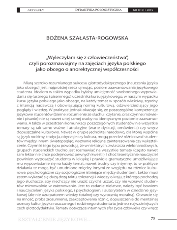 ARTYKUŁY DYDAKTYKA POLONISTYCZNA NR 1(10) / 2015 BOŻENA SZAŁASTA-ROGOWSKA „Wyleczyłam się z człowieczeństwa”, czyli porozmawiajmy na zajęciach języka polskiego jako obcego o anorektycznej współczesności Miarą szeroko rozumianego sukcesu glottodydaktycznego (nauczania języka jako obcego) jest, najprościej rzecz ujmując, poziom zaawansowania językowego studenta. Ideałem w takim wypadku byłaby umiejętność swobodnego wypowiadania się (ustnego i pisemnego) uczestnika kursu językowego, w naszym wypadku kursu języka polskiego jako obcego, na każdy temat w sposób właściwy, zgodny z intencją nadawczą i obowiązującą normą kulturową, odzwierciedlający jego poglądy i wiedzę. W praktyce jednak okazuje się, że poszczególne kompetencje językowe studentów (bierne: rozumienie ze słuchu i czytanie, oraz czynne: mówienie i pisanie) nie są nawet u tej samej osoby na identycznym poziomie zaawansowania. A także w przestrzeni komunikacji poszczególnych studentów nie wszystkie tematy są tak samo ważne i atrakcyjne (warte dyskusji, omówienia) czy wręcz dopuszczalne kulturowo. Nawet w grupie jednolitej narodowo, dla której wspólne są język rodzimy, tradycja, obyczaje czy kultura, mogą przecież różnicować studentów między innymi światopogląd, wyznanie religijne, zainteresowania czy wykształcenie. Czynniki tego typu powodują, że w niektórych, zwłaszcza wielonarodowych, grupach studenckich trudno jest rozmawiać na wszystkie tematy (często nawet sam lektor nie chce podejmować pewnych kwestii). I choć teoretycznie nauczyciel powinien wyposażyć studenta w leksykę i prawidła gramatyczne umożliwiające mu wypowiadanie się na każdy temat, nawet trudny czy intymny, to w praktyce działania te mogą być utrudnione między innymi ze względu na różnice kulturowe, psychologiczne czy socjologiczne istniejące między studentami. Lektor musi zatem wykazać się dużą dozą taktu, tolerancji i wiedzy o kraju, z którego pochodzą jego słuchacze, aby niechcący nie urazić czyichś uczuć, czy nie wprawić studentów mimowolnie w zażenowanie. Jest to zadanie niełatwe, należy być bowiem i nauczycielem języka polskiego, i psychologiem, i autorytetem w dziedzinie językowej (ale nie uzurpatorem wiedzy totalnej czy wyrocznią moralną). Otwarcie się na inność, próba zrozumienia, zaakceptowania różnic, dopuszczenie do mentalnej osmozy kultur języka nauczanego i rodzimego studenta to jedne z najważniejszych cech glottodydaktyka. Tematy dotyczące intymnych sfer życia człowieka czy wręcz KSZTAŁCENIE JĘZYKOWE… 73 Bożena Szałasta-Rogowska tabuizowane1, do których zaliczyłabym na przykład starość, ciężką chorobę, śmierć, miłość i seks czy różnego rodzaju przemoc powinny być omawiane na zajęciach języka polskiego jako obcego z ostrożnością, nieautorytarnie i bez przymusu2. Czasem zdarza się przecież, że student dysponuje odpowiednim słownictwem, konstrukcjami językowymi, zna reguły gramatyczne, ale nie chce wziąć udziału w dyskusji z powodów osobistych czy kulturowych. Pomimo tych barier warto jednak podjąć wysiłek glottodydaktyczny i wyposażyć studenta między innymi w słownictwo, frazeologię czy kontekst kulturowy (wskazać także obszary tabu w kulturze polskiej, aby student nie popełniał gaf towarzyskich), które umożliwią mu niekoniecznie wypowiedzi publiczne na tematy trudne, ale porozumienie się z drugą osobą w sytuacji prywatnej. Wymienione powyżej tematy tabuizowane zawierają zazwyczaj treści, o których nawet w języku rodzimym trudno jest się wypowiadać płynnie, odważnie, szczerze i bez emocji. Jak pisze Anna Dąbrowska: Zjawisko tabu jest współcześnie jednym z ważniejszych zagadnień, jakimi powinna zajmować się lingwistyka kulturowa. Jako zakaz kulturowy lub językowy istnieje chyba we wszystkich społeczeństwach. Tabu kulturowe pełni istotne funkcje, strzegąc norm regulujących życie wspólnoty. Wielu badaczy podkreśla, że współczesność sprzyja nierespektowaniu (by nie rzec – łamaniu) tabu. Stwierdzenie, że nie ma już żadnych tabu, jest jednak trudne do zaakceptowania, ponieważ badania pokazują zgoła odmienny obraz. Respektowanie tabu zależy od tego, czy dotyczy ono sfery prywatnej czy też oficjalnej. Polacy niechętnie poruszają tematy dotyczące np. życia erotycznego, śmierci, spraw rodzinnych czy ciężkich chorób, jeśli dotyczą ich bezpośrednio. Natomiast z dużą przyjemnością o tym słuchają, gdy odnosi się to do innych, zwłaszcza znanych osób (aktorów, polityków, celebrytów). Ogromną rolę w naruszaniu tabu pełnią współczesne media – prasa, głównie kolorowa, telewizja, Internet3. Anna Dąbrowska i Malgorzata Pasieka tak piszą o tabu: „Tabu to, najprościej rzecz ujmując, kulturowy zakaz wykonywania jakichś czynności czy też pewnych zachowań – również językowych. Tabu językowe to zazwyczaj (społecznie usankcjonowany) zakaz wypowiadania pewnych wyrazów. W rozumieniu potocznym terminowi tabu dość automatycznie przypisywane jest wartościowanie ujemne. Stąd często spotykane przekonanie, że łamanie tabu jest pozytywne. Dotyczy to jednak tylko strefy publicznej (środki masowego przekazu). Inaczej jest w sferze prywatnej. (…) Pierwotnie występowały dwa składniki znaczenia wyrazu tabu: «święty» i «zakazany», we współczesności zaś przeważa drugi z nich – zakaz wewnętrzny jednostki lub grupy społecznej. W odniesieniu do tabu językowego chodzi o nieużywanie określonych wyrazów (wyrażeń), a nie o to, że na dany temat w ogóle się nie mówi”. Zob. A. Dąbrowska, M. Pasieka, O czym ma milczeć cudzoziemiec. Tematy i słownictwo nieobecne w podręcznikach języka polskiego jako obcego [w:] Tabu w języku i kulturze, red. A. Dąbrowska, Wrocław 2009, s. 243. 2 Agnieszka Tambor, pisząc o wykorzystaniu filmów w edukacji obcokrajowców, porusza też kwestię tabu. Auto