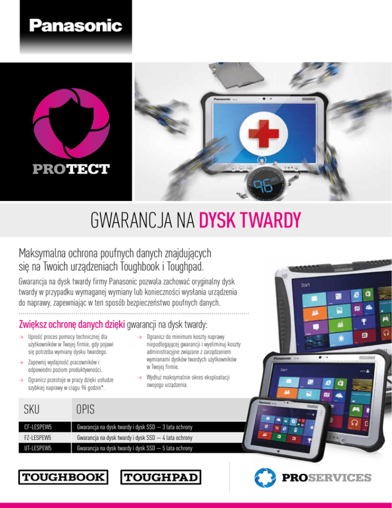 GWARANCJA NA DYSK TWARDY Maksymalna ochrona poufnych danych znajdujących się na Twoich urządzeniach Toughbook i Toughpad. Gwarancja na dysk twardy firmy Panasonic pozwala zachować oryginalny dysk twardy w przypadku wymaganej wymiany lub konieczności wysłania urządzenia do naprawy, zapewniając w ten sposób bezpieczeństwo poufnych danych. Zwiększ ochronę danych dzięki gwarancji na dysk twardy: →→ Uprość proces pomocy technicznej dla użytkowników w Twojej firmie, gdy pojawi się potrzeba wymiany dysku twardego. →→ Zapewnij wydajność pracowników i odpowiedni poziom produktywności. →→ Ogranicz przestoje w pracy dzięki usłudze szybkiej naprawy w ciągu 96 godzin*. →→ Ogranicz do minimum koszty naprawy niepodlegającej gwarancji i wyeliminuj koszty administracyjne związane z zarządzaniem wymianami dysków twardych użytkowników w Twojej firmie. →→ Wydłuż maksymalnie okres eksploatacji swojego urządzenia. SKU OPIS CF-LESPEW5 Gwarancja na dysk twardy i dysk SSD — 3 lata ochrony FZ-LESPEW5 Gwarancja na dysk twardy i dysk SSD — 4 lata ochrony UT-LESPEW5 Gwarancja na dysk twardy i dysk SSD — 5 lata ochrony PLAN PEŁNEJ OCHRONY GWARANCYJNEJ Standard (Plan 3-letni) Wady fabryczne Pełna aktualizacja sterowników producenta Wszelkie materiały, części i robocizna Czas naprawy wynoszący 96 godzin (w tym przewóz)1 Pomoc techniczna dostępna w wielu językach2 Gwarancja na dyski twarde i dyski SSD Sprzęt zastępczy na czas naprawy3 Wymiana urządzenia na urządzenie buforowe bez powodowania przerw w pracy3 Określony czas reakcji działu pomocy technicznej4 « « « « « « « « « Standard rozszerzony Zniszczenie podczas wypadku Zniszczenie podczas wypadku (Plan 5-letni) (Plan 3-letni) (Plan 5-letni) « « « « « « « « « « « « « « « « « « « « « « « « « « « « « « « « « Uszkodzenie baterii (1 rok) Pełna ochrona przed przypadkowym uszkodzeniem « « 5-letni plan serwisowy Wieloletnia zniżka 5 « 3-letni plan serwisowy Zakończone sukcesem w 90% przypadków przy zachowaniu należytej staranności 1 Dostępność: od godz. 08.00 do godz. 18.00 czasu środkowoeuropejskiego 2 Połączenia są odbierane najpóźniej po 7 sygnałach, a odpowiedzi na wiadomości e-mail są udzielane w ciągu godziny 4 Zniżka jest dostępna w miejscu zakupu 5 Dostępny na życzenie 3 DODATKOWE INFORMACJE NA TEMAT GWARANCJI Po skontaktowaniu się z Centrum serwisowym Panasonic... Przedstawiciel zidentyfikuje przyczynę niewłaściwego działania dysku twardego użytkownika i zorganizuje zapasowy dysk twardy, który zostanie nieodpłatnie przesłany. W przypadku urządzeń Toughbook i Toughpad objętych niniejszą gwarancją przysługuje prawo wymiany dysków twardych maksymalnie 5% całkowitej liczby urządzeń Toughbook w ciągu roku. Jeżeli liczba wymienionych dysków twardych przekroczy 5%, firma Panasonic zastrzega sobie prawo do zbadania przyczyn awarii. « PROCEDURA GWARANCYJNA 01. W przypadku reklamacji i wady dysku twardego (lub dysku SSD) należy skontaktować się z działem pomocy technicznej firmy Panasonic ([email protected]). 02. W przypadku usług objętych niniejszą umową klienci muszą przekazać działowi pomocy technicznej firmy Panasonic dane firmy oraz pełną nazwę modelu i numer seryjny urządzenia. 03. Po zweryfikowaniu informacji dotyczących gwarancji przez nasz dział pomocy technicznej zapasowy dysk twardy (lub SSD) zostanie wysłany kurierem firmy Panasonic bezpośrednio na adres podany pracownikom działu pomocy technicznej. Więcej informacji można znaleźć w warunkach gwarancji dostępnych na stronie www.toughbook.eu/proservices 04. Uwaga: wysyłka poza UE podlega opłatom. Jeżeli problem nie zostanie rozwiązany po zainstalowaniu zapasowego dysku twardego, urządzenie będzie musiało zostać odesłane do Centrum serwisowego Panasonic w celu przeprowadzenia naprawy. Zapasowy dysk twardy (który nie był przyczyną usterki) również musi zostać zwrócony do Centrum serwisowego Panasonic, aby firma nie została obciążona kosztami wymiany dysku twardego. Użytkownik może zachować oryginalny dysk twardy zgodnie z warunkami niniejszej gwarancji. Naprawy części innych niż dysk twardy w ramach gwarancji są objęte Standardową gwarancją firmy Panasonic. Pełny tekst warunków gwarancji można znaleźć pod adresem www.toughbook.eu/proservices *Starania przy zachowaniu należytej staranności zakończone sukcesem w 90% przypadków. Uwaga: wysyłka poza UE podlega opłatom. Należy skontaktować się z działem pomocy technicznej firmy Panasonic pod adresem: [email protected]