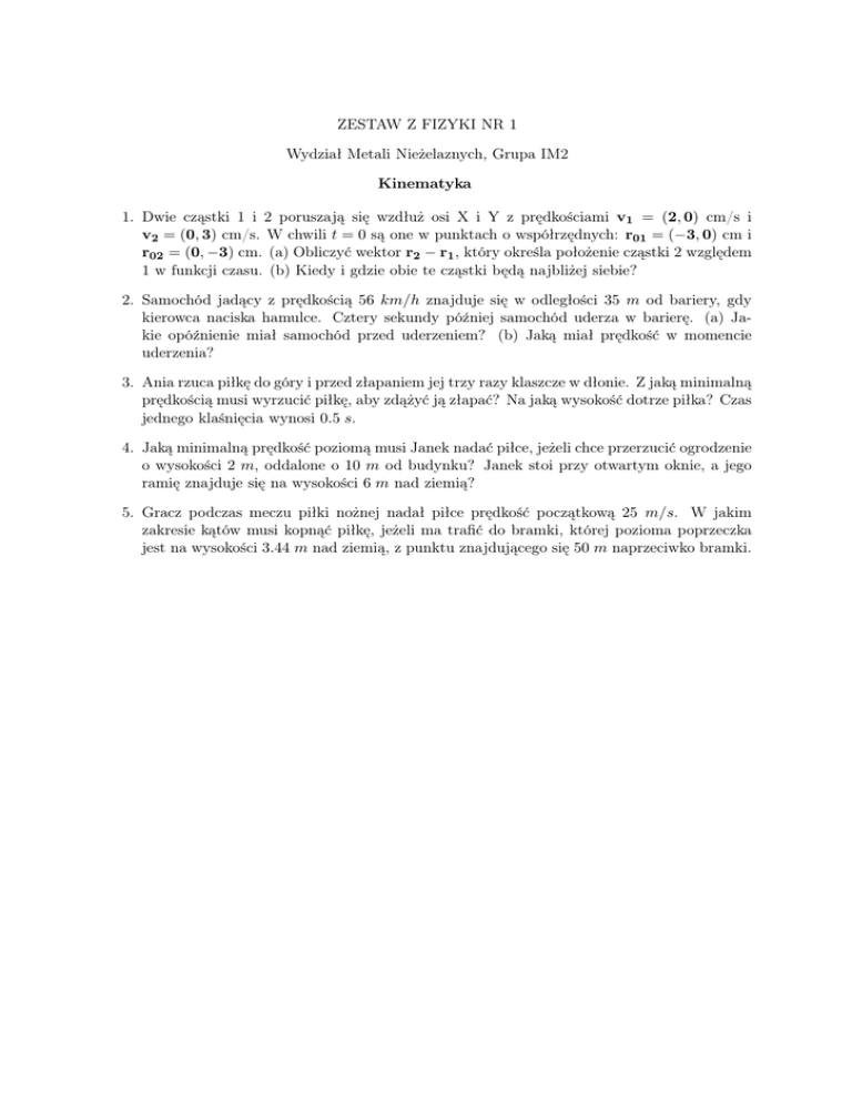 ZESTAW Z FIZYKI NR 1 Wydział Metali Nieżelaznych, Grupa IM2 Kinematyka 1. Dwie cząstki 1 i 2 poruszają się wzdłuż osi X i Y z prędkościami v1 = (2, 0) cm/s i v2 = (0, 3) cm/s. W chwili t = 0 są one w punktach o współrzędnych: r01 = (−3, 0) cm i r02 = (0, −3) cm. (a) Obliczyć wektor r2 − r1 , który określa położenie cząstki 2 względem 1 w funkcji czasu. (b) Kiedy i gdzie obie te cząstki będą najbliżej siebie? 2. Samochód jadący z prędkością 56 km/h znajduje się w odległości 35 m od bariery, gdy kierowca naciska hamulce. Cztery sekundy później samochód uderza w barierę. (a) Jakie opóźnienie miał samochód przed uderzeniem? (b) Jaką miał prędkość w momencie uderzenia? 3. Ania rzuca piłkę do góry i przed złapaniem jej trzy razy klaszcze w dłonie. Z jaką minimalną prędkością musi wyrzucić piłkę, aby zdążyć ją złapać? Na jaką wysokość dotrze piłka? Czas jednego klaśnięcia wynosi 0.5 s. 4. Jaką minimalną prędkość poziomą musi Janek nadać piłce, jeżeli chce przerzucić ogrodzenie o wysokości 2 m, oddalone o 10 m od budynku? Janek stoi przy otwartym oknie, a jego ramię znajduje się na wysokości 6 m nad ziemią? 5. Gracz podczas meczu piłki nożnej nadał piłce prędkość początkową 25 m/s. W jakim zakresie kątów musi kopnąć piłkę, jeżeli ma trafić do bramki, której pozioma poprzeczka jest na wysokości 3.44 m nad ziemią, z punktu znajdującego się 50 m naprzeciwko bramki.