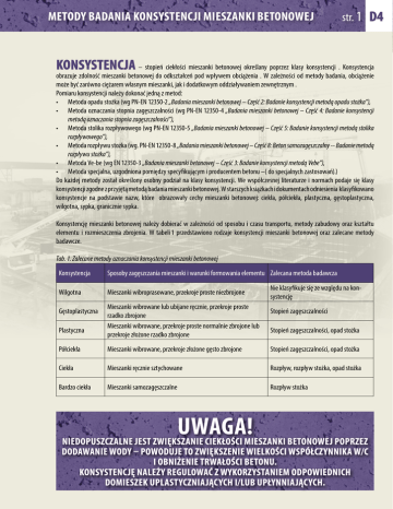 Metody badania konsystencji mieszanki betonowej str. 1 d4 KONSYSTENCJA – stopień ciekłości mieszanki betonowej określany poprzez klasy konsystencji . Konsystencja obrazuje zdolność mieszanki betonowej do odkształceń pod wpływem obciążenia . W zależności od metody badania, obciążenie może być zarówno ciężarem własnym mieszanki, jak i dodatkowym oddziaływaniem zewnętrznym . Pomiaru konsystencji należy dokonać jedną z metod: • Metoda opadu stożka (wg PN-EN 12350-2 „Badania mieszanki betonowej – Część 2: Badanie konsystencji metodą opadu stożka”), • Metoda oznaczania stopnia zagęszczalności (wg PN-EN 12350-4 „Badania mieszanki betonowej – Część 4: Badanie konsystencji metodą oznaczania stopnia zagęszczalności”), • Metoda stolika rozpływowego (wg PN-EN 12350-5 „Badania mieszanki betonowej – Część 5: Badanie konsystencji metodą stolika rozpływowego”), • Metoda rozpływu stożka (wg. PN-EN 12350-8 „Badania mieszanki betonowej – Część 8: Beton samozagęszczalny -- Badanie metodą rozpływu stożka”), • Metoda Ve-be (wg EN 12350-3 „Badania mieszanki betonowej – Część 3: Badanie konsystencji metodą Vebe”), • Metoda specjalna, uzgodniona pomiędzy specyfikującym i producentem betonu –( do specjalnych zastosowań).) Do każdej metody został określony osobny podział na klasy konsystencji. We współczesnej literaturze i normach podaje się klasy konsystencji zgodne z przyjętą metodą badania mieszanki betonowej. W starszych książkach i dokumentach odniesienia klasyfikowano konsystencje na podstawie nazw, które obrazowały cechy mieszanki betonowej: ciekła, półciekła, plastyczna, gęstoplastyczna, wilgotna, sypka, granicznie sypka. Konsystencję mieszanki betonowej należy dobierać w zależności od sposobu i czasu transportu, metody zabudowy oraz kształtu elementu i rozmieszczenia zbrojenia. W tabeli 1 przedstawiono rodzaje konsystencji mieszanki betonowej oraz zalecane metody badawcze. Tab. 1. Zalecane metody oznaczania konsystencji mieszanki betonowej Konsystencja Sposoby zagęszczania mieszanki i warunki formowania elementu Zalecana metoda badawcza Wilgotna Mieszanki wibroprasowane, przekroje proste niezbrojone Gęstoplastyczna Plastyczna Mieszanki wibrowane lub ubijane ręcznie, przekroje proste rzadko zbrojone Mieszanki wibrowane, przekroje proste normalnie zbrojone lub przekroje złożone rzadko zbrojone Nie klasyfikuje się ze względu na konsystencję Stopień zagęszczalności Stopień zagęszczalności, opad stożka Półciekła Mieszanki wibrowane, przekroje złożone gęsto zbrojone Stopień zagęszczalności, opad stożka Ciekła Mieszanki ręcznie sztychowane Rozpływ, rozpływ stożka, opad stożka Bardzo ciekła Mieszanki samozagęszczalne Rozpływ stożka UWAGA! NIEDOPUSZCZALNE JEST ZWIĘKSZANIE CIEKŁOŚCI MIESZANKI BETONOWEJ POPRZEZ DODAWANIE WODY – POWODUJE TO ZWIĘKSZENIE WIELKOŚCI WSPÓŁCZYNNIKA W/C I OBNIŻENIE TRWAŁOŚCI BETONU. KONSYSTENCJĘ NALEŻY REGULOWAĆ Z WYKORZYSTANIEM ODPOWIEDNICH DOMIESZEK UPLASTYCZNIAJĄCYCH I/LUB UPŁYNNIAJĄCYCH. str. 2 Metoda opadu stożka Badanie przeprowadza się według normy PN-EN 12350-2. Zasada metody polega na umieszczeniu i zagęszczeniu mieszanki betonowej w formie o kształcie ściętego stożka. Opad stożka mieszanki betonowej (po zdjęciu formy) jest miarą jej konsystencji. Wg PN-EN 12350-2 metoda opadu stożka jest czuła na zmiany konsystencji mieszanki betonowej, które odpowiadają opadowi stożka w granicach od 10 mm do 210 mm. Poza tym przedziałem, pomiar konsystencji metodą opadu stożka może okazać się niemiarodajny i zaleca się stosowanie innych metod. W przypadku, gdy opad stożka podlega dalszym zmianom w czasie dłuższym niż 1 min od momentu zdjęcia formy, pomiar konsystencji metodą opadu stożka jest niemiarodajny. Badanie jest także niemiarodajne, gdy największy wymiar ziarna kruszywa w betonie jest większy niż 40 mm. Oznaczenie konsystencji (klasy konsystencji) polega na pomiarze opadu stożka bezpośrednio po usunięciu formy (stożek Abramsa), czyli różnicy między wysokością formy, a wysokością najwyższego punktu rozformowanej próbki mieszanki betonowej (rys.1). Mieszankę betonową umieszcza się w formie w 3 warstwach, każdą zagęszcza się ręcznie przez sztychowanie (25 razy każdą warstwę). Rozformowanie polega na równomiernym podniesieniu formy do góry. Czynność tę wykonuje się w czasie około 5-10 sekund. Całe badanie, od momentu rozpoczęcia napełniania formy do jej zdjęcia, powinno zakończyć się w czasie 2,5 minuty. Po zdjęciu formy należy dokonać pomiaru opadu stożka (h), który wyraża się różnicą wysokości formy i najwyższym punktem rozformowanej próbki mieszanki betonowej (rys. 1). Klasy konsystencji według metody stożka podano w tabeli 2. 300 uchwyt h 100 forma 200 płyta Rys. 1. Badanie konsystencji metodą opadu stożka Przyrządy: forma kształtująca próbkę do badania , pręt do sztychowania, przymiar liniowy (wyskalowany od 0 do 300 mm), płyta (powierzchnia podstawy), szufla, sekundomierz, wilgotna tkanina, łopatka (o szerokości około 100 mm). Tabela 2. Klasy konsystencji wg metody opadu stożka Klasa S1 S2 S3 S4 S5 Opad stożka [mm] 10 - 40 50 - 90 100 - 150 160 - 210 ≥ 220 Tolerancja [mm] ± 10 ± 20 ± 30 str. 3 Metoda stopnia zagęszczalności 400 s Badanie przeprowadza się według metodyki zawartej w normie PN-EN 12350-4 . Metody nie stosuje się w odniesieniu do mieszanki betonowej z kruszywem o maksymalnym wymiarze ziaren przekraczającym 63 mm. Jeżeli stopień zagęszczalności jest mniejszy niż 1,04 lub większy niż 1,46, pomiar konsystencji mieszanki betonowej metodą oznaczania stopnia zagęszczalności jest niemiarodajny. Zasada metody polega na ułożeniu w pojemniku mieszanki betonowej i wyrównaniu jej górnej powierzchni do poziomu krawędzi pojemnika oraz umieszczeniu pojemnika na stoliku wibracyjnym