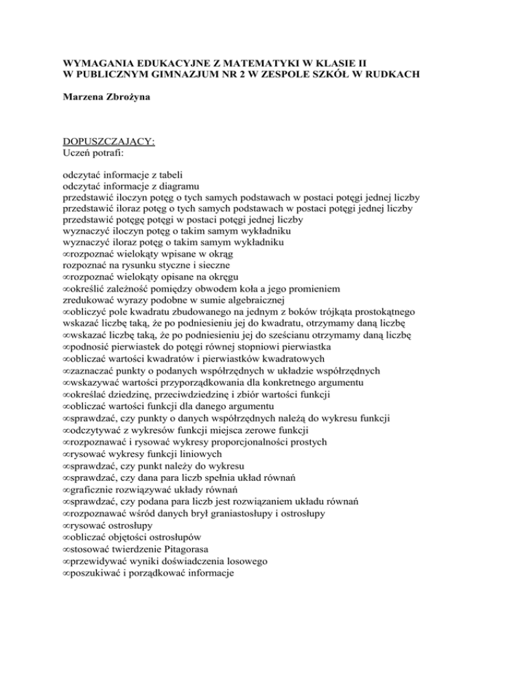 WYMAGANIA EDUKACYJNE Z MATEMATYKI W KLASIE II W PUBLICZNYM GIMNAZJUM NR 2 W ZESPOLE SZKÓŁ W RUDKACH Marzena Zbrożyna DOPUSZCZAJĄCY: Uczeń potrafi: odczytać informacje z tabeli odczytać informacje z diagramu przedstawić iloczyn potęg o tych samych podstawach w postaci potęgi jednej liczby przedstawić iloraz potęg o tych samych podstawach w postaci potęgi jednej liczby przedstawić potęgę potęgi w postaci potęgi jednej liczby wyznaczyć iloczyn potęg o takim samym wykładniku wyznaczyć iloraz potęg o takim samym wykładniku • rozpoznać wielokąty wpisane w okrąg rozpoznać na rysunku styczne i sieczne • rozpoznać wielokąty opisane na okręgu • określić zależność pomiędzy obwodem koła a jego promieniem zredukować wyrazy podobne w sumie algebraicznej • obliczyć pole kwadratu zbudowanego na jednym z boków trójkąta prostokątnego wskazać liczbę taką, że po podniesieniu jej do kwadratu, otrzymamy daną liczbę • wskazać liczbę taką, że po podniesieniu jej do sześcianu otrzymamy daną liczbę • podnosić pierwiastek do potęgi równej stopniowi pierwiastka • obliczać wartości kwadratów i pierwiastków kwadratowych • zaznaczać punkty o podanych współrzędnych w układzie współrzędnych • wskazywać wartości przyporządkowania dla konkretnego argumentu • określać dziedzinę, przeciwdziedzinę i zbiór wartości funkcji • obliczać wartości funkcji dla danego argumentu • sprawdzać, czy punkty o danych współrzędnych należą do wykresu funkcji • odczytywać z wykresów funkcji miejsca zerowe funkcji • rozpoznawać i rysować wykresy proporcjonalności prostych • rysować wykresy funkcji liniowych • sprawdzać, czy punkt należy do wykresu • sprawdzać, czy dana para liczb spełnia układ równań • graficznie rozwiązywać układy równań • sprawdzać, czy podana para liczb jest rozwiązaniem układu równań • rozpoznawać wśród danych brył graniastosłupy i ostrosłupy • rysować ostrosłupy • obliczać objętości ostrosłupów • stosować twierdzenie Pitagorasa • przewidywać wyniki doświadczenia losowego • poszukiwać i porządkować informacje DOSTATECZNY: Uczeń spełnia wymagania na ocenę dopuszczającą oraz potrafi: obliczyć średnią arytmetyczną wyznaczyć modę danych wyników • sporządzić diagram słupkowy na podstawie tabeli • uprościć wyrażenie korzystając ze wzorów na iloczyn i iloraz potęg o tych samych podstawach oraz potęgę potęgi • obliczyć wartość wyrażenia stosując wzory dotyczące działań na potęgach obliczyć potęgę danej liczby także o wykładniku ujemnym wskazać środek okręgu opisanego na trójkącie opisać okrąg na trójkącie wskazać środek okręgu opisanego na czworokącie opisać okrąg na czworokącie wskazać środek okręgu wpisanego w trójkąt wyznaczyć środek okręgu wpisanego w trójkąt wyznaczyć środek okręgu wpisanego w czworokąt obliczyć pole koła • obliczyć długość okręgu • pomnożyć dwie sumy algebraiczne zapisać kwadrat sumy dwóch wyrażeń w postaci sumy algebraicznej zapisać kwadrat różnicy dwóch wyrażeń w postaci sumy algebraicznej skorzystać ze wzoru na różnicę kwadratów dwóch wyrażeń • sprawdzić, czy trójkąt jest prostokątny • rozpoznać liczbę niewymierną • zamieniać iloczyn pierwiastków na pierwiastek iloczynu • zamieniać iloraz pierwiastków na pierwiastek ilorazu • stosować reguły kolejności wykonywania działań • zastosować twierdzenie Pitagorasa do obliczania długości boków trójkąta prostokątnego • rozstrzygać na podstawie twierdzenia odwrotnego do twierdzenia Pitagorasa, czy trójkąt o podanych długościach boków jest trójkątem prostokątnym • stosować twierdzenie Pitagorasa do rozwiązywania zadań • obliczać długości przekątnej prostokąta • obliczać odległość punktu o podanych współrzędnych od początku układu • przedstawiać przyporządkowania na różne sposoby • określać dziedzinę i przeciwdziedzinę przyporządkowania • rozpoznawać, które przyporządkować jest, a które nie jest funkcją • odczytywać z wykresu funkcji wartości funkcji dla danego argumentu i odwrotnie, znajdywać argumenty dla danej wartości funkcji • opisywać funkcję na różne sposoby: słownie (algorytmicznie), za pomocą grafu, tabeli, wykresu • rozpoznawać na podstawie wykresu funkcje rosnące, malejące, stałe • Sprawdzać, czy para liczb spełnia równanie stopnia pierwszego z dwiema niewiadomymi • rozwiązywać graficzne równania stopnia pierwszego z dwiema niewiadomymi • przedstawiać wykresy równań w układzie współrzędnych • rozwiązywać układy równań metodą podstawiania • rysować siatki ostrosłupów • obliczać pola powierzchni ostrosłupów • wskazywać trójkąty prostokątne w przekrojach graniastosłupów i ostrosłupów • stosować twierdzenie odwrotne do twierdzenia Pitagorasa • przedstawiać na schematach przebieg doświadczenia losowego • określać szanse w typowych grach i doświadczeniach losowych • obliczać należne odsetki po roku oszczędzania DOBRY: Uczeń spełnia wymagania na ocenę dostateczną oraz potrafi: • wyznaczyć medianę danych wyników • zapisać związki pomiędzy jednostkami metrycznymi wykorzystując potęgi • stosować działania na potęgach o wykładniku dodatnim do przekształcania wyrażeń arytmetycznych przedstawić liczbę w postaci potęgi. • skorzystać z poznanych wzorów dotyczących potęg • skorzystać z własności wielokątów wpisanych w okrąg • skorzystać z własności stycznych i siecznych w różnych sytuacjach • skorzystać z własności wielokątów opisanych na okręgu. obliczyć i oszacować z zadaną dokładnością długość okręgu, gdy dany jest jego promień. obliczyć z zadaną dokładnością długość promienia, gdy dana jest długość okręgu obliczyć z zadaną dokładności