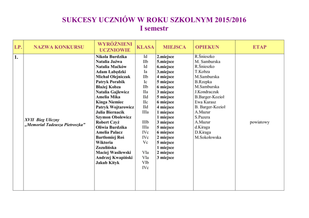 SUKCESY UCZNIÓW W ROKU SZKOLNYM 2015/2016 I semestr LP. NAZWA KONKURSU 1. XVII Bieg Uliczny „Memoriał Tadeusza Pietroszka” WYRÓŻNIENI KLASA UCZNIOWIE Nikola Burdzika Natalia Jaźwa Natalia Maćków Adam Łabędzki Michał Olejniczak Patryk Porabik Błażej Kobza Natalia Gajlewicz Amelia Mika Kinga Niemiec Patryk Wojtarowicz Julia Biernacik Szymon Obolewicz Robert Czyż Oliwia Burdzika Amelia Palacz Bartłomiej Roś Wiktoria Zozulińska Maciej Wasilewski Andrzej Kwapiński Jakub Kityk Id IIb Id Ia IIb Ic IIb IIa IId IIc IId IIIa IIIb IIIa IVc IVc Vc VIa VIa VIb IVc MIEJSCA 2.miejsce 5.miejsce 6.miejsce 3.miejsce 4 miejsce 5 miejsce 6 miejsce 3 miejsce 5 miejsce 6 miejsce 4 miejsce 1 miejsce 1 miejsce 3 miejsce 5 miejsce 6 miejsce 2 miejsce 5 miejsce 1 miejsce 2 miejsce 3 miejsce OPIEKUN R.Śnieszko M. Samburska R.Śnieszko T.Kobza M.Samburska B.Rzepka M.Samburska J.Kondraczuk B.Barger-Kozioł Ewa Kurasz B. Barger-Kozioł A.Mazur S.Pazera A.Mazur d.Kiraga D.Kiraga M.Sokołowska ETAP powiatowy 2. 3. 4. 5. 6. Konkurs plastyczny XXII edycji Sprzątania Świata- Polska 2015 pn. „Wyprawa-poprawa” Konkurs plastyczny org. przez MCK w Legnicy „Psiaki, kociaki i inne zwierzaki” Szkolny etap konkursu interdyscyplinarnego „Zdolny Ślązaczek” Rejonowy Konkurs Plastyczny ‘Sprzątanie to fajne zadanie” -org. przez MCK w Legnicy VII Przegląd Zbiorów Młodych Kolekcjonerów i Hobbystów Maja Siwik Jagoda Przydatek Natalia Maćków Natalia Jaźwa Michał Pilich Lena Kieleczawa Kornelia Sabura Natalia Dalikiewicz Filip Janczura Dawid Maćków IIIa IIb Id IIb Ib Id IIIb IIc IIa Vc 1.miejsce 2.miejsce 3.miejsce 3.miejsce Wyróżnienie Wyróżnienie Wyróżnienie Wyróżnienie Wyróżnienie 1.miejsce A.Mazur M.Samburska-Mach R.Śnieszko-Pawłow M.Samburska-Mach R.Mazur R.Snieszko S.Pazera E.Kurasz J.Kondraczuk M.Preyzner miejski Filip Janczura Hanna Kajor Hubert Łaba IIa IIIa IIc Laureaci J.Kondraczuk A.Mazur E.Kurasz regionalny Amelia Stemplowska VIb Przeszła do etapu powiatowego B.Pecyna szkolny Natalia Jaźwa Jagoda Przydatek Jakub Szymański Maria Kandora Kornelia Sadura Natalia Maćków Maria Banaszyńska IIb IIb Va IIa M.Samburska-Mach M.Samurska-Mach M.Preyzner T.Kobza rejonowy M.Wiśniewska regionalny Kacper Wilczyński IVa Dawid Maćków Kamil Zieliński Vc Vc Laureatka Laureatka Laureat Wyróżnienie Wyróżnienie Wyróżnienie Wyróżnienie I Nagroda Publiczności III miejsce i Nagroda Publiczności Udział II miejsce i Nagroda Publicznosci Id IId 7. Szkolny etap konkursu recytatorskiego 8. Szkolny etap konkursu „Ojczyzna-Polszczyzna” 9. 10. 11. 12. 13. 14. Miejski konkurs literacki „Jak być patriotą” Miejski konkurs plastyczny „Jak być patriotą” Szkolny etap konkursu językowego Zdolny Ślązaczek” V Złote Dyktando XXII Festiwal Piosenki Dziecięcej org. przez ZOKiR Konkurs plastyczny „Nie zatruwajmy i nie zaśmiecajmy rzeki Kaczawy” 15. Ogólnopolski konkurs „Ojczyzna-Polszczyzna” 16. Rejonowy Konkurs Recytatorski org. przez MCK w Legnicy 17. Powiatowy etap konkursu Ojczyzna-Polszczyzna Maja Hałas Angelika Potempa Marcel Jóźwiak Amelia Stemplowska Gabriela Sajewicz Marcel Jóźwiak Amelia Stemplowska Aleksandra Sajewicz Agata Marmuszewska Amelia Stemplowska Szymon Obolewicz Julia Fijałkiewicz IVb VB VIa VIb VIa VIa Wyróżnienia Przeszły do etapu powiatowego B.Pecyna B.Lis B.Lis B.Pecyna szkolny szkolny I miejsce II miejsce B.Lis B.Lis B.Pecyna Wyróżnienie I.Stemplowska Wyróżnienie M.Preyzner miejski K.Kaliciak szkolny IIIb VIb Przeszła do etapu powiatowego Mistrz III miejsce S.Pazera D. Stawińska miejski powiatowy Marcel Kargol Jakub Gładysz Milena Rychlicka Daria Szymańska Natalia Maćków Natalia Jaźwa Dawid Maćków O O O O Id IIb Vc II miejsce III miejsce Wyróżnienie Wyróżnienie I miejsce Wyróżnienie I miejsce powiatowy Amelia Stemplowska Marcel Jóźwiak VIb finalistka J.Czaban E.Zabłotna J.Czaban E.Zablotna R.SnieszkoPawlowska M.Samburska M.Preyzner B.Pecyna ogólnopolski VIa Wyróżnienie B.Lis rejonowy Amelia Stemplowska VIb I miejsce Awans do etapu wojewódzkiego B.Pecyna powiatowy miejski VIb IVc VIb VIb 18. W Ogólnopolskim Konkursie Multitest 2015-przyroda 19. Powiatowy etap konkursu językowego 20. 21. 22. 23. 24. Zdolny Ślązaczek Konkurs na prezentację książki org. przez Bibliotekę Publiczną Rejonowy Konkurs Plastyczny „Anioł-Tradycje i zwyczaje Świąt BożegoNarodzenia Powiatowy Konkurs Plastyczny org. przez Miejską Bibliotekę Publiczną „ Papierowe Anioły” Konkurs na prezentacje książek org. przez Bibliotekę Pedagogiczną I Przegląd Kolęd i Pastorałek org. przez ZOKiR 25. Ogólnopolski Konkurs „Alfik matematyczny” 26. II Międzyszkolny Konkurs Piosenki Bożonarodzeniowej „Anielskie Nutki” 27. Konkurs plastyczny na najpiękniejszą kartkę świąteczną w języku angielskim i niemieckim Maja Hałas Orest Lewów Nikola Pisarska Amelia Stemplowska Hanna Kokot Amelia Palacz Paulina Major IVb IVb IVb VIb III miejsce 11 miejsce 16 miejsce ogólnopolski Kwalifikacja do etapu ustnego Laureatka K.Maciejak K.Maciejak K.Maciejak K.KaliciakTurkiewicz I.Stemplowska I.Stemplowska S.Pazera Vc IVc IIIb Oliwia Pieterek IIa Wyróżnienie J.Kondraczuk powiatowy Amelia Palacz Hanna Kokot Marta Kalityńska Julia Fijałkiewicz Alicja Grocka Miłosz Kaczmarek Erwin Sarczyński Magda Łopato Patrycja Pakuła Marta Kalityńska Marta Kalityńska Bartłomiej Roś Julia Fijałkiewicz Maja Hałas A. Palacz Natalia Maćków Adam Kokot Maria Kandora Lena Kieleczawa Mikołaj Meller Hubert Zdański IVc Vc VIb VIb VIb IIb IIIb IVc Va VIb VIb Vc VIb IVb, c I miejsce III miejsce I miejsce II miejsce III miejsce I miejsce I miejsce I miejsce I miejsce I miejsce I miejsce II miejsce Wyróżnienie Wyróznienie I.Stemplowska I. Stemplowska D.Stawińska D.Stawińska D.Stawińska M.Samburska S.Pazera I.Dominiak E.Pawłowsk powiatowy K.Kaliciak-Turkiwicz A.Wójcicka międzyszkolny I I I I II II I miejsce I miejsce I