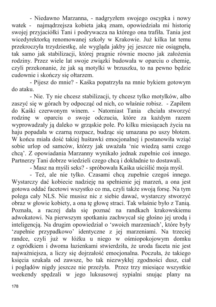 - Niedawno Marzanna, - nadgryzłem swojego oscypka i nowy watek - najmądrzejsza kobieta jaką znam, opowiedziała mi historię swojej przyjaciółki Tani i podrywacza na którego ona trafiła. Tania jest wicedyrektorką renomowanej szkoły w Krakowie. Już kilka lat temu przekroczyła trzydziestkę, ale wygląda jakby jej jeszcze nie osiągnęła, tak samo jak stabilizacji, której pragnie równie mocno jak założenia rodziny. Przez wiele lat swoje związki budowała w oparciu o chemię, czyli przekonanie, że jak są motylki w brzuszku, to na pewno będzie cudownie i skończy się ołtarzem. - Pijesz do mnie? - Kaśka popatrzyła na mnie bykiem gotowym do ataku. - Nie. Ty nie chcesz stabilizacji, ty chcesz tylko motylków, albo zaszyć się w górach by odpocząć od nich, co właśnie robisz. - Zapiłem do Kaśki czerwonym winem. - Natomiast Tania chciała stworzyć rodzinę w oparciu o swoje odczucia, które za każdym razem wyprowadzały ją daleko w grząskie pole. Po kilku miesiącach życia na haju popadała w czarną rozpacz, budząc się umazana po uszy błotem. W końcu miała dość takiej huśtawki emocjonalnej i postanowiła wziąć sobie urlop od samców, którzy jak uważała ‘nie wiedzą sami czego chcą’. Z opowiadania Marzanny wynikało jednak zupełnie coś innego. Partnerzy Tani dobrze wiedzieli czego chcą i dokładnie to dostawali. - Masz na myśli seks? - spróbowała Kaśka uściślić moja myśl. - Też, ale nie tylko. Czasami chcą zupełnie czegoś innego. Wystarczy dać kobiecie nadzieję na spełnienie jej marzeń, a ona jest gotowa oddać facetowi wszystko co ma, czyli także swoją forsę. Na tym polega cały NLS. Nie musisz nic z siebie dawać, wystarczy stworzyć obraz w głowie kobiety, a ona tę głowę straci. Tak właśnie było z Tanią. Poznała, a raczej dała się poznać na randkach krakowskiemu adwokatowi. Na pierwszym spotkaniu zachwycał się głośno jej urodą i inteligencją. Na drugim opowiedział o ‘swoich marzeniach’, które były ‘zupełnie przypadkowo’ identyczne z jej marzeniami. Na trzeciej randce, czyli już w łóżku u niego w ośmiopokojowym domku z ogródkiem i dwoma łazienkami stwierdziła, że uroda faceta nie jest najważniejsza, a liczy się dojrzałość emocjonalna. Poczuła, że takiego księcia szukała od zawsze, bo tak niezwykłej zgodności dusz, ciał i poglądów nigdy jeszcze nie przeżyła. Przez trzy miesiące wszystkie weekendy spędzali w jego luksusowej sypialni snując plany na 178 przyszłość i nadając imiona nienarodzonym jeszcze dzieciom, które będą owocem tej szaleńczej miłości. Tania była nie tylko w motylkach, skowronkach, ale w siódmym niebie. Po trzech miesiącach facet rozpłakał się jak dziecko i wyznał ‘prawdę’… - Że ma żonę? - nie wytrzymała Kaśka. - Nie. To inna opowieść. To historia o tym jak Urszula wracając z pracy poznała żonę i dwójkę dzieci swojego narzeczonego, u którego mieszkała od kilku miesięcy, to zupełnie inny horror. Jak będziesz bardzo chciała to też ci ją opowiem. - Nie chcę! - ucięła temat Kaśka, bo to mogłoby być zbyt bolesne, dla profesorki seksuologii zakochanej po uszy w żonatym facecie. - Opowiadaj o Tani. - OK - zapiłem czerwonym winem, by wrócić do kolorowej historyjki. - Adwokat padł na kolana i obficie zraszając łzami jej łono wyznał, że musi na miesiąc lecieć do Brazylii, aby się spotkać ze swoim bogatym klientem, dzięki któremu jego kancelaria tak dobrze prosperuje. - No to zabierz mnie ze sobą. - Tania była już ugotowana na miękko i gotowa w trybie natychmiastowym rzucić wicedyrektorstwo renomowanego liceum krakowskiego. - Adwokat rozpłakał się jeszcze bardziej i wyznał, że był nie do końca uczciwy wobec Tani, bo zapomniał ja poinformować, że tym klientem jest milionerka, której interesami opiekuje się w Polsce. Mówiąc wprost jest nie tylko jej prawnikiem, ale także jej utrzymankiem, ale za bardzo grubą kasę. Bijąc się w piersi wyznał, że czuje się jak ostatnia szmata, ale jeszcze nie może zrezygnować z brazylijskiej forsy, za która wybudował domek z ogródkiem. Może za rok, albo dwa stanie na tyle mocno na własnych nogach, aby odzyskać honor i żyć z pracy własnych rąk, a nie innej części ciała. Tania, która już w swoim życiu nie z jednego pieca konsumowała bułeczki i poznała trochę życie oraz wartość pieniądza, zamiast walnąć faceta z całej siły w pysk, za to że ja oszukiwał, okazała głębokie zrozumienie. - Nie mieszajmy miłości z interesem - przedstawiła Tania swój punkt widzenia. - Nie pozwólmy, aby jakaś stara pudernica odebrała nam to co już zbudowaliśmy. Kocham cię i chcę być z Toba na zawsze. Ty leć do tej Brazylii i zarób tyle forsy, aby możliwie szybko wyplatać 179 się z układu, w którym się tak źle czujesz i wracaj do mnie jak najszybciej. Będę wiernie czekała na ciebie i tęskniła. - Też będę tęsknił za moim cudem - Adwokat otarł łzy ze zdziwieniem jak wielką miłość i jak mały rozumek znalazł w swoim życiu. Tania zrobiła mu na pożegnanie niezapomnianego loda, aby tęsknił jeszcze mocniej przez miesiąc rozłąki. Niestety nie mogła odprowadzić go na lotnisko, bo skoro przez rok albo dwa nie porzuci wicedyrektorstwa, to musi pojawić się na próbnych maturach. Nie istnieje miłość od pierwszego wejrzenia, od pierwszego wejrzenia może się obudzić tylko pożądanie. Pierre la Mure 180