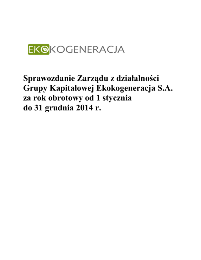 Sprawozdanie Zarządu z działalności Grupy Kapitałowej Ekokogeneracja S.A. za rok obrotowy od 1 stycznia do 31 grudnia 2014 r. Sprawozdanie Zarządu z działalności Grupy Kapitałowej Ekokogeneracja S.A. za rok obrotowy od 1 stycznia do 31 grudnia 2014 r. ZAWARTOŚĆ SPRAWOZDANIA ZARZĄDU: I INFORMACJE O PODMIOCIE DOMINUJĄCYM 3 II OPIS ORGANIZACJI GRUPY KAPITAŁOWEJ ZE WSKAZANIEM JEDNOSTEK PODLEGAJĄCYCH KONSOLIDACJI ORAZ OPIS ZMIAN W ORGANIZACJI GRUPY KAPITAŁOWEJ WRAZ Z PODANIEM ICH PRZYCZYN 7 III WAŻNIEJSZE OKOLICZNOŚCI LUB ZDARZENIA MAJĄCE ZNACZĄCY WPŁYW NA DZIAŁALNOŚĆ ORAZ WYNIKI FINANSOWE GRUPY KAPITAŁOWEJ W ROKU OBROTOWYM LUB KTÓRYCH WPŁYW JEST MOŻLIWY W NASTĘPNYCH LATACH 13 IV CHARAKTERYSTYKA STRUKTURY AKTYWÓW I PASYWÓW SKONSOLIDOWANEGO BILANSU, W TYM Z PUNKTU WIDZENIA PŁYNNOŚCI GRUPY KAPITAŁOWEJ 32 V OPIS STRUKTURY GŁÓWNYCH LOKAT KAPITAŁOWYCH LUB GŁÓWNYCH INWESTYCJI KAPITAŁOWYCH DOKONANYCH W RAMACH GRUPY KAPITAŁOWEJ W DANYM ROKU OBROTOWYM 34 VI OPIS ISTOTNYCH POZYCJI POZABILANSOWYCH W PODMIOTOWYM, PRZEDMIOTOWYM I WARTOŚCIOWYM 35 VII OSIĄGNIĘCIA W DZIEDZINIE BADAŃ I ROZWOJU 35 VIII NABYWANIE AKCJI WŁASNYCH I ODDZIAŁ 35 IX INSTRUMENTY FINANSOWE 36 X CHARAKTERYSTYKA POLITYKI W ZAKRESIE KIERUNKÓW ROZWOJU GRUPY KAPITAŁOWEJ 36 XI AKTUALNA I PRZEWIDYWANA SYTUACJA FINANSOWA 37 XII CZYNNIKI RYZYKA 37 UJĘCIU 2 Sprawozdanie Zarządu z działalności Grupy Kapitałowej Ekokogeneracja S.A. za rok obrotowy od 1 stycznia do 31 grudnia 2014 r. 1. 1.1. INFORMACJE O PODMIOCIE DOMINUJĄCYM Dane organizacyjne Podmiotu Dominującego: Nazwa (firma): Forma prawna: Kraj: Siedziba: Adres: Telefon: Fax: Adres poczty elektronicznej: Adres strony internetowej: Sąd Rejestrowy: KRS: REGON: NIP: Przedmiot działalności: 1.2. Ekokogeneracja S.A. Spółka Akcyjna Polska Warszawa Al. Jerozolimskie 91, 02-001 Warszawa +48 22 622 72 67 +48 22 627 32 95 [email protected] www.ekokogeneracja.com Sąd Rejonowy dla m.st. Warszawy, XII Wydział Gospodarczy Krajowego Rejestru Sądowego 0000364229 141699367 521-35-11-744 PKD 35.30.Z - wytwarzanie i zaopatrywanie w parę wodną, gorącą wodę i powietrze do układów klimatyzacyjnych; PKD 64.20.Z - Działalność holdingów finansowych; Kapitał zakładowy Podmiotu Dominującego Na dzień 31 grudnia 2014 roku Emitent posiada zarejestrowany kapitał zakładowy w kwocie 1.080.000,00 (jeden milion osiemdziesiąt tysięcy), który dzieli się na: (i) 4.000.000,00 (cztery miliony) akcji zwykłych imiennych serii A o wartości nominalnej 0,10 zł (dziesięć groszy), (ii) 1.500.000 (jeden milion pięćset tysięcy) akcji zwykłych na okaziciela serii B o wartości nominalnej 0,10 zł (dziesięć groszy), (iii) 1.333.750 (jeden milion trzysta trzydzieści trzy tysiące siedemset pięćdziesiąt) akcji zwykłych na okaziciela serii C1 o wartości nominalnej 0,10 zł (dziesięć groszy), 3 Sprawozdanie Zarządu z działalności Grupy Kapitałowej Ekokogeneracja S.A. za rok obrotowy od 1 stycznia do 31 grudnia 2014 r. (iv) 1.019.120 (jeden milion dziewiętnaście tysięcy sto dwadzieścia) akcji zwykłych na okaziciela serii D o wartości nominalnej 0,10 zł (dziesięć groszy), (v) 967.130 (dziewięćset sześćdziesiąt siedem tysięcy sto trzydzieści) akcji zwykłych na okaziciela serii E o wartości nominalnej 0,10 zł (dziesięć groszy), (vi) 980.000 (dziewięćset osiemdziesiąt tysięcy) akcji zwykłych na okaziciela serii F1 o wartości nominalnej 0,10 zł (dziesięć groszy). (vii) 1.000.000 (milion) akcji zwykłych na okaziciela serii K o wartości nominalnej 0,10 zł (dziesięć groszy). Każda z akcji serii: A, B, C1, D, E, F1 i K daje prawo do jednego głosu na walnym zgromadzeniu akcjonariuszy Emitenta. Akcje serii B, C1, D, E, F1 i K są akcjami dopuszczonymi do obrotu na rynku NewConnect. Warunkowe podwyższenie kapitału związane z realizacją Programu Motywacyjnego W dniu 27 września 2013 r. Krajowy Rejestr Sądowy dokonał rejestracji warunkowego podwyższenia kapitału o emisję akcji serii G, H, I oraz J, wynikającego z podjętej w dniu 19 czerwca 2013 r. przez Zwyczajne Walne Zgromadzenie Akcjonariuszy („ZWZA”) Emitenta Uchwały nr 17/VI/2013 („Uchwała”) w sprawie wdrożenia programu motywacyjnego dla pracowników i współpracowników Emitenta oraz Spółek zależnych Emitenta, emisji warrantów subskrypcyjnych, pozbawienia dotychczasowych akcjonariuszy prawa poboru warrantów subskrypcyjnych oraz warunkowego podwyższenia kapitału zakładowego w drodze emisji nowych akcji z wyłączeniem prawa poboru. Na mocy uchwały nr 17/VI/2014, podjętej na ZWZA w dniu 24 czerwca 2014 roku w sprawie wdrożenia programu motywacyjnego dla pracowników i współpracowników Emitenta oraz Spółek zależnych Emitenta, emisji warrantów subskrypcyjnych, pozbawienia dotychczasowych akcjonariuszy prawa poboru warrantów subskrypcyjnych oraz warunkowego podwyższenia kapitału zakładowego w drodze emisji nowych akcji z wyłączeniem prawa poboru, ZWZA postanowiło dokonać realokacji akcji serii G w ilości nie większej niż 100.000, zwiększając ilość akcji serii I oraz ilość akcji serii J do ilości 150.000 sztuk akcji w każdej ze wspominanych serii. W dniu 22 września 2014 r. Krajowy Rejestr Sądowy dokonał rejestracji uchwały nr 17/VI/2014, podjętej na ZWZA w dniu 24 czerwca 2014 roku w sprawie wdrożenia programu motywacyjnego dla pracowników i współpracowników Emitenta oraz Spółek zależnych Emitenta. 4 Sprawozdanie Zarządu z działalności Grupy Kapitałowej Ekokogeneracja S.A. za rok obrotowy od 1 stycznia do 31 grudnia 2014 r. W dniu 31 grudnia 2014 r. wygasła emisja 100.000 akcji serii H Ekokogeneracja S.A. uchwalona w ramach Programu Motywacyjnego, o którego szczegółach Emitent informował w Komunikacie Bieżącym nr 73/2013, w dniu 16 grudnia 2013 r. Przyczyną wygaśnięcia emisji akcji serii H, uchwalonej w ramach Programu Motywacyjnego jest nie przydzielenie uczestnikom Programu Motywa