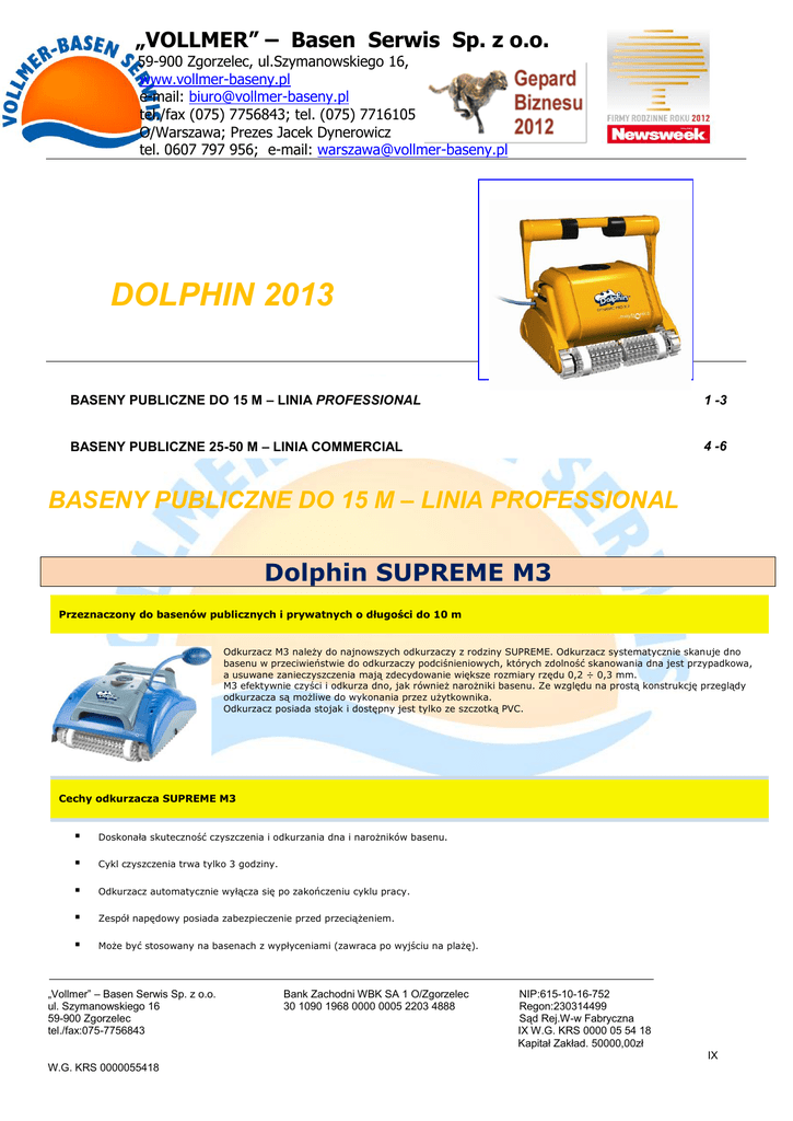 „VOLLMER” – Basen Serwis Sp. z o.o. 59-900 Zgorzelec, ul.Szymanowskiego 16, www.vollmer-baseny.pl e-mail: [email protected] tel./fax (075) 7756843; tel. (075) 7716105 O/Warszawa; Prezes Jacek Dynerowicz tel. 0607 797 956; e-mail: [email protected] DOLPHIN 2013 BASENY PUBLICZNE DO 15 M – LINIA PROFESSIONAL 1 -3 BASENY PUBLICZNE 25-50 M – LINIA COMMERCIAL 4 -6 BASENY PUBLICZNE DO 15 M – LINIA PROFESSIONAL Dolphin SUPREME M3 Przeznaczony do basenów publicznych i prywatnych o długości do 10 m Odkurzacz M3 należy do najnowszych odkurzaczy z rodziny SUPREME. Odkurzacz systematycznie skanuje dno basenu w przeciwieństwie do odkurzaczy podciśnieniowych, których zdolność skanowania dna jest przypadkowa, a usuwane zanieczyszczenia mają zdecydowanie większe rozmiary rzędu 0,2 ÷ 0,3 mm. M3 efektywnie czyści i odkurza dno, jak również narożniki basenu. Ze względu na prostą konstrukcję przeglądy odkurzacza są możliwe do wykonania przez użytkownika. Odkurzacz posiada stojak i dostępny jest tylko ze szczotką PVC. Cechy odkurzacza SUPREME M3 Doskonała skuteczność czyszczenia i odkurzania dna i narożników basenu. Cykl czyszczenia trwa tylko 3 godziny. Odkurzacz automatycznie wyłącza się po zakończeniu cyklu pracy. Zespół napędowy posiada zabezpieczenie przed przeciążeniem. Może być stosowany na basenach z wypłyceniami (zawraca po wyjściu na plażę). „Vollmer” – Basen Serwis Sp. z o.o. ul. Szymanowskiego 16 59-900 Zgorzelec tel./fax:075-7756843 Bank Zachodni WBK SA 1 O/Zgorzelec 30 1090 1968 0000 0005 2203 4888 NIP:615-10-16-752 Regon:230314499 Sąd Rej.W-w Fabryczna IX W.G. KRS 0000 05 54 18 Kapitał Zakład. 50000,00zł IX W.G. KRS 0000055418 „VOLLMER” – Basen Serwis Sp. z o.o. 59-900 Zgorzelec, ul.Szymanowskiego 16, www.vollmer-baseny.pl e-mail: [email protected] tel./fax (075) 7756843; tel. (075) 7716105 O/Warszawa; Prezes Jacek Dynerowicz tel. 0607 797 956; e-mail: [email protected] Duża powierzchnia worka filtracyjnego zapewnia usunięcie wszystkich zanieczyszczeń z basenu w czasie jednego cyklu pracy. Odkurzacz jest mały, lekki i prosty w obsłudze. Prosta konstrukcja zapewnia możliwość wykonywania przeglądów i wymiany zużytych części we własnym zakresie. Wyposażony jest w stojak do wygodnego przechowywania odkurzacza. Gwarancja – 24 miesiące. Dane techniczne Cykl czyszczenia Długość przewodu zasilającego Dokładność filtrowania Wydajność pompy Prędkość czyszczenia liniowa Pobór mocy Zasilacz Napięcie zasilania pi rwotne Napięcie zasilania wtórne Stopień ochrony zasilacza Masa (bez przewodu) 3 godziny 17 m 70 mikrometrów 16 m3/godz 600 m/godz 100 W uniwersalny cyfrowy 100 – 250 V poniżej 30 VDC IP 54 8 kg Dolphin SUPREME M4 Przeznaczony do basenów publicznych i prywatnych o długości do 15m Klasa WALL CLIMBI G SUPREME M4 należy do najnowszej generacji odkurzaczy wprowadzonych na rynek w 2010 roku. Innowacyjna technologia oparta na mikroprocesorowym sterowaniu oraz nowe oprogramowanie umożliwia optymalne skanowanie dna i wyczyszczenie basenu w znacznie krótszym czasie. SUPREME M4 jako jeden z niewielu odkurzaczy posiada ruchome pokrywy górne umożliwiające szybkie, łatwe i wygodne wyjmowanie wkładów filtracyjnych w celu ich wyczyszczenia. Standardowo wraz z odkurzaczem użytkownik otrzymuje trzy rodzaje filtrów: dokładne, dokładne jednorazowe i zgrubne. Odkurzacz posiada dodatkową obrotową szczotkę umieszczoną od spodu obudowy, która zapobiega odkładaniu się skupisk glonów i bakterii na dnie i ścianach basenu. Wyposażony został w nowy uniwersalny zasilacz cyfrowy oraz w wózek umożliwiający łatwy transport i magazynowanie. Prosta konstrukcja odkurzacza umożliwia dokonywanie przeglądów i wymianę zużytych części przez użytkownika. Dostępny jest ze szczotką COMBI lub WONDER. Cechy odkurzacza SUPREME M4 Doskonała skuteczność czyszczenia i odkurzania dna, ścian basenu i linii wodnej. Cykl czyszczenia trwa tylko 2½ godziny. Odkurzacz automatycznie wyłącza się po zakończeniu cyklu pracy. „Vollmer” – Basen Serwis Sp. z o.o. ul. Szymanowskiego 16 59-900 Zgorzelec tel./fax:075-7756843 Bank Zachodni WBK SA 1 O/Zgorzelec 30 1090 1968 0000 0005 2203 4888 NIP:615-10-16-752 Regon:230314499 Sąd Rej.W-w Fabryczna IX W.G. KRS 0000 05 54 18 Kapitał Zakład. 50000,00zł IX W.G. KRS 0000055418 „VOLLMER” – Basen Serwis Sp. z o.o. 59-900 Zgorzelec, ul.Szymanowskiego 16, www.vollmer-baseny.pl e-mail: [email protected] tel./fax (075) 7756843; tel. (075) 7716105 O/Warszawa; Prezes Jacek Dynerowicz tel. 0607 797 956; e-mail: [email protected] Zespół napędowy posiada zabezpieczenie przed przeciążeniem. Dodatkowa aktywna szczotka zapobiega odkładaniu się glonów i bakterii. Wraz z odkurzaczem dostarczane są wkłady filtracyjne dokładne, dokładne jednorazowe i zgrubne. Nowa udoskonalona konstrukcja zaworów upustowych wody zapobiegających usuwaniu zgromadzonych we wnętrzu odkurzacza zanieczyszczeń. Nowy uniwersalny zasilacz cyfrowy. Prosta konstrukcja umożliwia wykonywanie przeglądów i wymianę zużytych części we własnym zakresie. Wyposażony jest w wózek do wygodnego transportu i przechowywania odkurzacza. Gwarancja – 36 miesięcy. Dane techniczne Cykl czyszczenia Długość przewodu zasilającego Dokładność filtrowania Wydajność pompy Zasilacz Napięcie zasilające pierwotne Napięcie zasilające wtórne Pobór mocy Stopień ochrony zasilacza Masa (bez przewodu) 2,5 godziny 20 m 70 mikrometrów lub filtr zgrubny 17 m3/godz uniwersalny cyfrowy 10 – 250 V AC poniżej 30 V DC 100 W IP 54 10 kg Dolphin SUPREME M5 Przeznaczony do basenów publicznych i prywatnych o długości do 15m Klasa TOP SUPREME M5 należy do najnowszej rodziny odkurzaczy wprowadzonych na rynek w 2010 roku. Innowacyjna technologia oparta na mikroprocesorze, nowe oprogramowanie oraz pilot zdalnego sterowania umożliwiają szybkie wyczyszczenie basenu nawet o bardzo skompl