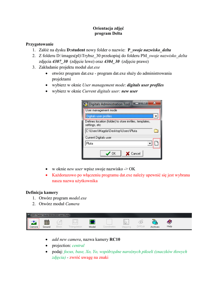 Orientacja zdjęć program Delta Przygotowanie 1. Załóż na dysku D:student nowy folder o nazwie: P_swoje nazwisko_delta 2. Z folderu D:\images(pl)\Trybsz_30 przekopiuj do folderu PM_swoje nazwisko_delta zdjęcia 4307_30 (zdjęcie lewe) oraz 4304_30 (zdjęcie prawe) 3. Zakładanie projektu moduł dat.exe otwórz program dat.exe - program dat.exe służy do administrowania projektami wybierz w oknie User management mode: digitals user profiles wybierz w oknie Current digitals user: new user w oknie new user wpisz swoje nazwisko -> OK Każdorazowo po włączeniu programu dat.exe należy upewnić się jest wybrana nasza nazwa użytkownika Definicja kamery 1. Otwórz program model.exe 2. Otwórz moduł Camera add new camera, nazwa kamery RC10 projection: central podaj: focus, base, Xo, Yo, współrzędne narożnych pikseli (znaczków tłowych zdjęcia) - zwróć uwagę na znaki ustaw aktywną kamerę: klikam prawym przyciskiem myszy na nazwę kamery -> set current camera save as -> nazwa pliku: models.ini - nadpisać utworzony już plik Definiowane fotopunktów 1. otwórz moduł Ground 2. wybierz add, pojawia się okno dialogowe ground point, wpisz współrzędne 4 fotopunktów. Wybieramy te fotopunkty, które są widoczne na obu zdjęciach. 3. niebieską strzałką, przerzuć wszystkie punkty do okna dialogowego block points 4. zapisz plik -> save, powstaje plik ground.txt Orientacja wewnętrzna 1. otwórz moduł model -> inner orientation 2. załaduj zdjęcia 4307_30 (zdjęcie lewe) oraz 4304_30 (zdjęcie prawe) 3. wybierz rodzaj kamery 4. Zaznacz opcje: orientation mode - stereo model; orientation process - start new session; affine transformation -> Proceed 5. zaznacz kursorem 4 znaczki tłowe w kolejności: 1 4 Uwaga: nie pomylić kolejności 2 3 Staję znaczkiem pomiarowym na 1. znaczku tłowym na zdjęciu lewym, ustawiam go precyzyjnie, a następnie z wciśniętym CTRL ustawiam precyzyjnie znaczek pomiarowy na tym samym znaczku tłowym na zdjęciu prawym. Po ustawieniu znaczka zatwierdzam położenie poprzez kliknięcie myszy. Czynność powtarzam dla wszystkich znaczków tłowych. Po zdefiniowaniu 4 znaczków tłowych sprawdzam wyniki w table: Maksymaly błąd 3 µm na każdym znaczku tłowym Jeśli błąd zostanie przekroczony wówczas należy kliknąć w table na dany znaczek tłowy, wybrać repeat oraz ponownie ustawić znaczek pomiarowy na znaczku tłowym. 6. zapisz raport -> save Orientacja wzajemna 1. otwórz moduł model -> relative orientation 2. załaduj zdjęcia 4307_30 (zdjęcie lewe) oraz 4304_30 (zdjęcie prawe) 3. zaznacz: start new session, standard (6) points ->Proceed 4. control -> stereoscope, control on, reverse shutters 5. zaznacz 6 punktów w rejonie Grubera, wskazując dokładnie te same miejsca na zdjęciu lewym oraz prawy. Środek lewego zdjęcia 3 1 5 Środek prawego zdjęcia 4 2 6 Uwaga: nie pomylić kolejności, jeśli np. znaczek 2 zostanie postawiony błędnie, należy postawić pozostałe, a następnie przejść do edycji znaczka 2 6. Maksymalny błąd 1µm 7. zapisz raport -> save Orientacja bezwzględna 1. otwórz moduł model -> absolute orientation 2. załaduj zdjęcia 4307_30 (zdjęcie lewe) oraz 4304_30 (zdjęcie prawe) 3. zaznacz: survey method: aerial photo, orientation method: stereomodel, orientation process: start new session, -> Proceed Podczas orientacji bezwględnej należy odszukać i zaznaczyć na zdjęciach fotopunkty, które zostały wpisane w module ground. Uwaga: nie pomylić kolejności wstawiania 4. Maksymalny błąd orientacji bezwględnej 20cm