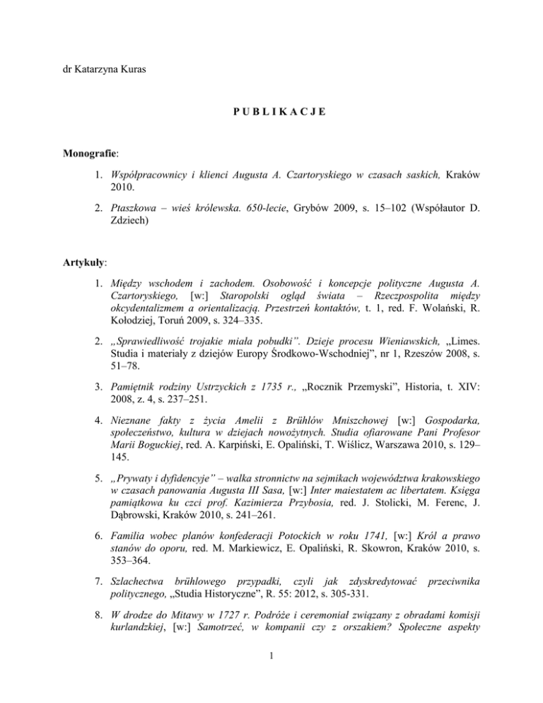 dr Katarzyna Kuras PUBLIKACJE Monografie: 1. Współpracownicy i klienci Augusta A. Czartoryskiego w czasach saskich, Kraków 2010. 2. Ptaszkowa – wieś królewska. 650-lecie, Grybów 2009, s. 15–102 (Współautor D. Zdziech) Artykuły: 1. Między wschodem i zachodem. Osobowość i koncepcje polityczne Augusta A. Czartoryskiego, [w:] Staropolski ogląd świata – Rzeczpospolita między okcydentalizmem a orientalizacją. Przestrzeń kontaktów, t. 1, red. F. Wolański, R. Kołodziej, Toruń 2009, s. 324–335. 2. „Sprawiedliwość trojakie miała pobudki”. Dzieje procesu Wieniawskich, „Limes. Studia i materiały z dziejów Europy Środkowo-Wschodniej”, nr 1, Rzeszów 2008, s. 51–78. 3. Pamiętnik rodziny Ustrzyckich z 1735 r., „Rocznik Przemyski”, Historia, t. XIV: 2008, z. 4, s. 237–251. 4. Nieznane fakty z życia Amelii z Brühlów Mniszchowej [w:] Gospodarka, społeczeństwo, kultura w dziejach nowożytnych. Studia ofiarowane Pani Profesor Marii Boguckiej, red. A. Karpiński, E. Opaliński, T. Wiślicz, Warszawa 2010, s. 129– 145. 5. „Prywaty i dyfidencyje” – walka stronnictw na sejmikach województwa krakowskiego w czasach panowania Augusta III Sasa, [w:] Inter maiestatem ac libertatem. Księga pamiątkowa ku czci prof. Kazimierza Przybosia, red. J. Stolicki, M. Ferenc, J. Dąbrowski, Kraków 2010, s. 241–261. 6. Familia wobec planów konfederacji Potockich w roku 1741, [w:] Król a prawo stanów do oporu, red. M. Markiewicz, E. Opaliński, R. Skowron, Kraków 2010, s. 353–364. 7. Szlachectwa brühlowego przypadki, czyli jak zdyskredytować politycznego, „Studia Historyczne”, R. 55: 2012, s. 305-331. przeciwnika 8. W drodze do Mitawy w 1727 r. Podróże i ceremoniał związany z obradami komisji kurlandzkiej, [w:] Samotrzeć, w kompanii czy z orszakiem? Społeczne aspekty 1 podróżowania w średniowieczu i czasach nowożytnych, red. E. Wółkiewicz, M. Saczyńska, Warszawa 2012, s. 481–498. 9. Rola wybitnych kobiet w polityce w czasach panowania Augusta III Sasa, [w:] Per mulierem… Kobieta w dawnej Polsce w średniowieczu i w dobie staropolskiej, red. K. Justyniarska-Chojak, S. Konarska-Zimnicka, Warszawa 2012, s. 261-278. Biogramy: 1. Strasser Franciszek Ksawery, Polski Słownik Biograficzny, T. XLIV, s. 197. 2. Suchodolski Adam, Polski Słownik Biograficzny, T. XLV, s. 265–266. 3. Suffczyński Michał, Polski Słownik Biograficzny, T. XLV, s. 367–379. 4. Szamocki Adam, Polski Słownik Biograficzny, T. XLVI, s. 555–556. 5. Szamocki Antoni, Polski Słownik Biograficzny, T. XLVI, s. 556–558. 6. Szamocki Jan Wojciech, Polski Słownik Biograficzny, T. XLVI, s. 558–561. 7. Szembek Krzysztof Antoni, Polski Słownik Biograficzny, t. XLVIII, s. 81-89. 8. Szembek Krzysztof Andrzej Jan, Polski Słownik Biograficzny, t. XLVIII, s. 89-93. 9. Szembek Michał, Polski Słownik Biograficzny, t. XLVIII, s. 103-104. 2
