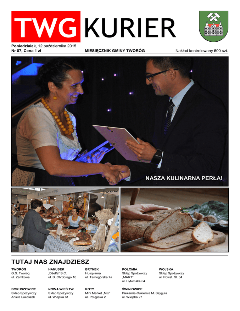 TWG KURIER Poniedziałek, 12 października 2015 Nr 87, Cena 1 zł MIESIĘCZNIK GMINY TWORÓG Nakład kontrolowany 500 szt. NASZA KULINARNA PERŁA! TUTAJ NAS ZNAJDZIESZ TWORÓG G.S. Tworóg ul. Zamkowa HANUSEK „Dżelfa” S.C. ul. B. Chrobrego 16 BRYNEK Husqvarna ul. Tarnogórska 7a POŁOMIA Sklep Spożywczy „MART” ul. Bytomska 64 WOJSKA Sklep Spożywczy ul. Powst. Śl. 64 BORUSZOWICE Sklep Spożywczy Aniela Lukoszek NOWA WIEŚ TW. Sklep Spożywczy ul. Wiejska 61 KOTY Mini Market „Mix” ul. Potępska 2 ŚWINIOWICE Piekarnia-Cukiernia M. Szyguła ul. Wiejska 27 TWG KURIER TABLICA ZAJĘCIA STAŁE W GOK: ZBIÓRKA ZŁOMU ZALICZONA! • warsztaty plastyczne – wtorek i czwartek I grupa: 10 października odbyła się jesienna zbiórka złomu organizowana przez Ochotniczą Straż Pożarną w Tworogu. Strażacy są wdzięczni za przekazane przedmioty. – Dziękujemy bardzo serdecznie wszystkim mieszkańcom sołectw Tworóg, Brynek oraz Nowa Wieś za okazaną pomoc oraz wsparcie podczas „Jesiennej zbiórki złomu”. Środki pozyskane z sprzedaży złomu zostaną przekazane na spłatę kredytu za samochód ratowniczogaśniczy, zakupiony w 2014 roku. Dziękujemy! Strażacy OSP Tworóg.” godz. 15-17, II grupa: godz. 17-19 (bezpłatne) • warsztaty plastyczne dla dorosłych – piątek godz. 16-19 • aerobik – wtorek godz. 19 (płatne) • zumba, pilates – poniedziałek i środa: Zumba: godz.19; Pilates: godz. 20 (płatne) • kółko taneczne – poniedziałek i środa: grupa najmłodsza (4-6 lat) godz. 16, grupa średnia (7-11 lat) godz. 17, grupa starsza (od 12 lat) godz. 18 (bezpłatne) • lekcje gry na instrumentach (keyboard i gitara) – trwają zapisy (możliwość prowadzenia zajęć indywidualnych w domu ucznia lub w GOK-u, numer kontaktowy instruktora: 603 892 988) • lekcje języka angielskiego tel. 531 973 126 CZYTAM SOBIE W BIBLIOTECE Gminna Biblioteka Publiczna w Tworogu przystąpiła do projektu „Czytam sobie w bibliotece”. Akcja ma na celu promocję czytelnictwa. Jest skierowana do najmłodszych czytelników – dzieci w wieku 5-8 lat. UWAGA! Zajęcia, które odbywają się w środy (dotyczy kółka tanecznego, zumby i pilatesu) mogą zostać przeniesione na czwartek – ewentualne zmiany będą podane na stronie www.gok-tworg.pl – zaglądajcie! Więcej informacji na stronie www.czytamsobie.pl R E K L A M A R 2 E K L A M A TWG KURIER WSTĘPNIAK OD REDAKCJI SPIS TREŚCI DRODZY MIESZKAŃCY, TABLICA………………………………………………...str.2 POD LUPĄ …………………………………………......str.4 – O śląskich tradycjach pogrzebowych HOBBYSTA …………………………………………….str.6 – Złoty chłopak – Paintball Tworóg – turniej – Sezon zaliczony! KULTURALNIE………………………………….…..…str.8 – Wokulski i inni – Język obcy – warto znać! – Mamy perłę! – Czytaj książki, będziesz wielki! – Gminne Przedszkole czyta dzieciom NA BIEŻĄCO………………………………….……….str.12 – LKS Orzeł Koty otrzymał nowe stroje – Grzybobranie z Nadleśnictwem Brynek – W Wojsce nigdy nie wieje nudą – Projekt konkursowy „Młodzi pasjonaci” – Warsztaty terapeutyczne – Tworożanie rozpoczynają sezon występów – Fundusz sołecki – zapadły decyzje – Trening „pod chmurką”? W Kotach to możliwe mamy powody do dumy. W naszej gminie mieszkają niezwykle utalentowane osoby, którym w tym numerze poświęcamy sporo miejsca. Jedną z nich jest zdobywczyni kulinarnej „Perły 2015” – prestiżowego, ogólnokrajowego wyróżnienia. Przeczytajcie o swojskich smakach, które doceniły poznańskie podniebienia na str. 10. Od najmłodszych lat wyróżniał się wysokim wzrostem i sportowym zacięciem. W podstawówce usłyszał, że ma naturalne predyspozycje do uprawiania koszykówki. To był strzał w dziesiątkę i początek etapu w życiu obfitującego w medale i puchary. O kim mowa? Odpowiedź znajdziecie w „Hobbyście”! Kiedy najlepiej rozpocząć naukę języka obcego? Dlaczego warto to robić? Jakie lekcje są najlepsze dla naszych dzieci? Przeczytajcie wywiad z nauczycielką języka angielskiego, która dzieli się na naszych łamach swoim doświadczeniem i odpowiada na najczęściej zadawane pytania. Więcej na str. 8. Zapraszamy do lektury! www.twg-kurier.pl [email protected] REDAKTOR NACZELNA Marta Kobędza-Krain KREACJA Łukasz Krain GOŚCINNIE Hanna Blacha, Bożena Dramska-Jańczuk, Barbara Izworska, Hanna Pawełczyk, Anna Rogala-Goj MECENAT Grażyna Chmiel – dyrektor Gminnego Ośrodka Kultury WYDAWCA Gminny Ośrodek Kultury w Tworogu, ul. Zamkowa 1, 42-690 Tworóg, tel. (32) 285 74 92 DRUK Foto&druk www.fotoidruk.pl Redakcja zastrzega sobie prawo do redagowania i skracania tekstów przesyłanych do druku. 3 TWG KURIER POD LUPĄ O ŚLĄSKICH TRADYCJACH POGRZEBOWYCH Wszystkich Świętych sąsiaduje w kalendarzu liturgicznym z Dniem Zadusznym, który jest poświęcony pamięci wszystkich zmarłych. Już na kilka tygodni przed świętem, na cmentarzach widać wzmożony ruch. Rodziny czyszczą groby, przynoszą kwiaty i znicze. Wspominają tych, którzy odeszli. Jednak poza tym wyjątkowym czasem, nie lubimy rozmawiać o śmierci. Wywołuje w nas strach, uczucie bezsilności i stres. Maja i Piotr Kandzia, właściciele Zakładu Pogrzebowego działającego w Tworogu nie mają złudzeń – temat jest trudny. Są jednak przekonani, że warto go oswoić. Śmierć, mimo że jest najdotkliwszą ze strat, pozostaje przecież nieodłącznym komponentem życia. Foto. Istnieją piękne tradycje pogrzebowe zarezerwowane dla członków różańcowej wspólnoty modlitewnej – Stowarzyszenia Żywego Różańca. Podczas pożegnania Róży Różańcowej na trumnie kładzie się symboliczny wielki różaniec (podobny do tego widocznego na zdjęciu znajduje się w tworoskiej parafii), który zostaje ściągnięty tuż przez spuszczeniem trumny do