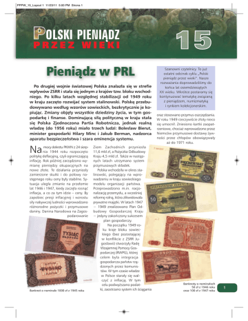 PPPW_15_Layout 1 11/23/11 5:00 PM Strona 1 POLSKI PIENIĄDZ PRZEZ WIEKI Pieniądz w PRL Po drugiej wojnie światowej Polska znalazła się w strefie wpływów ZSRR i stała się jednym z krajów tzw. bloku wschodniego. Po kilku latach względnej stabilizacji od 1949 roku w kraju zaczęto rozwijać system stalinowski. Polskę przebudowywano według wzorów sowieckich, bezkrytycznie je kopiując. Zmiany objęły wszystkie dziedziny życia, w tym gospodarkę i finanse. Dominującą siłą polityczną w kraju stała się Polska Zjednoczona Partia Robotnicza, jednak realną władzę (do 1956 roku) miało trzech ludzi: Bolesław Bierut, minister gospodarki Hilary Minc i Jakub Berman, nadzorca aparatu bezpieczeństwa i szara eminencja systemu. Na mocy dekretu PKWN z 24 sierpnia 1944 roku rozpoczęto politykę deflacyjną, czyli ograniczającą inflację. Rok później zarządzono wymianę pieniędzy okupacyjnych na nowe złote. Te działania przyniosły zamierzone skutki i do połowy następnego roku ceny były stabilne. Sytuacja uległa zmianie na przełomie lat 1946 i 1947, kiedy zaczęła rosnąć inflacja, a co za tym idzie – ceny. By zapobiec presji inflacyjnej i wzrostu siły nabywczej ludności wprowadzano różnorodne pożyczki i przymusowe daniny. Danina Narodowa na Zagospodarowanie Banknot o nominale 1000 zł z 1945 roku Ziem Zachodnich przyniosła 11,6 mld zł, a Pożyczka Odbudowy Kraju 4,5 mld zł. Także w następnych latach utrzymano system przymusowych składek. Polska wchodziła w okres stalinowski, polegający na wprowadzeniu w kraju sowieckiego modelu organizacji państwa. Przeprowadzono m.in. nacjonalizację przemysłu, a wcześniej reformę rolną, która zlikwidowała prywatne majątki. W latach 1947 − 1949 zrealizowano Plan Odbudowy Gospodarczej Kraju − jedyny zakończony sukcesem plan gospodarczy. Na początku 1949 roku kraje bloku sowieckiego (bez pozostającej w konflikcie z ZSRR Jugosławii) stworzyły Radę Wzajemnej Pomocy Gospodarczej (RWPG), której celem była integracja gospodarcza państw rządzonych przez komunistów. W tym czasie władze w Polsce starały się walczyć z inflacją. W tym celu podwyższano podatki, zaostrzano system ich ściągania Szanowni czytelnicy. To już ostatni odcinek cyklu „Polski pieniądz przez wieki”. Nasze rozważania doprowadziliśmy do końca lat osiemdziesiątych XX wieku. Wkrótce postaramy się kontynuować tematykę związaną z pieniądzem, numizmatyką i rynkiem kolekcjonerskim. oraz stosowano przymus oszczędzania. W roku 1949 rzeczywiście złoty nieco się umocnił. Zniesiono kartki zaopatrzeniowe, chociaż wprowadzone przez Niemców przymusowe dostawy żywności przez chłopów obowiązywały aż do 1971 roku. Banknoty o nominałach 50 zł z 1946 roku oraz 100 zł z 1947 roku 1 PPPW_15_Layout 1 11/23/11 5:00 PM Strona 2 PROJEKT DOFINANSOWANY ZE ŚRODKÓW NARODOWEGO BANKU POLSKIEGO Wymiana pieniędzy Na sytuację państw bloku wschodniego wpływały wydarzenia na świecie. W czerwcu 1950 roku rozpoczęła się wojna koreańska. Już jesienią tego roku minister obrony narodowej marsz. Konstanty Rokossowski nakazał − z polecenia Moskwy − przestawienie produkcji przemysłowej w Polsce na tory zbrojeniowe. Odbyło się to kosztem innych inwestycji. Ponownie wprowadzono kartki, pojawiła się inflacja. W tych okolicznościach władze zdecydowały się na radykalny krok – wymianę mieniano w proporcji 1:100. W efekcie wymiany obieg pieniężny zmniejszył się o ok. 60 proc., a ludność straciła 2/3 gotówki. Dodatkowym utrudnieniem był fakt, że ceny miały wyższy przelicznik. Jeśli ktoś posiadał wcześniej 100 zł i chciał kupić towar za 100 zł, to po wymianie posiadał 1 zł, zaś ten sam towar kosztował 3 zł. Niejako przy okazji dokonano rewaluacji złotego do dolara o 66,7 proc. Władza twierdziła, że wymiana pieniędzy (tzw. reforma pieniężna) ma na celu ukrócenie spekulacji. Jednak w związku z przestawieniem gospodarki na tory wojenne i wysokimi wydatkami na ten cel wymiana pieniędzy nie ustabilizowała cen. Dlatego w 1951 roku rozpisano przymusową Narodową Powyżej i obok nowe wzory banknotów wprowadzonych w 1950 roku 2 pieniądza. Była ona przygotowywana w zupełnej tajemnicy i przeprowadzono ją błyskawicznie. 28 października 1950 roku sejm przyjął ustawę wprowadzającą nowego złotego już od 30 października. Perfidia przedsięwzięcia polegała na tym, że decyzję o wymianie podjęto nagle, w sobotę wieczorem, nie dając obywatelom szans na pozbycie się gotówki. Można ją było wymieniać od poniedziałku jedynie przez dziesięć dni. Banknoty powojenne zostały unieważnione, w ich miejsce wprowadzono nowe z datą emisji 1 lipca 1948 roku. Relacja nowego złotego do starego wynosiła 3:100 w przypadku cen, płac oraz wkładów w PKO (kwoty do 100 tys. zł), gotówkę wy- Pożyczkę Rozwoju Sił Polski, dzięki której zdjęto część pieniędzy z rynku. Dwa lata później dokonano drastycznej podwyżki cen (o 40 – 60 proc.). Banknoty wprowadzone w 1950 roku zaprojektował Wacław Borowski. Wydrukowano nominały 2, 5, 10, 20, 50, 100 i 500 zł. Zgodnie ze stylem socrealizmu były ozdobione przedstawieniami robotników i chłopów. Na banknocie o nominale 5 zł widniał traktorzysta orzący pole, na 10 zł chłopi układający snopy zboża na wozie (na rewersie znajdowało się przed- Narodowy Bank Polski w PRL Narodowy Bank Polski został utworzony na mocy dekretu z 15 stycznia 1945 roku. Na wzór sowiecki nie był bankiem centralnym, a jego zadaniem było kredytowanie przemysłu. Dopiero 2 grudnia 1958 roku została uchwalona ustawa o NBP, w której jasno określono zakres jego zadań. Prócz emitowania znaków pieniężnych bank organizował obrót dewizami, kontrolował obrót bezgotówkowy i rozliczenia pieniężne, prowadził kasową i rozliczeniową obsługę budżetu państwa, kredytował jednostki gospodarki narodowej i refinansował instytucje kredyt