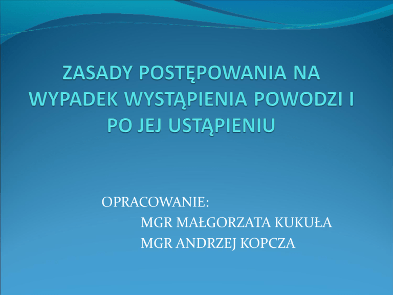 OPRACOWANIE: MGR MAŁGORZATA KUKUŁA MGR ANDRZEJ KOPCZA Powódź – przejściowe zjawisko hydrologiczne polegające na wezbraniu wód rzecznych lub morskich w ciekach wodnych, zbiornikach lub na morzu powodujące po przekroczeniu przez wodę stanu brzegowego zatopienie znacznych obszarów lądu - dolin rzecznych, terenów nadbrzeżnych lub depresyjnych, doprowadzające do wymiernych strat społecznych i materialnych. Jest jedną z najbardziej groźnych i niszczycielskich w skutkach klęsk żywiołowych. Walka z nią jest stale aktualnym problemem ogólnoświatowym. Poważny wpływ na występowanie powodzi ma istniejący układ rzek oraz występująca w poszczególnych okresach roku sytuacja hydrologicznometeorologiczna. POWÓDŹ WE WROCŁAWIU 1997 r. PRZYGOTUJ SIĘ DO POWODZI ZANIM ONA CIĘ ZASKOCZY!!! Poznaj podstawowe pojęcia, związane z zagrożeniem powodziowym: Pogotowie przeciwpowodziowe wprowadza się, gdy poziom wody w rzece wzrasta do poziomu ostrzegawczego i nadal się podnosi. Alarm powodziowy ogłasza się, gdy poziom wody zbliża się do stanu alarmowego. Dowiedz się w swoim urzędzie gminy (miasta) czy: •nie mieszkasz na terenie zagrożonym (zalewowym), jeżeli tak to przy jakim poziomie wody ogłaszany jest stan ostrzegawczy i stan alarmowy; •będą stosowane jakieś sposoby alarmowania (syreny, dzwony, komunikaty radiowe); •w razie powodzi będzie zorganizowana ewakuacja, kto ją będzie przeprowadzał, kiedy, kogo i co obejmie oraz gdzie przewiduje się miejsca przyjęć ludzi i mienia. Jeśli zagrożenie powodzią stanie się realne, zaopatrz się w przydatny sprzęt: •latarki, radioodbiornik bateryjny + zapasowe baterie; •inne źródła światła (świece, lampy naftowe, zapałki, zapalniczki). • Przygotuj się, aby być samowystarczalnym przez okres 3 dni i zdolnym do pomocy sobie i innym. • Poproś krewnych lub znajomych, zamieszkałych na terenach bezpiecznych, by służyli jako miejsce kontaktu dla Twojej rodziny. • Upewnij się, że wszyscy jej członkowie znają adresy i telefony osób kontaktowych. • Zapoznaj rodzinę, jak zabezpiecza się mieszkanie, dom, obejście przed powodzią i grabieżą. • Sprawdź zawory zainstalowane w kanalizacji ściekowej swego domu w celu zapobieżenia cofania się wody z systemu drenowego. W ostateczności użyj dużych korków lub czopów do zatkania przecieków, rur i zbiorników. W CZASIE ZAGROŻENIA POWODZIĄ Miej włączone radio bateryjne na częstotliwości radia regionalnego – albo program miejski, w celu uzyskania komunikatu o zagrożeniu i sposobach postępowania. POSTĘPUJ ZGODNIE Z TREŚCIĄ KOMUNIKATÓW –NIE ZWLEKAJ!!! • W przypadku niebezpieczeństwa natychmiast przemieszczaj się na wyżej położone tereny (miejsca). • Jeżeli władze lokalne ogłoszą ewakuację z terenów zagrożonych, bądź przygotowany na nią wraz z rodziną. • Pamiętaj także o swoich zwierzętach. •Zabezpiecz swoje mieszkanie, swój dom tj. przenieś wartościowe wyposażenie domowe na wyższe piętra domu oraz zabezpiecz parter, jeśli czas na to pozwala. Wykorzystaj do tego celu worki z piaskiem, folię lub inne materiały podręczne. Z posesji wszystkie rzeczy schowaj w budynku lub je przywiąż do czegoś stabilnego, aby nie popłynęły. •W czasie powodzi odłącz urządzenia elektryczne, ale nie dotykaj ich, gdy są wilgotne lub stoją w wodzie. Wyłącz sieć gazową i wodociągową. •W miarę możliwości na wyższych piętrach napełnij wannę i inne pojemniki wodą, po wcześniejszym wysterylizowaniu ich płynami typu: ACE, Bielinka, Chlorobis, inne. •Nie używaj w gospodarstwie domowym wód gruntowych, mogą być zatrute (skażone). •Nie chodź na obszarach zalanych, jeżeli woda przemieszcza się szybko. Fala o głębokości kilkunastu centymetrów może przewrócić i przemieścić dorosłego człowieka. •Jeżeli musisz przekroczyć zalany obszar, użyj do badania gruntu przed sobą tyczki. Do przejścia wybieraj miejsca bez prądu powodziowego. •Po ostrzeżeniu, że spodziewana jest duża powódź, zapewnij swobodny wlew wód powodziowych do piwnicy twego domu lub sam wypełnij ją czystą wodą. Unikniesz w ten sposób zagrożenia uszkodzenia fundamentów domu przez ciśnienie napierających wód powodziowych. •Dzieciom i osobom z ograniczoną świadomością należy przymocować w widocznym miejscu kartkę z imieniem, nazwiskiem oraz miejscem zamieszkania. •Jeżeli zostaniesz wytypowany do pomocy w pracach przeciwpowodziowych (np. do układania lub napełniania worków z piaskiem) – p o m a g a j !!! •W miarę możliwości zapobiegaj tworzeniu się atmosfery paniki, bądź rozsądny, zachowaj trzeźwość umysłu – to połowa sukcesu. UWAGA!!! Dobrze jest mieć ustalone zasady sygnalizacji na wypadek różnych potrzeb, np.: •Kolor BIAŁY – potrzeba ewakuacji; •Kolor CZERWONY – potrzeba żywności i wody; •Kolor NIEBIESKI – potrzeba pomocy medycznej. Po powodzi •Jak najdłużej pozostań poza zasięgiem wód powodziowych, gdyż mogą być skażone, np. produktami ropopochodnymi, nie oczyszczonymi ściekami, bakteriami chorobotwórczymi itp. Nie używaj ich do picia! Mogą być one również pod napięciem z uszkodzonych linii energetycznych napowietrznych lub podziemnych. •Bądź ostrożny, gdy wjeżdżasz na tereny dotknięte powodzią. Drogi mogą być osłabione i nie wytrzymać ciężaru Twojego samochodu (ciągnika), czy innego pojazdu. •Miej zawsze włączone radio w celu uzyskania informacji lokalnych, dotyczących udzielanej pomocy tj. zaopatrzenia w żywność i wodę zdatną do picia i użytku ogólnego. •Zwracaj uwagę na zdrowie i bezpieczeństwo Twoje i Twojej rodziny. Często myj ręce mydłem w czystej wodzie, jeśli miałeś kontakt z wodami powodziowymi. •Pamiętaj o wspomożeniu swoich sąsiadów, którzy mogą potrzebować specjalnej pomocy przy małych dzieciach, starszych lub niepełnosprawnych osobach. •Wyrzuć żywność, 