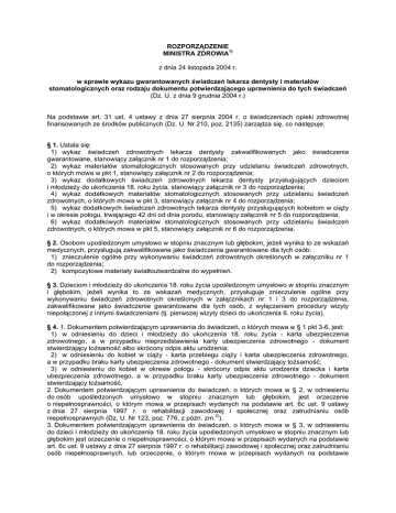ROZPORZĄDZENIE MINISTRA ZDROWIA1) z dnia 24 listopada 2004 r. w sprawie wykazu gwarantowanych świadczeń lekarza dentysty i materiałów stomatologicznych oraz rodzaju dokumentu potwierdzającego uprawnienia do tych świadczeń (Dz. U. z dnia 9 grudnia 2004 r.) Na podstawie art. 31 ust. 4 ustawy z dnia 27 sierpnia 2004 r. o świadczeniach opieki zdrowotnej finansowanych ze środków publicznych (Dz. U. Nr 210, poz. 2135) zarządza się, co następuje: § 1. Ustala się: 1) wykaz świadczeń zdrowotnych lekarza dentysty zakwalifikowanych jako świadczenia gwarantowane, stanowiący załącznik nr 1 do rozporządzenia; 2) wykaz materiałów stomatologicznych stosowanych przy udzielaniu świadczeń zdrowotnych, o których mowa w pkt 1, stanowiący załącznik nr 2 do rozporządzenia; 3) wykaz dodatkowych świadczeń zdrowotnych lekarza dentysty przysługujących dzieciom i młodzieży do ukończenia 18. roku życia, stanowiący załącznik nr 3 do rozporządzenia; 4) wykaz dodatkowych materiałów stomatologicznych stosowanych przy udzielaniu świadczeń zdrowotnych, o których mowa w pkt 3, stanowiący załącznik nr 4 do rozporządzenia; 5) wykaz dodatkowych świadczeń zdrowotnych lekarza dentysty przysługujących kobietom w ciąży i w okresie połogu, trwającego 42 dni od dnia porodu, stanowiący załącznik nr 5 do rozporządzenia; 6) wykaz dodatkowych materiałów stomatologicznych stosowanych przy udzielaniu świadczeń zdrowotnych, o których mowa w pkt 5, stanowiący załącznik nr 6 do rozporządzenia. § 2. Osobom upośledzonym umysłowo w stopniu znacznym lub głębokim, jeżeli wynika to ze wskazań medycznych, przysługują zakwalifikowane jako świadczenia gwarantowane dla tych osób: 1) znieczulenie ogólne przy wykonywaniu świadczeń zdrowotnych określonych w załączniku nr 1 do rozporządzenia; 2) kompozytowe materiały światłoutwardzalne do wypełnień. § 3. Dzieciom i młodzieży do ukończenia 18. roku życia upośledzonym umysłowo w stopniu znacznym i głębokim, jeżeli wynika to ze wskazań medycznych, przysługuje znieczulenie ogólne przy wykonywaniu świadczeń zdrowotnych określonych w załącznikach nr 1 i 3 do rozporządzenia, zakwalifikowane jako świadczenie gwarantowane dla tych osób, z wyłączeniem procedury wizyty niepołączonej z innymi świadczeniami (tj. pierwszej wizyty dzieci do ukończenia 6. roku życia). § 4. 1. Dokumentem potwierdzającym uprawnienia do świadczeń, o których mowa w § 1 pkt 3-6, jest: 1) w odniesieniu do dzieci i młodzieży do ukończenia 18. roku życia - karta ubezpieczenia zdrowotnego, a w przypadku nieprzedstawienia karty ubezpieczenia zdrowotnego - dokument stwierdzający tożsamość albo skrócony odpis aktu urodzenia; 2) w odniesieniu do kobiet w ciąży - karta przebiegu ciąży i karta ubezpieczenia zdrowotnego, a w przypadku braku karty ubezpieczenia zdrowotnego - dokument stwierdzający tożsamość; 3) w odniesieniu do kobiet w okresie połogu - skrócony odpis aktu urodzenia dziecka i karta ubezpieczenia zdrowotnego, a w przypadku braku karty ubezpieczenia zdrowotnego - dokument stwierdzający tożsamość. 2. Dokumentem potwierdzającym uprawnienia do świadczeń, o których mowa w § 2, w odniesieniu do osób upośledzonych umysłowo w stopniu znacznym lub głębokim, jest orzeczenie o niepełnosprawności, o którym mowa w przepisach wydanych na podstawie art. 6c ust. 9 ustawy z dnia 27 sierpnia 1997 r. o rehabilitacji zawodowej i społecznej oraz zatrudnianiu osób niepełnosprawnych (Dz. U. Nr 123, poz. 776, z późn. zm.2)). 3. Dokumentem potwierdzającym uprawnienia do świadczeń, o których mowa w § 3, w odniesieniu do dzieci i młodzieży do ukończenia 18. roku życia upośledzonych umysłowo w stopniu znacznym lub głębokim jest orzeczenie o niepełnosprawności, o którym mowa w przepisach wydanych na podstawie art. 6c ust. 9 ustawy z dnia 27 sierpnia 1997 r. o rehabilitacji zawodowej i społecznej oraz zatrudnianiu osób niepełnosprawnych, lub orzeczenie, o którym mowa w przepisach wydanych na podstawie art. 71b ust. 6 ustawy z dnia 7 września 1991 r. o systemie oświaty (Dz. U. z 2004 r. Nr 256, poz. 2572). § 5. 1. Rozporządzenie stosuje się do gwarantowanych świadczeń lekarza dentysty udzielanych po dniu 1 października 2004 r. 2. Rozporządzenie wchodzi w życie z dniem ogłoszenia.3) ________ 1) Minister Zdrowia kieruje działem administracji rządowej - zdrowie, na podstawie § 1 ust. 2 rozporządzenia Prezesa Rady Ministrów z dnia 11 czerwca 2004 r. w sprawie szczegółowego zakresu działania Ministra Zdrowia (Dz. U. Nr 134, poz. 1439). 2) Zmiany wymienionej ustawy zostały ogłoszone w Dz. U. z 1997 r. Nr 160, poz. 1082, z 1998 r. Nr 99, poz. 628, Nr 106, poz. 668, Nr 137, poz. 887, Nr 156, poz. 1019 i Nr 162, poz. 1118 i 1126, z 1999 r. Nr 49, poz. 486, Nr 90, poz. 1001, Nr 95, poz. 1101 i Nr 111, poz. 1280, z 2000 r. Nr 48, poz. 550 i Nr 119, poz. 1249, z 2001 r. Nr 39, poz. 459, Nr 100, poz. 1080, Nr 125, poz. 1368, Nr 129, poz. 1444 i Nr 154, poz. 1792 i 1800, z 2002 r. Nr 169, poz. 1387, Nr 200, poz. 1679 i 1683 i Nr 241, poz. 2074, z 2003 r. Nr 7, poz. 79, Nr 90, poz. 844, Nr 223, poz. 2217 i Nr 228, poz. 2269 oraz z 2004 r. Nr 96, poz. 959, Nr 99, poz. 1001 i Nr 240, poz. 2407. 3) Niniejsze rozporządzenie było poprzedzone rozporządzeniem Ministra Zdrowia z dnia 18 czerwca 2003 r. w sprawie wykazu bezpłatnych podstawowych świadczeń zdrowotnych lekarza stomatologa oraz podstawowych materiałów stomatologicznych stosowanych przy udzielaniu tych świadczeń (Dz. U. Nr 115, poz. 1088) oraz rozporządzeniem Ministra Zdrowia z dnia 18 czerwca 2003 r. w sprawie wykazu bezpłatnych dodatkowych świadczeń zdrowotnych lekarza stomatologa i materiałów stomatologicznych przysługujących dzieciom i młodzieży do ukończenia 18. roku życia oraz kobietom w ciąży i w okresie połogu, a także określenia rodzaju dokumentu potwierdzającego uprawnienia do tych 