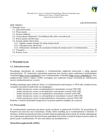 Warunki życia i pracy w krajach Europejskiego Obszaru Gospodarczego Ministerstwo Pracy i Polityki Społecznej Departament Rynku Pracy LIECHTENSTEIN SPIS TREŚCI 3. Warunki życia .................................................................................................................................. 1 3.1. Zakwaterowanie ........................................................................................................................ 1 3.2. Prawo jazdy ............................................................................................................................... 1 3.3. System edukacji ........................................................................................................................ 2 3.4. Uznawalność dyplomów i kwalifikacji dla celów zawodowych .............................................. 5 3.5. Kursy języka narodowego ......................................................................................................... 6 3.6. System opieki zdrowotnej ......................................................................................................... 6 3.6.1. Ogólne zasady dostępu do usług medycznych.................................................................... 6 3.6.2. Ubezpieczenie zdrowotne ................................................................................................... 8 3.6.3. Dokumenty niezbędne do uzyskania świadczeń medycznych w Liechtensteinie .............. 9 3.7. Transport ................................................................................................................................. 10 3.8. Koszty życia ............................................................................................................................ 11 3. Warunki życia 3.1. Zakwaterowanie Poszukując mieszkania do wynajęcia w Liechtensteinie najłatwiej skorzystać z usług agencji nieruchomości. W znalezieniu mieszkania pomocna jest również prasa codzienna Liechtensteiner Vaterland (http://www.vaterland.li/) oraz Liechtensteiner Volksblatt (http://www.volksblatt.li/). Przy podpisywaniu umowy najmu zwykle wymagane jest wpłacenie kaucji zwracanej po zakończeniu umowy (jednomiesięczny czynsz). Według ostatniego spisu ludności, który w Liechtensteinie miał miejsce w 2010 roku, średnie koszty wynajmu mieszkań kształtowały się następująco: - średni miesięczny czynsz za jednopokojowe mieszkanie wynosił 790 CHF, - średni miesięczny czynsz za dwupokojowe mieszkanie wynosił 1076 CHF, - średni miesięczny czynsz za trzypokojowe mieszkanie wynosił 1430 CHF, - średni miesięczny czynsz za czteropokojowe mieszkanie wynosił 1680 CHF, - średni miesięczny czynsz za pięciopokojowe mieszkanie wynosił 1830 CHF. Rodziny o niskich dochodach mogą liczyć na pomoc państwa (dopłaty do czynszu). 3.2. Prawo jazdy W Liechtensteinie uznawane jest prawo jazdy uzyskane w państwach UE/EOG. Po przyjeździe do Księstwa nie musi być ono wymieniane. Osoby, które osiedlają się w Liechtensteinie w terminie 12 miesięcy od dnia przyjazdu powinny przesłać kopię posiadanego prawa jazdy do urzędu zajmującego się wydawaniem uprawnień do kierowania pojazdami lub można wymienić krajowe prawo jazdy na prawo jazdy Liechtensteinu. W tym celu należy się skontaktować z: Motorfahrzeugkontrolle (MFK) 1 Warunki życia i pracy w krajach Europejskiego Obszaru Gospodarczego Ministerstwo Pracy i Polityki Społecznej Departament Rynku Pracy Gewerbeweg 4, Postfach 684 9490 Vaduz Tel. +423 236 75 01 Fax +423 236 75 09 e-mail: [email protected] Zasady ruchu drogowego w Liechtensteinie są takie same jak w Szwajcarii. Najważniejsze przepisy: - zapinanie pasów bezpieczeństwa z przodu i z tyłu jest obowiązkowe, - mandaty mogą być egzekwowane na miejscu wykroczenia dlatego należy mieć przy sobie dokumenty oraz pieniądze, - dopuszczalny poziom alkoholu wynosi 0,5 promila a kary za jego przekroczenia są bardzo wysokie, - dopuszczalna prędkość na drogach głównych wynosi 120 km/h, na drogach otwartych 80 km/h, w terenach zabudowanych 50 km/h. 3.3. System edukacji Przedszkole Przedszkole jest tradycyjną formą edukacji przedszkolnej w Liechtensteinie. Dzieci rozpoczynające przedszkole muszą mieć ukończone 4 lata. Przedszkola są bezpłatne. Opracowany przez Ministerstwo Edukacji Księstwa Liechtensteinu „Program nauczania Księstwa Liechtensteinu” jest wiążący dla przedszkoli. Szczególny nacisk w przedszkolach położony jest na edukację społeczną i rozwój osobisty, wymowę, matematykę, edukację ruchową, muzyczną i rytmiczną oraz na rozwój kreatywności u dzieci. Co do zasady edukacja w przedszkolu w Liechtensteinie trwa 2 lata. Dzieci, dla których język niemiecki nie jest językiem ojczystym mają obowiązek dwuletniej edukacji w przedszkolach. Terminy rejestracji ogłaszane są w prasie, w Dzienniku Urzędowym Księstwa Liechtensteinu (na stronie internetowej www.amtsblatt.llv.li). Pod koniec lutego rodzice otrzymują informator wraz z formularzem zgłoszeniowym, który musi zostać złożony w urzędzie gminy przed ogłoszonym terminem rejestracji. Więcej informacji na temat zapisu do przedszkoli w Liechtensteinie można znaleźć w broszurze „Eintritt in den Kindergarten – Informationen für Eltern (http://www.llv.li/files/sa/pdf-llv-sakindergarteneintritt_infos_fuer_eltern.pdf) Szkoła podstawowa Nauka w szkole podstawowej obejmuje pięć klas i jest początkiem obowiązkowego kształcenia. Program nauczania w szkołach podstawowych jest jednakowy dla wszystkich dzieci. Nauka jest bezpłatna. Do nauki w szkole podstawowej dopuszczone są dzieci, które do końca czerwca każdego roku ukończyły 6 rok życia. Szczegółowe informacje dotyczące przejścia z przedszkola do szkoły podstawowej w broszurze „Übertritt Kindergarten – Primarschule – Informationen für Eltern” http://www.llv.li/files/sa/pdf-llvsa-uebertritt_kg_ps_infos_fuer_elter