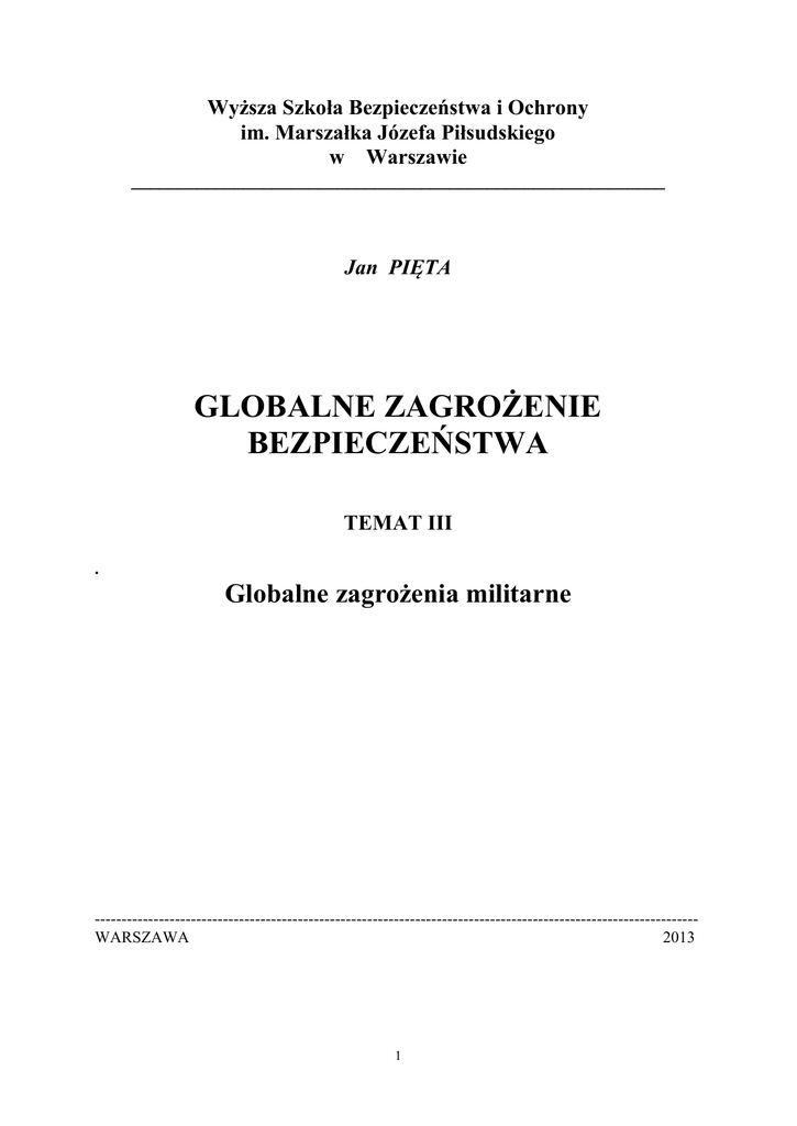 Wyższa Szkoła Bezpieczeństwa i Ochrony im. Marszałka Józefa Piłsudskiego w Warszawie _________________________________________________________ Jan PIĘTA GLOBALNE ZAGROŻENIE BEZPIECZEŃSTWA TEMAT III . Globalne zagrożenia militarne ----------------------------------------------------------------------------------------------------------------WARSZAWA 2013 1 2 Wstęp …5 1. Wojna 1.1. 1.2. 1.3. 1.4. 1.5. 1.6. 1.7. 7 Wojna jako zjawisko społeczno-polityczne …7 Wojna w prawie międzynarodowym …7 Ograniczenia prawa do wojny …7 Prawo antywojenne i wojenne …8 Konsekwencje pogwałcenia prawa wojennego ...9 Poglądy na wojnę wierzeniach i religiach …9 Poglądy na wojnę w pracach teoretyków wojskowych …10 2. Bezpieczeństwo militarne ..12 2.1. Pojęcie bezpieczeństwa militarnego …12 2.2. Militarne determinanty bezpieczeństwa narodowego …12 2.3. Liczebność sił zbrojnych …13 2.4. Wyposażenie sił zbrojnych …13 2.5. Wyszkolenie sił zbrojnych …14 2.6.Rezerwy osobowe sił zbrojnych …16 2.7. Rezerwy materiałowe sił zbrojnych …17 2.8. Koncepcja i plany użycia sił zbrojnych …18 2.9. Sojusze wojskowe …18 2.10. Wnioski …18 3. Globalizacja militarna …21 3.1. Definicja globalizacji militarnej …21 3.2. Podboje grecko-macedońskie Aleksandra Wielkiego …22 3.3. Budowa cesarstwa rzymskiego przez Cezara i jego następców …22 3.4. Imperium mongolskie …23 3.5. Kampanie wojenne cesarza Napoleona I …24 3.6. Pierwsza wojna światowa …25 3.7. Druga wojna światowa …26 3.8. Sojusze i porozumienia obronne …28 3.8.1. Organizacja Paktu Północnoatlantyckiego …28 3.8.2. Układ Warszawski ,…29… 3.8.3. Organizacja Paktu Azji Południowo-Wschodniej …30 3.8.4. Organizacja Paktu Bagdadzkiego …30 3.8.5. Pakt Bezpieczeństwa Pacyfiku …31 3.9.Organizacja Narodów Zjednoczonych …31 3.10. Udział sił zbrojnych RP w operacjach poza granicami państwa …32 3 4 Wstęp Globalne zagrożenie bezpieczeństwa jest przedmiotem nauczania w Wyższej Szkole Bezpieczeństwa i Ochrony na kierunku bezpieczeństwo narodowe w wymiarze 30 godzin lekcyjnych, w tym 15 godzin wykładów i 15 godzin ćwiczeń. Celem przedmiotu jest pogłębienie wiedzy, umiejętności i kompetencji studentów z zakresu teoretycznych podstaw bezpieczeństwa w wymiarze globalnym i jego podstaw prawnych oraz przygotowanie studentów do właściwej oceny i interpretacji zjawisk zachodzących w sytuacji bezpieczeństwa Polski i regionu, a także rozszerzenie zakresu ich wiedzy, umiejętności i kompetencji w odniesieniu do całej Europy i świata. Treści nauczania podzielone są na pięć jednostek leksykalnych, które obejmują następujące tematy: bezpieczeństwo i globalne źródła zagrożeń, globalne zagrożenia polityczne, globalne zagrożenia militarne, globalne zagrożenia ekonomiczne, globalne zagrożenia społeczne i globalne zagrożenia ekologiczne. W ramach problematyki dotyczącej globalnych zagrożeń militarnych, (tematu trzeciego) wyszczególniono następujące zagadnienia: wojna, bezpieczeństwo militarne i globalizacja militarna. 5 6 7 1.Wojna 1.1.Wojna jako zjawisko społeczno-polityczne Pojęcie wojny jako zjawiska społeczno-politycznego przedstawiono w tabeli 1.1. Tabela 1.1. WOJNA JAKO ZJAWISKO SPOŁECZNO-POLITYCZNE Wojna jako zjawisko społeczno-polityczne stanowi integralną część dziejów ludzkości od początków organizacji społecznych. Ma zasięg rosnący wraz z rozwojem technologii. Powoduje rosnące cierpienia oraz straty ludzkie i materialne, a od zbudowania broni jądrowej (1945) i środków jej przenoszenia zagraża całkowitą zagładą człowieka i życia na Ziemi. Pojęciu wojny nadawano różne znaczenia. We współczesnym języku polskim najczęściej jest określana jako zorganizowana walka zbrojna między państwami, narodami lub grupami społecznymi. W prawie międzynarodowym coraz częściej znajduje zastosowanie szersze określenie — konflikt zbrojny. Pojęciem jeszcze szerszym niż wojna i konflikt zbrojny, stosowanym także w prawie międzynarodowym, jest — użycie siły, którym posłużono się w Karcie Narodów Zjednoczonych. Obejmuje ono nie tylko przypadki, w których odbywa się starcie zbrojne dwóch lub więcej przeciwników, ale akcje zbrojne, które nie napotykają zbrojnego oporu, jak to zdarza się często przy interwencjach zbrojnych. Wojna w prawie międzynarodowym 1.2. Pojęcie wojny w prawie międzynarodowym przedstawiono w tabeli 1.2. Tabela 1.2 WOJNA W PRAWIE MIĘDZYNARODOWYM Prawo międzynarodowe zajmuje się dwiema stronami wojny: prawem państw do uciekania się do wojny i ograniczeniami w tym zakresie, zwanym również prawem antywojennym, oraz regulowaniem przepisów prawnych obowiązujących w czasie wojny, zwanym prawem wojennym. W przeszłości prawo do wojny uważano za jeden z trzech czynników, składających się na suwerenność państwa: 1) prawo zawierania traktatów, 2) prawo do wysyłania i przyjmowania posłów i 3) prawo do wojny. Od średniowiecza dokonywała się ewolucja stosunku prawa międzynarodowego do wojny między państwami, zmierzająca do ograniczenia prawa do wojny i jej delegalizacji. 1.3. Ograniczenia prawa do wojny Ograniczenia prawa do wojny zawarte w porozumieniach międzynarodowych przedstawiono w tabeli 1.3. 8 Tabela 1.3 OGRANICZENIA PRAWA DO WOJNY Ograniczenia prawa do wojny zawiera: 1) III konwencja haska z (1907), 2) Pakt Ligi Narodów (1920), 3) Karta Narodów Zjednoczonych (1945), 4) Deklaracja zasad prawa międzynarodowego (1970), 5) Akt końcowy Konferencji Bezpieczeństwa i Współpracy w Europie (1975). Pierwszą próbę ograniczenia prawa państw do wszczynania w. zawiera III konwencja haska z 1907; w sposób istotny prawo to ograniczył Pakt Ligi Narodów (1920). Po II wojnie świat. nastąpiły dalsze ograniczenia prawa do wojny; w Karcie Narodów Zjednoczonych, podpisanej 26 VI 1945 w San Francisco, która weszła w życie 24 X 1945 i stanowi podstawę prawną i
