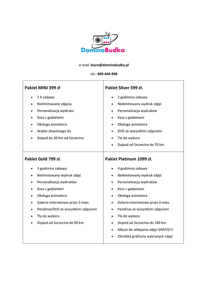 e-mail: [email protected] tel.: 609-444-908 Pakiet MINI 399 zł Pakiet Silver 599 zł. 1 h zabawy 2 godzinna zabawa Nielimitowane zdjęcia Nielimitowany wydruk zdjęć Personalizacja wydruku Personalizacja wydruków Kosz z gadżetami Kosz z gadżetami Obsługa animatora Obsługa animatora Wybór dowolnego tła DVD ze wszystkimi zdjęciami Dojazd do 30 km od Szczecina Tła do wyboru Dojazd od Szczecina do 70 km Pakiet Gold 799 zł. Pakiet Platinum 1099 zł. 3 godzinna zabawa 4 godzinna zabawa Nielimitowany wydruk zdjęć Nielimitowany wydruk zdjęć Personalizacja wydruków Personalizacja wydruków Kosz z gadżetami Kosz z gadżetami Obsługa animatora Obsługa animatora Galeria internetowa przez 3 mies. Galeria internetowa przez 3 mies. Pendrive/DVD ze wszystkimi zdjęciami Pendrive ze wszystkimi zdjęciami Tła do wyboru Tła do wyboru Dojazd od Szczecina do 90 km Dojazd od Szczecina do 100 km Album do wklejania zdjęć GRATIS!!! Obróbka graficzna wybranych zdjęć