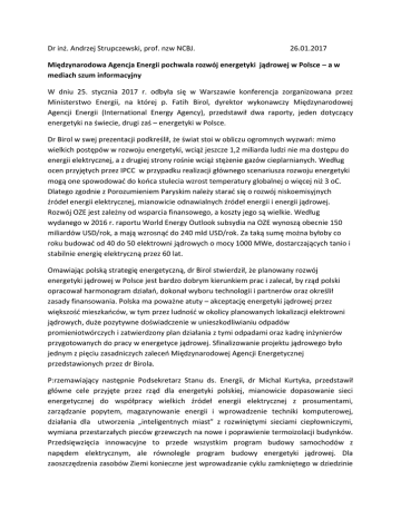 Dr inż. Andrzej Strupczewski, prof. nzw NCBJ. 26.01.2017 Międzynarodowa Agencja Energii pochwala rozwój energetyki jądrowej w Polsce – a w mediach szum informacyjny W dniu 25. stycznia 2017 r. odbyła się w Warszawie konferencja zorganizowana przez Ministerstwo Energii, na której p. Fatih Birol, dyrektor wykonawczy Międzynarodowej Agencji Energii (International Energy Agency), przedstawił dwa raporty, jeden dotyczący energetyki na świecie, drugi zaś – energetyki w Polsce. Dr Birol w swej prezentacji podkreślił, że świat stoi w obliczu ogromnych wyzwao: mimo wielkich postępów w rozwoju energetyki, wciąż jeszcze 1,2 miliarda ludzi nie ma dostępu do energii elektrycznej, a z drugiej strony rośnie wciąż stężenie gazów cieplarnianych. Według ocen przyjętych przez IPCC w przypadku realizacji głównego scenariusza rozwoju energetyki mogą one spowodowad do kooca stulecia wzrost temperatury globalnej o więcej niż 3 oC. Dlatego zgodnie z Porozumieniem Paryskim należy starad się o rozwój niskoemisyjnych źródeł energii elektrycznej, mianowicie odnawialnych źródeł energii i energii jądrowej. Rozwój OZE jest zależny od wsparcia finansowego, a koszty jego są wielkie. Według wydanego w 2016 r. raportu World Energy Outlook subsydia na OZE wynoszą obecnie 150 miliardów USD/rok, a mają wzrosnąd do 240 mld USD/rok. Za taką sumę można byłoby co roku budowad od 40 do 50 elektrowni jądrowych o mocy 1000 MWe, dostarczających tanio i stabilnie energię elektryczną przez 60 lat. Omawiając polską strategię energetyczną, dr Birol stwierdził, że planowany rozwój energetyki jądrowej w Polsce jest bardzo dobrym kierunkiem prac i zalecał, by rząd polski opracował harmonogram działao, dokonał wyboru technologii i partnerów oraz określił zasady finansowania. Polska ma poważne atuty – akceptację energetyki jądrowej przez większośd mieszkaoców, w tym przez ludnośd w okolicy planowanych lokalizacji elektrowni jądrowych, duże pozytywne doświadczenie w unieszkodliwianiu odpadów promieniotwórczych i zatwierdzony plan działania z tymi odpadami oraz kadrę inżynierów przygotowanych do pracy w energetyce jądrowej. Sfinalizowanie projektu jądrowego było jednym z pięciu zasadniczych zaleceo Międzynarodowej Agencji Energetycznej przedstawionych przez dr Birola. P:rzemawiający następnie Podsekretarz Stanu ds. Energii, dr Michal Kurtyka, przedstawił główne cele przyjęte przez rząd dla energetyki polskiej, mianowicie dopasowanie sieci energetycznej do współpracy wielkich źródeł energii elektrycznej z prosumentami, zarządzanie popytem, magazynowanie energii i wprowadzenie techniki komputerowej, działania dla utworzenia „inteligentnych miast” z rozwiniętymi sieciami ciepłowniczymi, wymiana przestarzałych pieców grzewczych na nowe i poprawienie termoizolacji budynków. Przedsięwzięcia innowacyjne to przede wszystkim program budowy samochodów z napędem elektrycznym, ale równolegle program budowy energetyki jądrowej. Dla zaoszczędzenia zasobów Ziemi konieczne jest wprowadzanie cyklu zamkniętego w dziedzinie paliw i użytkowanie biomasy, a dla OZE poparcie dla klastrów wiejskich wykorzystujących różne rodzaje OZE, które dzięki ich różnorodności zredukują nierównomiernośd wytwarzania energii elektrycznej z wiatru i słooca. Minister Kurtyka nie przedstawiał konkretnych schematów finansowania energetyki jądrowej ani źródeł OZE, ale oświadczył, że takie prace trwają i będą przedstawione rządowi. Wypowiedzi zarówno dyrektora F. Birola jak i ministra M. Kurtyki były bardzo pozytywne wobec energetyki jądrowej. Dlatego pełnym zaskoczeniem było ogłoszenie w kilka godzin później przez radio RMF FM że minister energii Tchórzewski oświadczył, że projekt elektrowni jądrowej jest zawieszony i może nawet zostad ostatecznie porzucony. Po dokładniejszym przeczytaniu tekstu wywiadu okazało się, że nie odpowiada on tytułowi nadanemu mu przez RMF FM, bo minister stwierdził, że „Tu ja muszę podjąd decyzję”, a w odpowiedzi na pytanie dziennikarza odpowiedział, że „decyzja o ewentualnej budowie elektrowni jądrowej zostanie podjęta do kooca br.”. W koocu dnia Ministerstwo Energii oświadczyło, że „działania przygotowawcze dotyczące energetyki jądrowej są kontynuowane”, a rankiem 26 stycznia Biznes Alert podał do wiadomości, że rząd zamierza przekazad swoją decyzje o dalszych losach projektu budowy w Polsce elektrowni jądrowej podczas konferencji pt.: "Promieniujemy na całą gospodarkę - Polski przemysł dla elektrowni jądrowe", która odbędzie się 30 stycznia w Ministerstwie Energii. Mimo tego szumu informacyjnego prace w PGE EJ1 nad przygotowaniem przetargu na dostawę technologii dla pierwszej elektrowni jądrowej trwają. Ekonomiści zwracają też uwagę, że chociaż nakłady inwestycyjne na elektrownię jądrową są wyższe niż na węglową, to po uwzględnieniu niskich kosztów paliwa jądrowego i wysokich kosztów węgla oraz kosztów zanieczyszczania atmosfery okaże się, że energia elektryczna z elektrowni jądrowych jest najtaosza. Budując elektrownię jądrową dzisiaj, zapewniamy sobie tanią energię elektryczną przez dziesiątki lat i robimy prezent naszym dzieciom i wnukom. W krajach, które zbudowały dotychczas elektrownie jądrowe, pochodząca z nich energii elektryczna jest taosza niż elektrycznośd z innych źródeł. Treść raportów Międzynarodowej Agencji Energetycznej przedstawiamy krótko poniżej. Raport „Perspektywy energetyczne na świecie w 2016 roku” Międzynarodowa Agencja Energii zrzeszająca 90 krajów, do których należy i Polska, opublikowała najnowszy raport o stanie i perspektywach energetyki na świecie “World Energy Outlook 2016”. Raport ten podaje, że w roku 2015 został zahamowany wzrost emisji CO2 powodowanych wytwarzaniem energii, głównie dzięki obniżeniu energochłonności gospodarki św