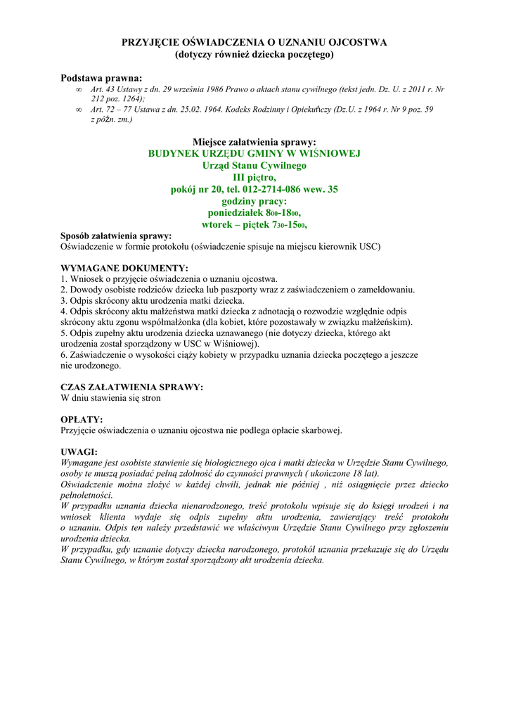 PRZYJĘCIE OŚWIADCZENIA O UZNANIU OJCOSTWA (dotyczy również dziecka poczętego) Podstawa prawna: • • Art. 43 Ustawy z dn. 29 września 1986 Prawo o aktach stanu cywilnego (tekst jedn. Dz. U. z 2011 r. Nr 212 poz. 1264); Art. 72 – 77 Ustawa z dn. 25.02. 1964. Kodeks Rodzinny i Opiekuńczy (Dz.U. z 1964 r. Nr 9 poz. 59 z późn. zm.) Miejsce załatwienia sprawy: BUDYNEK URZĘDU GMINY W WIŚNIOWEJ Urząd Stanu Cywilnego III piętro, pokój nr 20, tel. 012-2714-086 wew. 35 godziny pracy: poniedziałek 800-1800, wtorek – piętek 730-1500, Sposób załatwienia sprawy: Oświadczenie w formie protokołu (oświadczenie spisuje na miejscu kierownik USC) WYMAGANE DOKUMENTY: 1. Wniosek o przyjęcie oświadczenia o uznaniu ojcostwa. 2. Dowody osobiste rodziców dziecka lub paszporty wraz z zaświadczeniem o zameldowaniu. 3. Odpis skrócony aktu urodzenia matki dziecka. 4. Odpis skrócony aktu małżeństwa matki dziecka z adnotacją o rozwodzie względnie odpis skrócony aktu zgonu współmałżonka (dla kobiet, które pozostawały w związku małżeńskim). 5. Odpis zupełny aktu urodzenia dziecka uznawanego (nie dotyczy dziecka, którego akt urodzenia został sporządzony w USC w Wiśniowej). 6. Zaświadczenie o wysokości ciąży kobiety w przypadku uznania dziecka poczętego a jeszcze nie urodzonego. CZAS ZAŁATWIENIA SPRAWY: W dniu stawienia się stron OPŁATY: Przyjęcie oświadczenia o uznaniu ojcostwa nie podlega opłacie skarbowej. UWAGI: Wymagane jest osobiste stawienie się biologicznego ojca i matki dziecka w Urzędzie Stanu Cywilnego, osoby te muszą posiadać pełną zdolność do czynności prawnych ( ukończone 18 lat). Oświadczenie można złożyć w każdej chwili, jednak nie później , niż osiągnięcie przez dziecko pełnoletności. W przypadku uznania dziecka nienarodzonego, treść protokołu wpisuje się do księgi urodzeń i na wniosek klienta wydaje się odpis zupełny aktu urodzenia, zawierający treść protokołu o uznaniu. Odpis ten należy przedstawić we właściwym Urzędzie Stanu Cywilnego przy zgłoszeniu urodzenia dziecka. W przypadku, gdy uznanie dotyczy dziecka narodzonego, protokół uznania przekazuje się do Urzędu Stanu Cywilnego, w którym został sporządzony akt urodzenia dziecka.