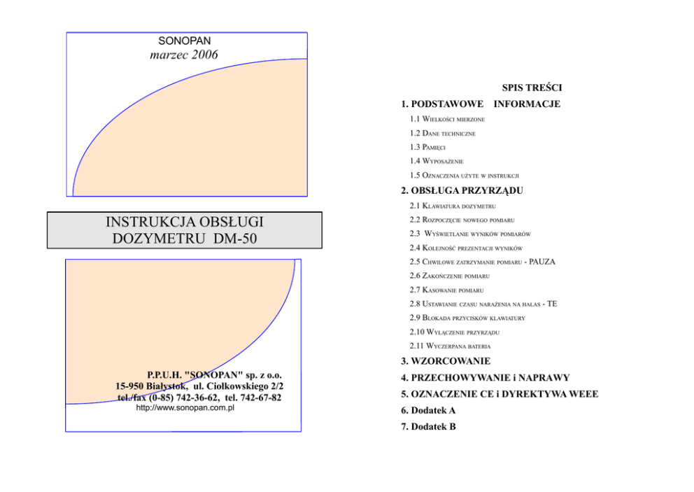 SONOPAN marzec 2006 SPIS TREŚCI 1. PODSTAWOWE INFORMACJE 1.1 WIELKOŚCI MIERZONE 1.2 DANE TECHNICZNE 1.3 PAMIĘCI 1.4 WYPOSAŻENIE 1.5 OZNACZENIA UŻYTE W INSTRUKCJI 2. OBSŁUGA PRZYRZĄDU 2.1 KLAWIATURA DOZYMETRU INSTRUKCJA OBSŁUGI DOZYMETRU DM-50 2.2 ROZPOCZĘCIE NOWEGO POMIARU 2.3 WYŚWIETLANIE WYNIKÓW POMIARÓW 2.4 KOLEJNOŚĆ PREZENTACJI WYNIKÓW 2.5 CHWILOWE ZATRZYMANIE POMIARU - PAUZA 2.6 ZAKOŃCZENIE POMIARU 2.7 KASOWANIE POMIARU 2.8 USTAWIANIE CZASU NARAŻENIA NA HAŁAS - TE 2.9 BLOKADA PRZYCISKÓW KLAWIATURY 2.10 WYŁĄCZENIE PRZYRZĄDU 2.11 WYCZERPANA BATERIA 3. WZORCOWANIE P.P.U.H. "SONOPAN" sp. z o.o. 15-950 Białystok, ul. Ciołkowskiego 2/2 tel./fax (0-85) 742-36-62, tel. 742-67-82 http://www.sonopan.com.pl 4. PRZECHOWYWANIE i NAPRAWY 5. OZNACZENIE CE i DYREKTYWA WEEE 6. Dodatek A 7. Dodatek B Dozymetr spełnia wymagania norm: 3 PN-EN 61252 "Wymagania dotyczące indywidualnych mierników ekspozycji na hałas." 3 IEC 804 "Integrating - Averaging sound level meters" 3 PN-79/T-06460 "Mierniki poziomu dźwięku. Wymagania ogólne i badania." dla przyrządów klasy dokładności 2. Typ przyrządu został zatwierdzony przez Główny Urząd Miar i uzyskał znak typu - RP T 01 199 Rys.1 Widok dozymetru DM-50. 2 1 03.04.06 Informacje podstawowe Informacje podstawowe 1. PODSTAWOWE INFORMACJE Dozymetr DM-50 możne mierzyć różne sygnały akustyczne: ustalone, nieustalone i impulsowe. Posiada tor pomiarowy wartości skutecznej (LAeq), układ przekroczenia 135dB wartości szczytowej LCpk oraz wskaźnik przesterowania z podtrzymaniem. Umożliwia jednoczesny pomiar wartości skutecznej na charakterystyce częstotliwościowej „A”, przy charakterystyce dynamicznej „S”, oraz kontrolę przekroczenia 135dB wartości szczytowej na charakterystyce częstotliwościowej „C”. 1.1 Wielkości mierzone Dozymetr DM-50 zgodnie z normą PN-EN 61252 jest przyrządem klasy dokładności 2. Umożliwia pomiar wielkości określających narażenie pracownika na hałas na stanowisku pracy zgodnie z normą PN-N-01307. Mierzy także poziom ekspozycji na hałas odniesiony do 8 - godzinnego (lub innego ustawianego) czasu pracy. Pamięć dozymetru umożliwia monitorowanie hałasu tzn. zapis LAeq , LAmx i przekroczenia 135dB LCpk do pamięci co 15 sekund przez czas 8 godzin. Dozymetr DM-50 umożliwia równoczesny pomiar następujących wielkości: LAS chwilowy poziom dźwięku SPL (SLOW) – maksymalna wartość skuteczna za okres 1 sekundy LAmx - maksymalny poziom dźwięku LAS od początku pomiaru LAeq - równoważny poziom dźwięku A (zgodnie z PN-EN 61252) E [Pa2h] E 8h [Pa2h] LAE - LEX,T poziom ekspozycji na hałas odniesiony do 8 godzinnego (lub innego ustawianego) czasu pracy Informuje o przekroczeniu 135dB szczytowego poziomu dźwięku C, LCpk i przesterowaniu Czas pomiaru Określenia w postaci wzorów matematycznych powyższych wielkości znajdują się w "dodatku A". 1.2 Dane techniczne Korekcyjne charakterystyki częstotliwościowe A i C zgodne z PN-79/T-06460 (IEC 651) Stała czasowa detektora wartości skutecznej SLOW (zgodne z PN-79/T-06460) Parametry detektora wartości skutecznej zgodne z PN-EN 61252 Mikrofon elektrostatyczny typ ¼” MK401 Zakres pomiarowy LAeq i LAS E 0,01 – 999,9 Pa2h E 8h 0,01 – 999,9 [Pa2h] Ekspozycja na hałas za czas pomiaru LAE (SEL) 75 - 200 dB Ekspozycja na hałas za czas pomiaru różny od 8h przeliczona tak jak gdyby ekspozycja trwała 8 godz. LEX,T 75 - 135 dB Historia pomiaru – zapis do pamięci LAeq , LAmx, co 15 s. ekspozycyjny poziom dźwięku „A” (SEL) 3 03.04.06 75 - 135 dB Informacje podstawowe 4 Informacje podstawowe Interfejs szeregowy zgodny z EIA/TIA-232-E, dostępny poprzez gniazdo mikrofonowe Wyświetlacz alfanumeryczny 2 x 12 znaków Poziom odniesienia ciśnienia akustycznego 94 dB Częstotliwość odniesienia 1000 Hz Błąd podstawowy 1 0,7 dB Zakres temperatury pracy 0 1 +40 1C Zakres temperatury przechowywania -10 1 +50 1C Zakres wilgotności względnej 30 1 95 % Czas nagrzewania ok. 1 min. Wymiary bez mikrofonu 140 x 65 x 25 mm Zasilanie bateria 9V alkaliczna Czas ciągłej pracy z nową baterią około Masa PAMIĘĆ HISTORII POMIARU Pamięć ta umożliwia monitorowanie hałasu tzn. zapis do pamięci wartości LAeq, LAmx co 15s. oraz informacji o przekroczeniu 135dB „C” Peak i przekroczeniu zakresu. Zapis tych wielkości następuje automatycznie podczas trwania pomiaru (około 8 godzin 30 minut). Po tym czasie dozymetr nadal mierzy, ale pamięć historii nie jest już zapisywana, gdyż cała została wykorzystana. 1.4 Wyposażenie PODSTAWOWE: bateria 9V (6LR61) alkaliczna instrukcja obsługi karta gwarancyjna osłona przeciwwietrzna walizeczka transportowa program DM-50 Monitor do komputera PC przewód połączeniowy RS232C szt.1 szt.1 szt.1 szt.1 szt.1 szt.1 szt.1 24 godz. DODATKOWE: kalibrator akustyczny 330g 1.3 Pamięci 1.5 Oznaczenia użyte w instrukcji Dozymetr posiada dwa rodzaje pamięci: Przyciski dozymetru oznaczone są Pamięć operacyjna Pamięć historii pomiaru jako wyrazy w cudzysłowach np.: „WYNIKI”. PAMIĘĆ OPERACYJNA W pamięci operacyjnej są przechowywane: czas pomiaru oraz wyniki bieżącego pomiaru uaktualniane raz na sekundę. Napisy w cudzysłowach oraz wyróżnione „KURSYWĄ” oznaczają napisy na wyświetlaczu dozymetru. 6 5 03.04.06 Informacje podstawowe Informacje podstawowe UWAGA! Kasowanie ostatniego pomiaru jednocześnie kasuje zapis jego historii. Każdy nowy pomiar zapisuje historię od początku pamięci . 2. OBSŁUGA PRZYRZĄDU 2.1 Klawiatura dozymetru 2.3 Wyświetlanie wyników pomiarów Po naciśnięciu przycisku „WYNIKI” na wyświetlaczu pojawia się opis i wynik jednej z wielkości mierzonych. Kolejne wyniki otrzymuje się przez naciskanie przycisku „WYNIKI” . Poniższy rysunek wyjaśnia dodatkowe znaki pojawiające się na wyświetlaczu. Ostrze żenie o wyczerpanej baterii Wyst ąpiło przekroczenie 135dB C peak Wynik pod zakresem Wyst ąpiło przekroczenie zakres