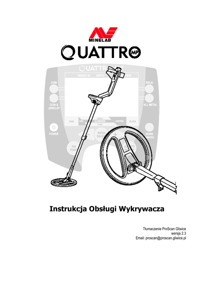 Instrukcja Obsługi Wykrywacza Tłumaczenie ProScan Gliwice wersja 2.3 Email: [email protected] Minelab Quattro MP Spis Treści 1 Wprowadzenie _________________________________________________________ 3 1.1 Technologia Full Band Spectrum (FBS) .......................................................................4 1.2 Parametry techniczne wykrywacza Quattro MP ...........................................................5 2 Montaż wykrywacza______________________________________________________ 6 3 Sondy _________________________________________________________________ 7 4 Zasilanie_______________________________________________________________ 7 4.1 Wyjmowanie i wkładanie zasobnika .............................................................................7 4.2 Instalowanie baterii alkalicznych ..................................................................................7 4.3 Ładowanie zasobnika z akumulatorkami NiMH............................................................7 4.4 Wskaźnik stanu baterii..................................................................................................7 5 SŁUCHAWKI____________________________________________________________ 7 6 Rozpoczęcie pracy z wykrywaczem __________________________________________ 7 7 Panel Czołowy __________________________________________________________ 7 7.1 Klawisz POWER...........................................................................................................7 7.2 Wyświetlacz na panelu .................................................................................................7 7.3 Tryby pracy...................................................................................................................7 7.4 Klawisze Menu/Select +/- .............................................................................................7 7.5 Klawisz Accept /Reject .................................................................................................7 7.6 Klawisz Pinpoint ...........................................................................................................7 7.7 Klawisz Noise Cancel ...................................................................................................7 8 Nastawy dostępne przez MENU_____________________________________________ 7 8.1 Sensitivity .....................................................................................................................7 8.2 Volume .........................................................................................................................7 8.3 Threshold......................................................................................................................7 8.4 Noise Cancel ................................................................................................................7 8.5 Contrast ........................................................................................................................7 8.6 Trash Density ...............................................................................................................7 9 Dyskryminacja __________________________________________________________ 7 9.1 Skala dyskryminacji ......................................................................................................7 10 Dźwięki emitowane przez wykrywacz ________________________________________ 7 11 Obsługa wykrywacza Quattro MP ___________________________________________ 7 12 Rozwiązywanie typowych problemów ________________________________________ 7 13 TERMINOLOGIA_________________________________________________________ 7 14 Zestawienie nastaw fabrycznych____________________________________________ 7 Tłumaczenie i serwis: [email protected] Strona 2 Minelab Quattro MP 1 Wprowadzenie Dziękujemy za wybór wykrywacza Minelab Quattro MP. Myślą przewodnią przyświecającą projektantom nowego wykrywacza Minelab Quattro MP była prostota i moc. Quattro MP posiada cztery przygotowane fabrycznie tryby pracy, które pozwalają na natychmiastowe rozpoczęcie poszukiwań. Użytkownik ma oczywiście możliwość zmian i zapamiętania, w postaci programu własnego, nastaw wykrywacza i w ten sposób przystosowania go do własnych potrzeb i upodobań. Quattro MP jest w stanie wykrywać wartościowe przedmioty wykonane np. ze złota, wszelkiego rodzaju monety, biżuterię oraz inne obiekty metalowe. Panel wykrywacza cechuje wyjątkowa łatwość obsługi, przez co zarówno początkujący, jak i doświadczony użytkownik wykrywaczy metalu, może rozpocząć poszukiwania natychmiast po jego zmontowaniu. Zalecamy, aby w celu zaznajomienia się z wykrywaczem, pierwsze poszukiwania z nowym Quattro MP prowadzić w jednym z czterech przygotowanych fabrycznie trybów pracy. Nastawy fabryczne zostały tak zaprogramowane, by zapewnić użytkownikowi optymalne parametry, odpowiednie dla najbardziej powszechnych rodzajów poszukiwań. Firma Minelab projektuje swoje wykrywacze tak, by poszukiwacze mogli cieszyć się nimi przez wiele lat. Jeśli chcesz wykorzystać wszystkie możliwości Quattro MP, zalecamy byś dokładnie przestudiował niniejszą instrukcję obsługi, w której znajdziesz informacje jak prawidłowo zmontować wykrywacz, jak dbać o niego i jak się nim posługiwać. Firma Minelab Electronics jeszcze raz dziękuje za zaufanie i życzy wielu sukcesów w trakcie poszukiwań! Jeśli masz jakieś pytania związane z wykrywaczem Quattro MP lub innymi wykrywaczami Minelab, skontaktuj się bezpośrednio z nami lub z naszymi partnerami: Minelab Electronic PO BOX 537 Torrensville Plaza South Australia 5031 AUSTRALIA email: [email protected] DYSTRYBUTOR: VIKING ul. Radna 6 00-341 Warszawa [email protected] www.viking.waw.pl tel. (22) 829-84-80 fax (22) 829-84-81 Serwis wykrywaczy Minelab: ProScan Jaskółcza 8/1 44-100 Gliwice tel. (032) 238-80-97 email: [email protected] www.proscan.gliwice.pl Tłumaczenie i serwis: [email protected] Prosi