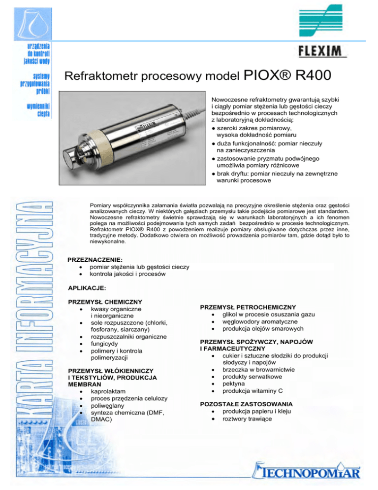 Refraktometr procesowy model PIOX® R400 Nowoczesne refraktometry gwarantują szybki i ciągły pomiar stężenia lub gęstości cieczy bezpośrednio w procesach technologicznych z laboratoryjną dokładnością: ● szeroki zakres pomiarowy, wysoka dokładność pomiaru ● duża funkcjonalność: pomiar nieczuły na zanieczyszczenia ● zastosowanie pryzmatu podwójnego umożliwia pomiary różnicowe ● brak dryftu: pomiar nieczuły na zewnętrzne warunki procesowe Pomiary współczynnika załamania światła pozwalają na precyzyjne określenie stężenia oraz gęstości analizowanych cieczy. W niektórych gałęziach przemysłu takie podejście pomiarowe jest standardem. Nowoczesne refraktometry świetnie sprawdzają się w warunkach laboratoryjnych a ich fenomen polega na możliwości podejmowania tych samych zadań bezpośrednio w procesie technologicznym. Refraktometr PIOX® R400 z powodzeniem realizuje pomiary obsługiwane dotychczas przez inne, tradycyjne metody. Dodatkowo otwiera on możliwość prowadzenia pomiarów tam, gdzie dotąd było to niewykonalne. PRZEZNACZENIE: • pomiar stężenia lub gęstości cieczy • kontrola jakości i procesów APLIKACJE: PRZEMYSŁ CHEMICZNY • kwasy organiczne i nieorganiczne • sole rozpuszczone (chlorki, fosforany, siarczany) • rozpuszczalniki organiczne • fungicydy • polimery i kontrola polimeryzacji PRZEMYSŁ WŁÓKIENNICZY I TEKSTYLIÓW, PRODUKCJA MEMBRAN • kaprolaktam • proces przędzenia celulozy • poliwęglany • synteza chemiczna (DMF, DMAC) PRZEMYSŁ PETROCHEMICZNY • glikol w procesie osuszania gazu • węglowodory aromatyczne • produkcja olejów smarowych PRZEMYSŁ SPOŻYWCZY, NAPOJÓW I FARMACEUTYCZNY • cukier i sztuczne słodziki do produkcji słodyczy i napojów • brzeczka w browarnictwie • produkty serwatkowe • pektyna • produkcja witaminy C POZOSTAŁE ZASTOSOWANIA • produkcja papieru i kleju • roztwory trawiące OGÓLNA SPECYFIKACJA Czujnik • • • • • • • • • odpowiedni dobór materiału czujnika pozwala sprostać wszystkim wymaganiom stawianym przez proces stabilność zera oraz brak podatności na dryft temperaturowy dzięki pomiarowi różnicowemu dwóch wiązek światła generowanych na podwójnym pryzmacie jeden typ czujnika dla różnych cieczy, stała dokładność w szerokim zakresie współczynnika refrakcji możliwość szybkiej kompensacji temperatury dzięki zintegrowanemu czujnikowi Pt1000 system auto-diagnostyki (szybkie wykrywanie i eliminacja błędów) optyka szafirowa pozwala na pomiary CECHY: w trudnych warunkach (duża odporność • Optyka szafirowa zapewnia wysoką mechaniczna i chemiczna) odporność chemiczną i mechaniczną zwarta konstrukcja czujnika oraz izolacja • Dostępne wersje przeznaczone do termiczna części elektronicznej pracy w strefie zagrożonej wybuchem kompatybilność z typowymi przyłączami • Zintegrowany czujnik temperatury procesowymi umożliwia montaż Pt1000 w różnego rodzaju rurach i zbiornikach • System auto-diagnostyki (temperatura dostępne wersje czujnika do strefy czujnika, amplituda sygnału, wilgotność zagrożonej wybuchem (ATEX, strefy 0/1) czujnika) Przetwornik • CECHY: • Elastyczna konfiguracja wejść i wyjść • Wyjście pomiarowe odpowiadające skali użytkownika • Wyjścia dla wartości mierzonych i diagnostycznych • Możliwość jednoczesnego podpięcia dwóch czujników możliwość indywidualnego ustawienia parametrów wyjściowych istotnych dla sterowania procesem • łatwa obróbka i analiza danych dotyczących mierzonej cieczy w dołączonym programie • domyślną skalą pomiarową przechowywaną w przetworniku jest skala Brix, istnieje możliwość zdefiniowania własnej skali • możliwość pomiaru trzyskładnikowych mieszanin z wykorzystaniem dodatkowych parametrów • możliwość dołączenia rejestratora danych z wbudowaną kartą pamięci Oprogramowanie RMKoeff • prosty interfejs użytkownika • pojemna wewnętrzna baza danych powszechnie stosowanych cieczy z możliwością wygodnej edycji i zarządzania • automatyczne generowanie charakterystyk z zestawów danych i tabel • parametry procesu i jednostki miar są definiowane przez użytkownika • proste i szybkie przesyłanie danych poprzez port szeregowy RS232 lub USB • zgodność ze wszystkimi wersjami systemu WindowsTM Zasada pomiaru Refraktometria - jest niezawodną metodą pomiarową parametrów fizykochemicznych substancji na podstawie ich współczynników załamania światła. Źródłem światła w czujniku jest specjalna dioda LED o długości fali =ג590 nm. Wiązka światła, po przejściu przez szczelinę i soczewkę, zostaje odwrócona na pryzmacie Dove. Następnie przechodzi przez analizowaną ciecz i wraca do wnętrza czujnika, gdzie zostaje podzielona na dwie wiązki i ulega załamaniu na krawędzi bipryzmatu. Wiązki światła generują obraz dwóch pików na matrycy CCD. Współczynnik załamania światła zostaje wyznaczony z różnicy ich odległości. Zmierzony w ten sposób współczynnik zostaje następnie przeliczony na wartość stężenia (gęstości). DANE TECHNICZNE Zasada pomiaru Wielkości mierzone Dodatkowe parametry diagnostyczne Dokładność Powtarzalność Rozdzielczość Czujnik Stopień ochrony obudowy Temperatura pracy Ochrona przeciwwybuchowa Przyłącza procesowe Refraktometria światła przechodzącego Współczynnik załamania światła, współczynnik załamania światła z kompensacją temperatury, temperatura cieczy, °Brix, %mas, inne parametry możliwe do ustawienia w programie RMKoeff Amplituda sygnału, temperatura czujnika, wilgotność czujnika nD: 0.0002 odpowiada 0.1°Brix, typowo 0.1%wag. nD: 0.00002 odpowiada 0.01 °Brix, typowo 0.01%wag. nD: 0.000001 IP 67 Temperatura cieczy: -20 do +150 °C; wersja ATEX, strefa 0 do 2: -20 do +130 °C Temperatura otoczenia: -20 do +60 °C Czujniki dostępne są w wersjach przeznaczonych do strefy zagrożonej wybuchem (ATE
