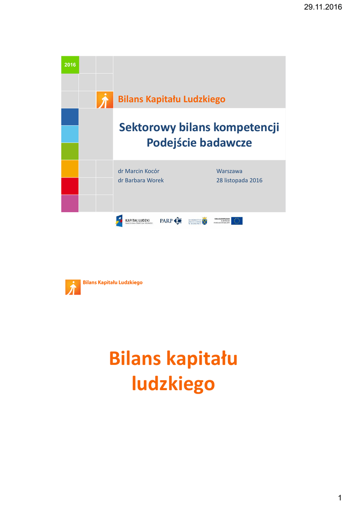29.11.2016 2016 Bilans Kapitału Ludzkiego Sektorowy bilans kompetencji Podejście badawcze dr Marcin Kocór dr Barbara Worek Warszawa 28 listopada 2016 Bilans kapitału ludzkiego 1 29.11.2016 Bilans kapitału ludzkiego Projekt Bilans kapitału ludzkiego został zrealizowany w latach 2010-2014 i był pierwszym tak kompleksowym badaniem rynku pracy w Polsce: badanie ludności – 85 000 wywiadów w 5 edycjach badanie pracodawców – 80 000 wywiadów w 5 edycjach analiza ofert pracy – 100 000 ofert w 5 edycjach badanie firm instytucji szkoleniowych – 22 500 wywiadów w 5 edycjach badanie uczniów i studentów – po 64 000 wywiadów w 1 i 4 edycji badań Bilans kapitału ludzkiego Głównym celem projektu było zidentyfikowanie potrzeb zatrudnieniowych i kompetencyjnych polskich pracodawców a poprzez porównanie z dostępnymi oraz potencjalnymi zasobami wskazanie obszarów luk i niedopasowania na rynku pracy. Innymi celami badań było: analiza aktywności edukacyjnej Polaków określenie strategii szkoleniowych pracodawców analiza rynku szkoleniowego analiza relacji pomiędzy rolami rodzinnymi i zawodowymi Polaków 2 29.11.2016 BKL: Klasyfikacja kompetencji ogólnych Treść kompetencji KOG Wyszukiwanie i analiza informacji oraz wyciąganie wniosków MAT Wykonywanie obliczeń KOM Obsługa komputera i wykorzystanie internetu BIU Organizowanie i prowadzenie prac biurowych LUD Kontakty z innymi ludźmi SAM Samoorganizacja pracy i przejawianie inicjatywy terminowość KIE Zdolności kierownicze i organizacja pracy ART Zdolności artystyczne i twórcze TCH Obsługa montowanie i naprawa urządzeń FIZ Sprawność fizyczna DYS Dyspozycyjność BKL: Klasyfikacja kompetencji ogólnych Treść kompetencji KOG Wyszukiwanie i analiza informacji oraz wyciąganie wniosków MAT Wykonywanie obliczeń szybkie streszczanie dużej ilości tekstu KOM Obsługa komputera i wykorzystanie internetu logiczne myślenie analiza faktów BIU Organizowanie i prowadzenie prac biurowych ciągłezuczenie się nowych rzeczy LUD Kontakty innymi ludźmi SAM Samoorganizacja pracy i przejawianie inicjatywy terminowość KIE Zdolności kierownicze i organizacja pracy ART Zdolności artystyczne i twórcze TCH Obsługa montowanie i naprawa urządzeń FIZ Sprawność fizyczna DYS Dyspozycyjność 3 29.11.2016 BKL: Wymagania kompetencyjne (spontaniczne) Samoorganiz. Zawodowe Interpersonalne Kognitywne Techniczne Komputerowe Dyspozycyjne Kwalifikacje Fizyczne Językowe Biurowe Kierownicze Inne Artystyczne Matematyczne N 2010 42 45 38 11 6 16 5 9 6 6 4 4 9 2 2 3271 2011 50 38 45 8 9 8 9 11 6 7 5 2 10 1 2 3337 2012 53 42 41 12 11 11 10 9 10 8 5 1 6 2 1 3106 2013 57 39 39 12 10 10 7 9 7 6 6 2 5 1 2 2489 2014 53 38 36 12 11 10 8 8 7 6 5 4 3 2 1 2956 Bez względu na zawód do jakiego poszukiwano pracowników w ciągu 5 lat badań w sposób spontaniczny podkreślano wagę kompetencji: samoorganizacyjnych – umiejętności: zarządzania czasem samodzielność podejmowanie decyzji i przejawianie inicjatywy odporność na stres i chęć do pracy; zawodowych – specyficzne umiejętności niezbędne do wykonywania zadań właściwych dla danego stanowiska pracy; Interpersonalnych – umiejętność kontaktowania się z ludźmi bycia komunikatywnym współpracy w grupie a także rozwiązywania konfliktów międzyludzkich. Bilans kapitału ludzkiego (2016-2023) 4 29.11.2016 BKL 2016-2023: Plan badań luty-maj 2017 luty-maj 2018 2019 Badania przekrojowe Badania śródokresowe Badania przekrojowe Pracodawcy Pracodawcy 3500 1000 (panel) Pracodawcy 2500 1000 (panel) 2020 Badania śródokresowe Pracodawcy 1000 (panel) luty-maj 2021 2022 Badania przekrojowe Badania śródokresowe Pracodawcy 2500 1000 (panel) Pracodawcy 1000 (panel) Ludność Ludność Ludność Ludność Ludność Ludność 4000 1500 - panel 2500 1500 (panel) 2900 1500 - panel Instytucje szkoleniowe 1000 1500 (panel) 1500 (panel) Instytucje szkoleniowe Instytucje szkoleniowe 1000 (panel) 1000 (panel) Sektorowy bilans kompetencji 5 29.11.2016 Sektorowy bilans kompetencji: założenia Celem jest stworzenie bilansu dla kompetencji zawodowych dla określonego sektora ale również kluczowych stanowisk w tym sektorze. Aby to osiągnąć stosowane jest mieszane podejście jakościowo-ilościowe obejmujące: analizę danych zastanych (oferty pracy raporty wyniki BKL) wywiady pogłębione z ekspertami z branży (pracodawcy przedstawiciele stowarzyszeń branżowych) przedstawicielami szkół i uczelni badania ilościowe weryfikujące profile kompetencji i odpowiadające im efekty kształcenia – wywiady z pracodawcami i przedstawicielami szkół i uczelni oraz uczniami i studentami Sektorowy bilans kompetencji: podejście badawcze POPYT: PODAŻ: Działania wstępne: wywiady z ekspertami analiza ogłoszeń o pracę analiza raportów branżowych Działania wstępne: opracowanie oczekiwanych efektów kształcenia wywiady z ekspertami Stworzenie listy procesów biznesowych w branży (w podziale na główne i pomocnicze): weryfikacja w trakcie IDI z ekspertami Wywiady standaryzowane: przedstawiciele wybranych profili szkół ponadgimnazjalnych i kierunków uczelni wyższych + uczniowie i studenci Stworzenie listy zadań zawodowych i odpowiadających im stanowisk pracy: weryfikacja w trakcie IDI z ekspertami Opracowanie profili kompetencyjnych odpowiadającym tym stanowiskom: weryfikacja w trakcie IDI z ekspertami Wywiady standaryzowane: osoby zarządzające firmami działy personalne menadżerowie 6 29.11.2016 Sektorowy bilans kompetencji: etapy Analiza sytuacji w branży Analiza procesów biznesowych Kluczowe stanowiska • Zapotrzebowanie na zawody i kompetencje • Trendy • Lista kluczowych procesów biznesowych • Lista zadań zawodowych i kluczowych stanowisk niezbędnych do wykonywania procesów biznesowych Profile kompetencji • Profile kompetencji dla kluczowych stanowisk: wiedza i umiejętności specjalistyczne, wiedza i umiejętności biznesowe, uprawnienia i kursy Bilans k