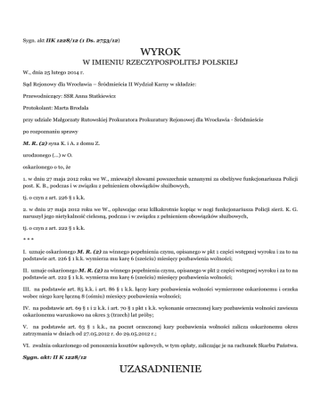 Sygn. akt IIK 1228/12 (1 Ds. 2753/12) WYROK W IMIENIU RZECZYPOSPOLITEJ POLSKIEJ W., dnia 25 lutego 2014 r. Sąd Rejonowy dla Wrocławia – Śródmieścia II Wydział Karny w składzie: Przewodniczący: SSR Anna Statkiewicz Protokolant: Marta Brodala przy udziale Małgorzaty Rutowskiej Prokuratora Prokuratury Rejonowej dla Wrocławia - Śródmieście po rozpoznaniu sprawy M. R. (2) syna K. i A. z domu Z. urodzonego (...) w O. oskarżonego o to, że 1. w dniu 27 maja 2012 roku we W., znieważył słowami powszechnie uznanymi za obelżywe funkcjonariusza Policji post. K. B., podczas i w związku z pełnieniem obowiązków służbowych, tj. o czyn z art. 226 § 1 k.k. 2. w dniu 27 maja 2012 roku we W., opluwając oraz kilkakrotnie kopiąc w nogi funkcjonariusza Policji sierż. K. G. naruszył jego nietykalność cielesną, podczas i w związku z pełnieniem obowiązków służbowych, tj. o czyn z art. 222 § 1 k.k. *** I. uznaje oskarżonego M. R. (2) za winnego popełnienia czynu, opisanego w pkt 1 części wstępnej wyroku i za to na podstawie art. 226 § 1 k.k. wymierza mu karę 6 (sześciu) miesięcy pozbawienia wolności; II. uznaje oskarżonego M. R. (2) za winnego popełnienia czynu, opisanego w pkt 2 części wstępnej wyroku i za to na podstawie art. 222 § 1 k.k. wymierza mu karę 6 (sześciu) miesięcy pozbawienia wolności; III. na podstawie art. 85 k.k. i art. 86 § 1 k.k. łączy kary pozbawienia wolności wymierzone oskarżonemu i orzeka wobec niego karę łączną 8 (ośmiu) miesięcy pozbawienia wolności; IV. na podstawie art. 69 § 1 i 2 k.k. i art. 70 § 1 pkt 1 k.k. wykonanie orzeczonej kary pozbawienia wolności zawiesza oskarżonemu warunkowo na okres 3 (trzech) lat próby; V. na podstawie art. 63 § 1 k.k., na poczet orzeczonej kary pozbawienia wolności zalicza oskarżonemu okres zatrzymania w dniach od 27.05.2012 r. do 29.05.2012 r.; VI. zwalnia oskarżonego od ponoszenia kosztów sądowych, w tym opłaty, zaliczając je na rachunek Skarbu Państwa. Sygn. akt: II K 1228/12 UZASADNIENIE W sprawie Sąd ustalił następujący stan faktyczny: W dniu 27 maja 2012 roku około godziny 18.00, na polecenie oficera dyżurnego K. W., pokrzywdzeni, tj. sierż. K. G. oraz post. K. B. udali się na ul. (...) gdzie miała mieć miejsce awantura w sklepie. Zgłaszającą była M. M., która oświadczyła, że do jej sklepu przyszedł nietrzeźwy mężczyzna, który zaczął się awanturować, gdyż nie chciała mu sprzedać piwa. Mężczyzna ten groził jej, wyzywał, a następnie wyszedł ze sklepu. Według opisu M. M. mężczyzna ten ubrany był w szarą bluzę, spodnie ¾ i miał ze sobą psa rasy husky. Dowód: - zeznania pokrzywdzonego K. G. (k. 6) - zeznania pokrzywdzonego K. B. (k. 10) - częściowo wyjaśnienia oskarżonego (k. 19) W trakcie penetracji terenu przy (...), przy brzegu O., funkcjonariusze zauważyli mężczyznę odpowiadającemu rysopisowi M. M.. Pokrzywdzeni podeszli do niego i go wylegitymowali. W tym momencie mężczyzna ten powiedział do post. K. B.„ty pało do lania czego ode mnie chcesz ch…u, wal się szmato”. Mężczyzna ten nie chciał podporządkować się wydawanym poleceniom. Wobec tego, w stosunku do oskarżonego, zostały zastosowane chwyty obezwładniające i kajdanki. Z uwagi na powyższy fakt, bacząc na to, iż mężczyzna znajdował się pod wpływem alkoholu, swoim zachowaniem stwarzał zagrożenie dla życia i zdrowia swojego oraz innych osób, pokrzywdzeni podjęli decyzję o przewiezieniu go do Izby Wytrzeźwień. Dowód: - zeznania pokrzywdzonego K. G. (k. 6) - zeznania pokrzywdzonego K. B. (k. 10) - protokół doprowadzenia osoby w celu wytrzeźwienia z 27/05/2012 (k. 2) Z uwagi na to, iż oskarżony nie miał wówczas przy sobie żadnych dokumentów, pokrzywdzeni udali się z nim do miejsca jego zamieszkania, gdzie matka oskarżonego – A. R. potwierdziła jego tożsamość. Kobiecie został również przekazany pies należący do oskarżonego. Dowód: - zeznania pokrzywdzonego K. G. (k. 6) - zeznania pokrzywdzonego K. B. (k. 10) - wyjaśnienia oskarżonego (k. 19) - zeznania matki oskarżonego – A. R. (k. 72) W trakcie dojazdu na Izbę Wytrzeźwień oskarżony próbował uderzyć pokrzywdzonego K. G., a następnie w czasie oczekiwania na przyjęcie oskarżony opluł ww. pokrzywdzonego oraz kilkakrotnie kopnął go w nogi – czym naruszył nietykalność pokrzywdzonego K. G.. Pokrzywdzony ten nie odniósł jednak żadnych obrażeń w związku z zachowaniem oskarżonego, nie korzystał również z pomocy lekarza. Nietykalność pokrzywdzonego K. B. nie została naruszona, pokrzywdzony ten nie odniósł również żadnych obrażeń w związku z tą interwencją. Dowód: - zeznania pokrzywdzonego K. G. (k. 6) - zeznania pokrzywdzonego K. B. (k. 10) Zgodnie z przeprowadzonym badaniem na zawartość alkoholu oskarżony w chwili zatrzymania miał 1,29 mg/l alkoholu w wydychanym powietrzu Dowód: - zeznania pokrzywdzonego K. G. (k. 6) - zeznania pokrzywdzonego K. B. (k. 10) Oskarżony M. R. (2) (syn K. i A. z d. Z.) urodził się w dniu (...) w O.. Zamieszkały we W. przy ul. (...). Posiada wykształcenie gimnazjalne. Zatrudniony jest w firmie (...) na stanowisku zbrojarza, z czego osiąga dochody ok. 1500 zł miesięcznie. Oskarżony jest kawalerem. Nie ma nikogo na utrzymaniu. Nie posiada majątku. Był już karany sądownie za występki z art. 278 § 1 k.k. oraz art. 278 § 3 k.k.. Dowód: - protokół przesłuchania podejrzanego (k. 17) - informacja o osobie z Krajowego Rejestru Karnego (k. 23) Oskarżony w trakcie składania wyjaśnień nie przyznał się do zarzucanych mu czynów. W toku rozprawy głównej oskarżony po przedstawieniu mu zarzutu stwierdził, iż jego treść zrozumiał i że raczej nie przyznaje się do jego popełnienia. Oskarżony wyjaśnił jednak, iż kojarzy całe zajście związane ze sprzedawczynią aczkolwiek z uwagi na stan upojenia alkoholowego nie przypomina sobie niektórych rzeczy. Podobnie w pr