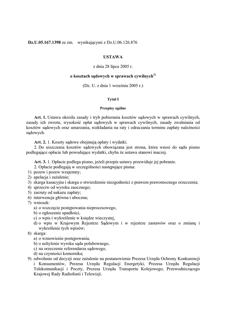 Dz.U.05.167.1398 ze zm. wynikającymi z Dz.U.06.126.876 USTAWA z dnia 28 lipca 2005 r. o kosztach sądowych w sprawach cywilnych1) (Dz. U. z dnia 1 września 2005 r.) Tytuł I Przepisy ogólne Art. 1. Ustawa określa zasady i tryb pobierania kosztów sądowych w sprawach cywilnych, zasady ich zwrotu, wysokość opłat sądowych w sprawach cywilnych, zasady zwalniania od kosztów sądowych oraz umarzania, rozkładania na raty i odraczania terminu zapłaty należności sądowych. Art. 2. 1. Koszty sądowe obejmują opłaty i wydatki. 2. Do uiszczenia kosztów sądowych obowiązana jest strona, która wnosi do sądu pismo podlegające opłacie lub powodujące wydatki, chyba że ustawa stanowi inaczej. 1) 2) 3) 4) 5) 6) 7) 8) 9) Art. 3. 1. Opłacie podlega pismo, jeżeli przepis ustawy przewiduje jej pobranie. 2. Opłacie podlegają w szczególności następujące pisma: pozew i pozew wzajemny; apelacja i zażalenie; skarga kasacyjna i skarga o stwierdzenie niezgodności z prawem prawomocnego orzeczenia; sprzeciw od wyroku zaocznego; zarzuty od nakazu zapłaty; interwencja główna i uboczna; wniosek: a) o wszczęcie postępowania nieprocesowego, b) o ogłoszenie upadłości, c) o wpis i wykreślenie w księdze wieczystej, d) o wpis w Krajowym Rejestrze Sądowym i w rejestrze zastawów oraz o zmianę i wykreślenie tych wpisów; skarga: a) o wznowienie postępowania, b) o uchylenie wyroku sądu polubownego, c) na orzeczenie referendarza sądowego, d) na czynności komornika; odwołanie od decyzji oraz zażalenie na postanowienie Prezesa Urzędu Ochrony Konkurencji i Konsumentów, Prezesa Urzędu Regulacji Energetyki, Prezesa Urzędu Regulacji Telekomunikacji i Poczty, Prezesa Urzędu Transportu Kolejowego, Przewodniczącego Krajowej Rady Radiofonii i Telewizji. 3. Opłacie podlega wniosek o wydanie na podstawie akt: odpisu, wypisu, zaświadczenia, wyciągu, innego dokumentu oraz kopii, a nadto wniosek o wydanie odpisu księgi wieczystej (opłata kancelaryjna). Art. 4. 1. Pismo wnoszone przez kilka osób podlega jednej opłacie. Jeżeli jednak przedmiotem sprawy są roszczenia lub zobowiązania jednego rodzaju i oparte na jednakowej podstawie faktycznej i prawnej (współuczestnictwo formalne), każdy współuczestnik uiszcza opłatę oddzielnie, stosownie do swojego roszczenia lub zobowiązania. 2. Opłatę od wniosku o dokonanie wpisu w księdze wieczystej pobiera się od osoby, która wystąpiła z takim wnioskiem, także wówczas, gdy na jego podstawie mają być ujawnione prawa osób, które nie są wnioskodawcami. 3. Nie pobiera się opłaty od wniosku o sporządzenie uzasadnienia oraz doręczenie odpisu orzeczenia z uzasadnieniem, zgłoszonego w terminie tygodniowym od dnia ogłoszenia sentencji. 1) 2) 3) 4) 5) 6) 7) 8) 9) Art. 5. 1. Wydatki obejmują w szczególności: koszty podróży strony zwolnionej od kosztów sądowych związane z nakazanym przez sąd jej osobistym stawiennictwem; zwrot kosztów podróży i noclegu oraz utraconych zarobków lub dochodów świadków; wynagrodzenie i zwrot kosztów poniesionych przez biegłych, tłumaczy oraz kuratorów ustanowionych dla strony w danej sprawie; wynagrodzenie należne innym osobom lub instytucjom oraz zwrot poniesionych przez nie kosztów; koszty przeprowadzenia innych dowodów; koszty przewozu zwierząt i rzeczy, utrzymywania ich lub przechowywania; koszty ogłoszeń; koszty osadzenia i pobytu w areszcie; ryczałty należne kuratorom sądowym za przeprowadzenie wywiadu środowiskowego w sprawach: o unieważnienie małżeństwa, o rozwód oraz separację, a także za uczestniczenie przy ustalonych przez sąd kontaktach rodziców z dziećmi. 2. Wydatki związane z doręczaniem pism sądowych nie obciążają stron. 3. Wydatki związane ze zwrotem opłat nie obciążają stron. Art. 6. Koszty mediacji nie stanowią wydatków. Art. 7. 1. Stroną w rozumieniu ustawy jest każdy uczestnik postępowania sądowego, w tym także świadek, biegły i tłumacz, a kosztami procesu są również koszty innych rodzajów postępowania. 2. Przez pismo wnoszone do sądu rozumie się również składany ustnie do protokołu pozew, wniosek wszczynający innego rodzaju postępowanie lub inny wniosek, jeżeli podlega opłacie. Art. 8. 1. W postępowaniu dotyczącym kosztów sądowych stosuje się przepisy Kodeksu postępowania cywilnego, chyba że ustawa stanowi inaczej. 2. Postanowienie sądu lub referendarza sądowego w przedmiocie kosztów sądowych może być wydane na posiedzeniu niejawnym. Art. 9. Minister Sprawiedliwości określi, w drodze rozporządzenia: 1) sposób uiszczania opłat sądowych w sprawach cywilnych, w tym wnoszonych na rachunek bankowy sądu lub w formie znaków opłaty sądowej według ustalonego wzoru, mając na względzie łatwość uiszczenia opłat przez strony oraz skutek w postaci zwrotu lub odrzucenia pisma, od którego przy jego wniesieniu nie została uiszczona należna opłata; 2) wzór oświadczenia o stanie rodzinnym, majątku, dochodach i źródłach utrzymania, o którym mowa w art. 102 ust. 2, a także sposób udostępniania osobom fizycznym wzoru druków tych oświadczeń w siedzibach sądów, mając na względzie komunikatywność niezbędnych pouczeń dla stron co do sposobu wypełnienia, skutków niezłożenia lub złożenia nieprawdziwego oświadczenia; 3) wysokość wynagrodzenia i zwrot wydatków poniesionych przez biegłych, kuratorów ustanowionych dla strony w danej sprawie oraz innych osób i instytucji, mając na względzie nakład pracy i kwalifikacje niezbędne do wykonywania zleconych przez sąd czynności oraz poziom wynagrodzeń uzyskiwanych przez pracowników wykonujących podobne zawody. Tytuł II Opłaty DZIAŁ 1 PRZEPISY OGÓLNE Art. 10. Opłatę należy uiścić przy wniesieniu do sądu pisma podlegającego opłacie. Art. 11. Opłata jest stała, stosunkowa albo podstawowa. Art. 12. Opłatę stałą pobiera się w sprawach o prawa niemajątkowe oraz we wskazanych w ustawie niektórych spraw