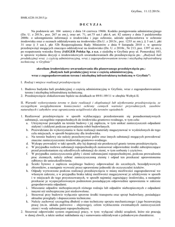 Gryfino, 11.12.2015r. BMK.6220.10.2015.jc DECYZJA Na podstawie art. 104 ustawy z dnia 14 czerwca 1960r. Kodeks postępowania administracyjnego (Dz. U. z 2013r., poz. 267 ze zm.), oraz art. 71, art.75 ust.1 pkt.4, art. 82 ustawy z dnia 3 października 2008r. o udostępnieniu informacji o środowisku i jego ochronie, udziale społeczeństwa w ochronie środowiska oraz o ocenach oddziaływania na środowisko (Dz.U. z 2013r., poz. 1235 ze zm.), § 3 ust.1, pkt 31 oraz § 3 ust.1, pkt 52b Rozporządzenia Rady Ministrów z dnia 9 listopada 2010 r. w sprawie przedsięwzięć mogących znacząco oddziaływać na środowisko (Dz. U. z 2010r., Nr 213, poz. 1397 ze zm.), po rozpatrzeniu wniosku firmy JAEGER Polska Sp. z o.o. z siedzibą w Gryfinie przy ul. Pomorskiej 103, w sprawie wydania decyzji o środowiskowych uwarunkowaniach dla przedsięwzięcia pn.: „Budynek hali produkcyjnej wraz z częścią administracyjną, wraz z zagospodarowaniem terenu i niezbędną infrastrukturą techniczną w Gryfinie” określam środowiskowe uwarunkowania dla planowanego przedsięwzięcia pn.: „Budynek hali produkcyjnej wraz z częścią administracyjną, wraz z zagospodarowaniem terenu i niezbędną infrastrukturą techniczną w Gryfinie”: I. Rodzaj i miejsce realizacji przedsięwzięcia: 1. Budowa budynku hali produkcyjnej z częścią administracyjną w Gryfinie, wraz z zagospodarowaniem terenu i niezbędną infrastrukturą techniczną; 2. Przedsięwzięcie zlokalizowane będzie na działkach nr 89/8 i 89/11 w obrębie Wełtyń II. II. Warunki wykorzystania terenu w fazie realizacji i eksploatacji lub użytkowania przedsięwzięcia, ze szczególnym uwzględnieniem konieczności ochrony cennych wartości przyrodniczych, zasobów naturalnych i zabytków oraz ograniczenia uciążliwości dla terenów sąsiednich: 1. Realizować przedsięwzięcie w sposób wykluczający przedostawanie się ponadnormatywnych substancji, szczególnie ropopochodnych do środowiska gruntowo-wodnego, w tym celu: a. Utrzymywać porządek na terenie budowy i jej zaplecza, w tym unikać zanieczyszczeń odpadami stałymi i ciekłymi podczas prowadzenia robót budowlanych. b. Przewidziane do wykorzystania w fazie realizacji materiały magazynować w wydzielonych do tego celu miejscach, w sposób bezpieczny dla środowiska. c. Na terenie budowy nie należy przechowywać paliw oraz innych substancji mogących powodować znaczne zanieczyszczenie środowiska gruntowo-wodnego. d. Wykopy prowadzić w taki sposób, aby lej depresji nie przekroczył granic terenu przedsięwzięcia. e. W przypadku rozlewu substancji ropopochodnych zastosować odpowiednie środki zabezpieczające przed przedostaniem się szkodliwych substancji do ziemi, w tym sorbenty i czyściwo. f. W przypadku zanieczyszczenia gleby i ziemi substancjami ropopochodnymi, podczas prowadzenia prac ziemnych, należy zebrać zanieczyszczoną ziemię i odpad ten przekazać uprawnionemu odbiorcy do unieszkodliwienia. g. Ścieki bytowe z zaplecza socjalnego budowy odprowadzać do szczelnych, bezodpływowych zbiorników, a następnie wywozić przez uprawnione jednostki do oczyszczalni ścieków. h. Odpady wytworzone podczas realizacji przedsięwzięcia w miarę możliwości zagospodarować we własnym zakresie, a w przypadku braku takiej możliwości magazynować je selektywnie w sposób i w miejscach do tego przystosowanych, w sposób najmniej zagrażający środowisku, a następnie przekazać je wyspecjalizowanym podmiotom posiadającym odpowiednie uprawnienia w zakresie gospodarowania odpadami. i. Mieszanie odpadów niebezpiecznych różnego rodzaju lub odpadów niebezpiecznych z odpadami innymi niż niebezpieczne jest niedozwolone. j. Stosować przy budowie wyłącznie sprawne środki transportu oraz sprzęt budowlany, posiadające aktualne przeglądy i dopuszczenia techniczne. k. Należy zachować szczególną dbałość o stan techniczny sprzętu mechanicznego i jego bezawaryjną pracę (m.in. układu paliwowo - olejowego), celem wykluczenia ewentualnych zanieczyszczeń ziemi i wody substancjami ropopochodnymi. 2. Stosować odpowiedni system organizacji pracy, w tym: wyłączać silniki urządzeń, które nie pracują w danej chwili, a także unikać nakładania się i sumowania oddziaływań o jednakowym charakterze. 1 3. W celu ograniczenia pylenia: zmniejszać prędkość jazdy maszyn budowlanych i samochodów na terenie budowy, zwłaszcza w przypadku poruszania się tych pojazdów po powierzchniach nieutwardzonych, zachować ostrożność przy transporcie, załadunku i rozładunku materiałów o charakterze sypkim (np. przykrywać plandekami załadowane skrzynie), w razie potrzeby zraszać wodą plac budowy w celu ograniczenia pylenia wtórnego z terenu budowy, zapewnić poruszanie się pojazdów transportowych dowożących materiały i surowce oraz wywożące odpady z budowy wyłącznie po utwardzonych drogach, aby ograniczyć pylenie z nawierzchni. 4. Wszelkie prace z zastosowaniem sprzętu i urządzeń o wysokim poziomie mocy akustycznej prowadzić w porze dziennej (6.00-22.00), ograniczając ich pracę w godzinach wieczornych. 5. Eksploatacja urządzeń i maszyn powinna odbywać się w sposób zgodny z zaleceniem producenta, tak aby minimalizować poziom emitowanego hałasu. 6. Zaplecze budowy zlokalizować w oddaleniu od terenów chronionych akustycznie. 7. W zakresie ochrony warunków przyrodniczych: a. Podczas realizacji przedsięwzięcia nie naruszać powierzchni gruntów poza terenem wyznaczonym do prowadzenia prac, w tym zorganizować plac budowy i jego zaplecze w sposób nieingerujący w sąsiadujące z działkami inwestycyjnymi tereny leśne. b. Prace ziemne poprzedzić usunięciem wierzchniej warstwy gleby, gromadząc ją poza obszarem robót ziemnych i zapewnić możliwość jej ponownego wykorzystania do tworzenia warstwy urodzajnej na późniejszych etapach realizacji lub możliwość jej wykorzystania przez inne podmioty. c. Nie należy dopuszczać do skła