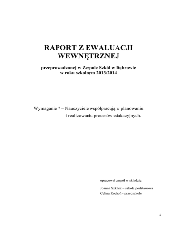 RAPORT Z EWALUACJI WEWNĘTRZNEJ przeprowadzonej w Zespole Szkół w Dąbrowie w roku szkolnym 2013/2014 Wymaganie 7 – Nauczyciele współpracują w planowaniu i realizowaniu procesów edukacyjnych. opracował zespół w składzie: Joanna Szklarz – szkoła podstawowa Celina Rodzoń - przedszkole 1 I. Opis ewaluowanego obszaru Cel ewaluacji: 1. Opis i ocena efektywności współdziałania nauczycieli w planowaniu i realizowaniu procesów edukacyjnych. Ustalenie: Co moglibyśmy zrobić, by usprawnić sposób i formy współpracy nauczycieli? Jak podnieść efektywność współdziałania? Co należy zmienić lub udoskonalić? WYMAGANIE Nauczyciele współpracują w planowaniu i realizowaniu procesów edukacyjnych. BADANE ASPEKTY EWALUOWANEGO OBSZARU: I. Współdziałanie nauczycieli w tworzeniu i analizie procesów edukacyjnych. II. Wykorzystanie współdziałania nauczycieli w doskonaleniu zachodzących procesów edukacyjnych. SZKOŁA PODSTAWOWA Informacje o populacji objętej badaniem W badaniu wzięło udział 9 nauczycieli. Odpowiadali oni na pytania dotyczące form i sposobów współpracy nauczycieli w planowaniu i realizowaniu procesów edukacyjnych oraz korzyści wypływających z tej współpracy. Sposób przeprowadzenia ewaluacji 1. Analiza dokumentów: Księga protokołów z posiedzeń Rady Pedagogicznej, Program wychowawczy szkoły, Księga zarządzeń, 2 Plany pracy zespołów, Plany działań wychowawczych klasy, Plany edukacyjne, Dzienniki zajęć lekcyjnych. 2. Ankieta dla: Nauczycieli Celem ankiety, która zawierała 8 pytań, było zebranie informacji na temat „Współpracy nauczycieli w planowaniu i realizowaniu procesów edukacyjnych". W ankiecie wzięło udział 9 nauczycieli, wszyscy stwierdzili, iż biorą udział w pracach różnych zespołów, współpracując ze sobą w planowaniu i realizowaniu procesów edukacyjnych.. 3. Wywiad z dyrektorem szkoły. Prezentacja wyników ewaluacji W ewaluacji dotyczącej pierwszego aspektu sprawdzono, jak przebiega: A. współpraca nauczycieli w planowaniu i realizowaniu procesów edukacyjnych, oraz jak przebiega B. współpraca nauczycieli w zakresie analizy procesów edukacyjnych. Do pierwszego problemu badawczego postawione zostały następujące pytania kluczowe: Jakie formy współpracy istnieją w szkole? Analizując dokumenty (Plan Pracy Szkoły, Program Wychowawczy, Księgę protokołów posiedzeń Rady Pedagogicznej) stwierdzono, że nauczyciele pracują w zespołach. Najczęstszymi formami współpracy jest praca w zespołach przedmiotowych np. matematyczno-przyrodniczym, czy nauczycieli klas I-III oraz w zespole do spraw Wewnątrzszkolnego Systemu Oceniania. Ponadto powołuje się komisje konkursowe, zespoły nauczycieli do organizacji uroczystości szkolnych, 3 zespoły do przeprowadzania szkoleń Rady Pedagogicznej w ramach wewnętrznego doskonalenia nauczycieli, zespoły do opracowania wyników po sprawdzianach próbnych w klasie VI oraz sprawdzianach wiadomości i umiejętności po klasie V, komisje do opracowywania wniosków na zebraniach podsumowujących pracę w danym semestrze. Przydziela się opiekunów organizacji szkolnych. Zespoły do realizacji zadań (tzw. zespoły zadaniowe) powołuje Dyrektor szkoły. Na pytanie ankietowe: W pracach jakich zespołów bierze Pan/Pani udział? – nauczyciele odpowiadali: - w zespołach przedmiotowych 8 osób tj. 88,9%, - w zespole ds. wewnątrzszkolnego systemu oceniania 8 osób tj. 88,9% - w zespole ds. ewaluacji wewnętrznej 7 osób tj. 77,8% , - w zespole ds. statutu szkoły 5 osób tj. 55,6% - w zespole ds. programu wychowawczego 4 osoby tj. 44,4%, - w zespole ds. analizy wyników sprawdzianów próbnych 3 osoby tj. 33,3% , - w zespole ds. pomocy psychologiczno-pedagogicznej 3 osoby tj. 33,3%, - w zespole ds. programu profilaktycznego 2 osoby tj. 22,2%, - w zespole ds. dokumentowania wydarzeń z życia szkoły 2 osoby tj. 22,2%. 4 Drugie pytanie ankietowe dotyczyło stopnia zaangażowania w pracę tych zespołów. Odpowiedzi przedstawiały się następująco: 44,4% nauczycieli wykazuje duże zaangażowanie 44,4% raczej duże, 11,1% raczej małe. Jakie formy współpracy preferują nauczyciele? Na powyższe pytanie nauczyciele udzielili odpowiedzi w ankiecie. Analizując odpowiedzi należy stwierdzić, iż nauczyciele preferują następujące formy współpracy: praca w małych grupach (2-3 osobowych), praca w zespołach zadaniowych i zespołach przedmiotowych, wymiana doświadczeń, rozmowa, dyskusja, korzystanie z pomocy, wycieczki, wyjazdy, akcje, imprezy szkolne, wspólne opracowywanie programów, dzielenie się obowiązkami. W jaki sposób nauczyciele współpracują w tworzeniu procesów edukacyjnych? W oparciu o przeprowadzoną analizę dokumentów ustalono, iż zespoły nauczycieli opracowują plany pracy na dany rok szkolny, ponadto planują różne konkursy przedmiotowe, opracowują regulaminy konkursów, powołują komisje konkursowe, wyłaniają zwycięzców. Na podstawie zapisów w dziennikach lekcyjnych należy stwierdzić, iż nauczyciele ustalają terminy prac klasowych tak, by się nie pokrywały. Nauczyciele tego samego przedmiotu często ujednolicają przedmiotowe systemy oceniania oraz wymagania edukacyjne, wspólnie ustalają kontrakty z uczniami. Różni nauczyciele wspólnie ustalają tematy zajęć dydaktycznych oraz wychowawczych. Nauczyciele przedmiotów podstawowych wspólnie organizują sprawdziany próbne dla szóstoklasistów oraz sprawdzian wiadomości i umiejętności po klasie piątej. Następnie dokonują analizy tych sprawdzianów. Do drugiego problemu badawczego postawiono pytanie kluczowe: W jaki sposób zespoły nauczycieli dokonują analizy wyników kształcenia? Z analizy ankiet wynika, iż nauczyciele dokonują analizy wyników kształcenia w następujący sposób: poprzez analizę sprawdzianu szóstoklasisty, sprawdzianów próbnych w klasie V i VI, diagnoz na starcie i po każdym etapie kształcenia, testy kompetencji, s